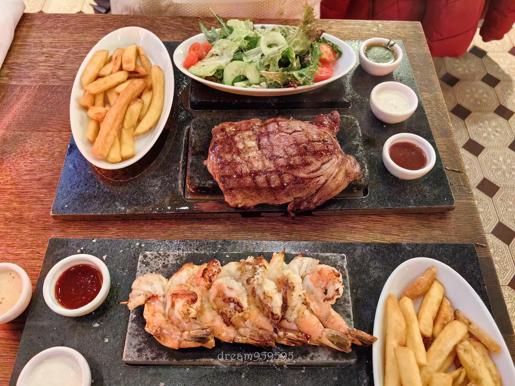起源于德国的连锁美式牛排餐厅,网评老好了,点了肉眼和菲力,配蒜香面包、烤土豆酸奶酱、蔬菜色拉。味道其实很一般,牛肉甚至有点老。