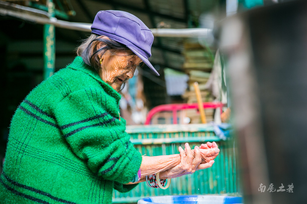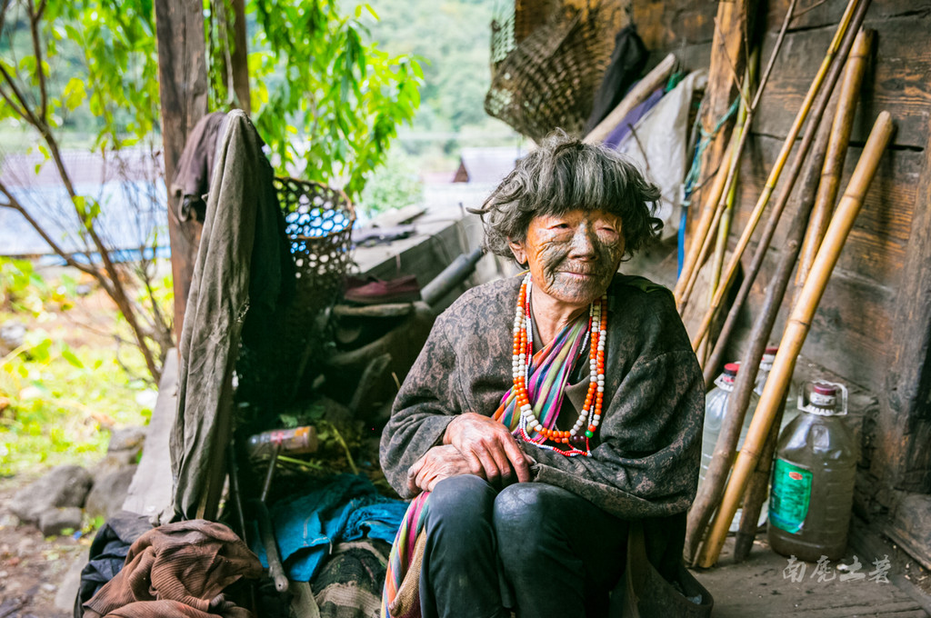 我们见到这位老人的时候她在洗手,看起来健硕很多,也很爱干净,据说当年是位土司的家属。独龙江上、下游面纹有较大的差异,不但面纹图案多种多样,而且面纹的部位也有较多的区别,从不同的面纹图案,当地人一眼就能看出这个妇女居住的地方,是某个部落。