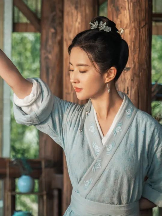 剧中赵盼儿的身份是一位茶馆老板,所以她的发型多以利落的妆发为主,简单系上丝带,非常贴合她干练老板的人设。
