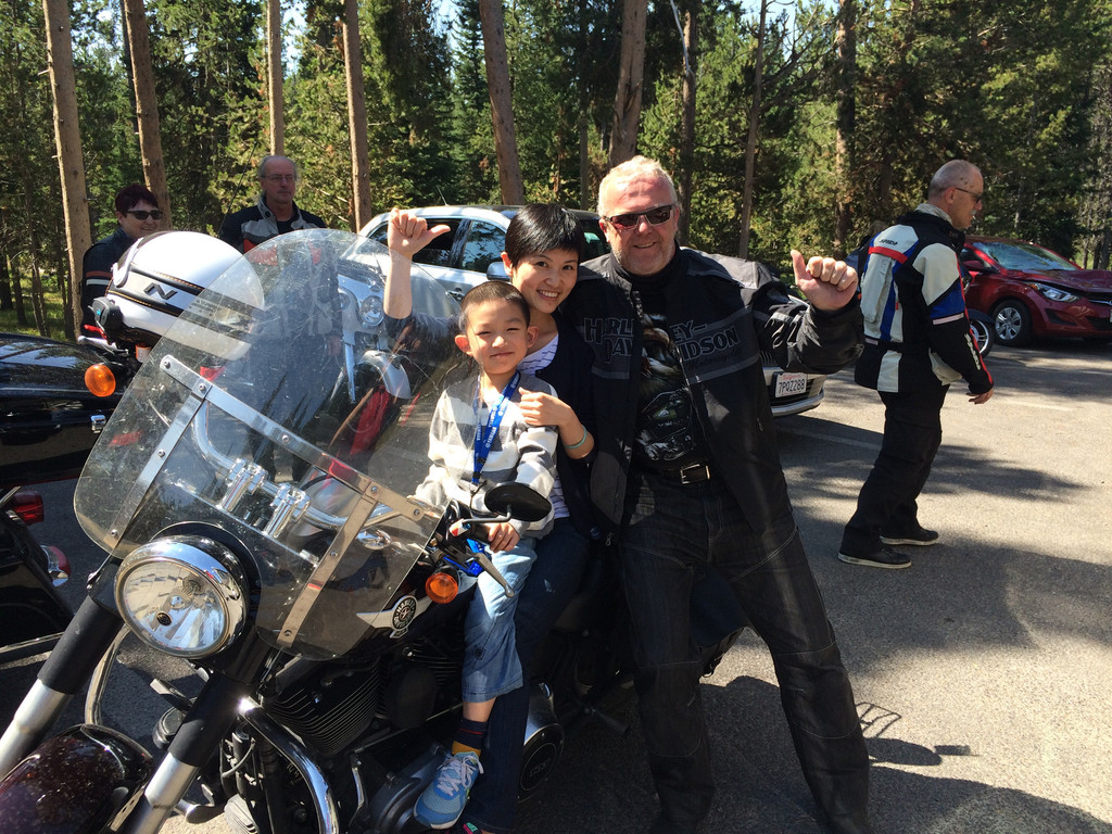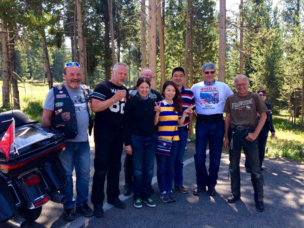 1: 大提顿去黄石的一个加油站遇到了一个超拉风的哈雷戴维森(Harley Davidson) 摩托车队,头盔摘下的那一刻,惊叹的发觉原来是一群白发帅哥酷姐们,他们来自德国和瑞士,飞到丹佛后在美西骑行两周了。感叹我们二鬓斑白时,是否也能有这样的体魄和激情。