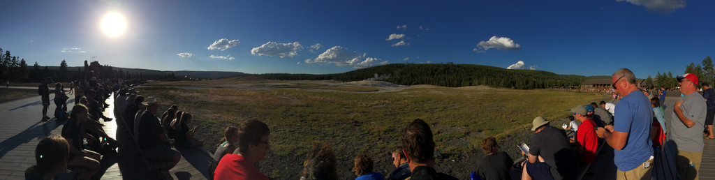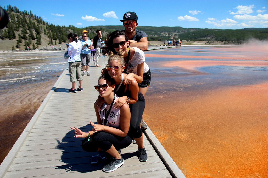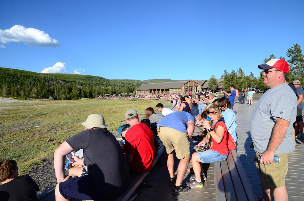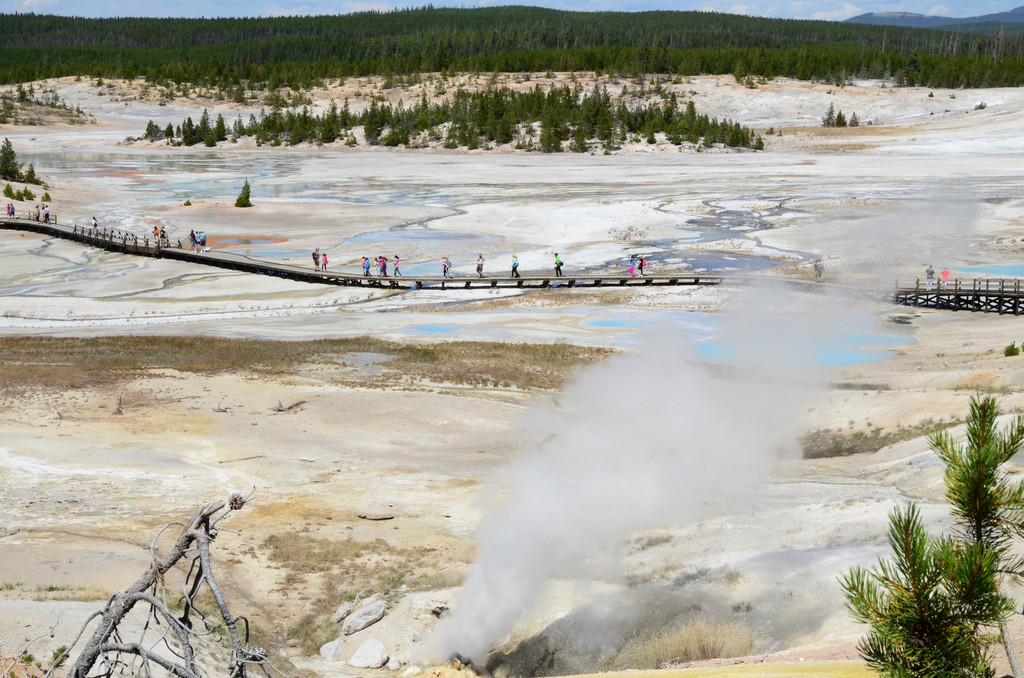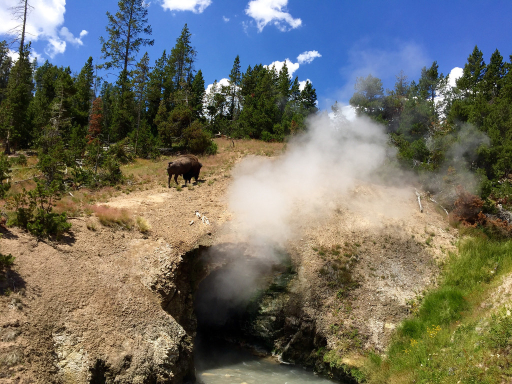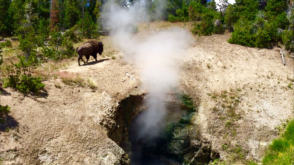 在间歇泉周围,野牛旁若无人的从木头栈道上走过,周围的游客拿着手机、相机不停的咔嚓咔嚓;