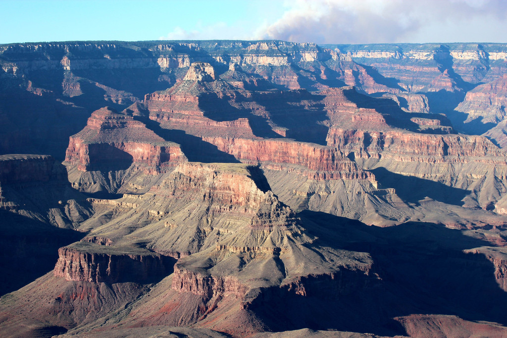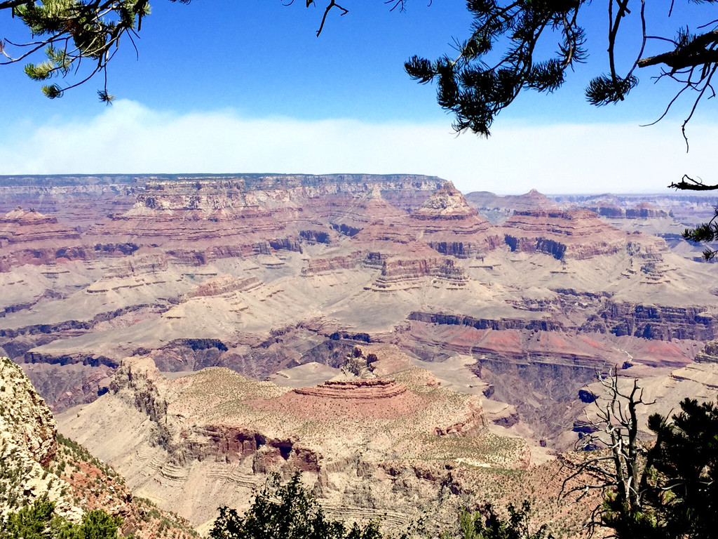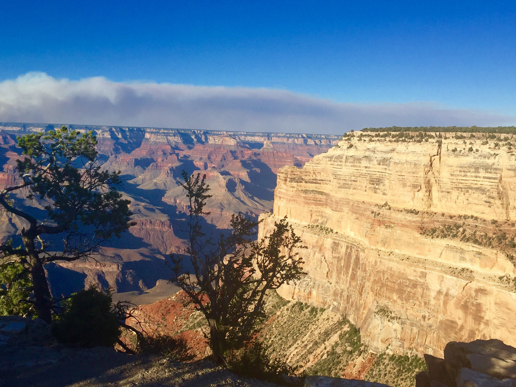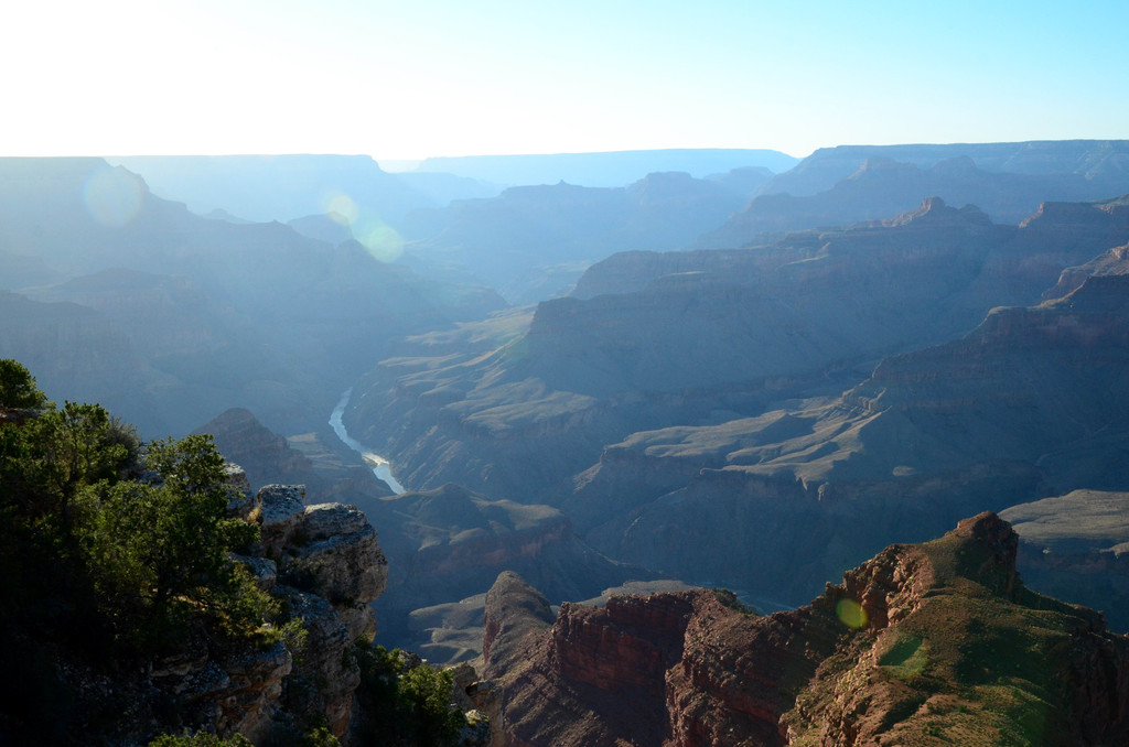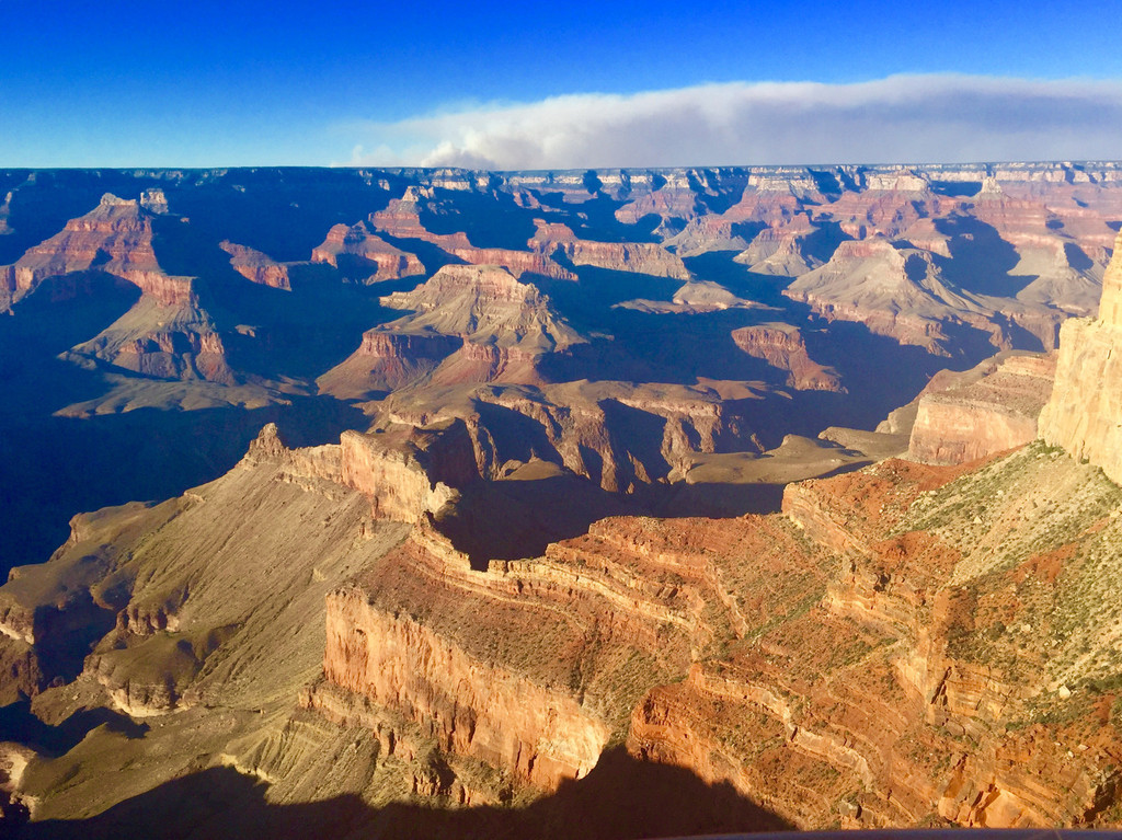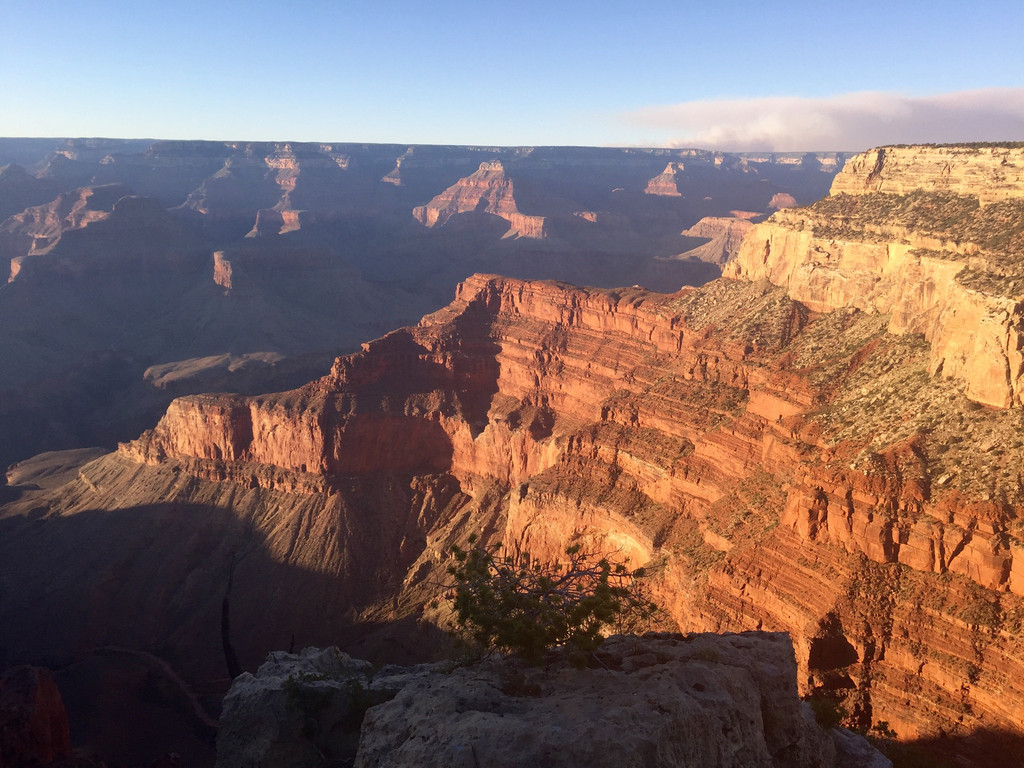 大峡谷国家公园经历科罗拉多河百万年冲击而成的峡谷,最深处落差有一千五百米,是世界七大奇景之一。此处旅游的中国游客较多,随处能听到家乡的口音。昨天傍晚进入景区,正好趋于日落,斜射的晚霞洒落红色的山顶,照的顶部火红通透,与中底部渐暗的色彩相衬,群山跌宕,逶迤千里之势,美国西部山区特有的沧桑和大气此时发挥到了极致。由于相机感光和镜头取景的局限,实际视野的景色远比照片更有层次感和震撼力。
