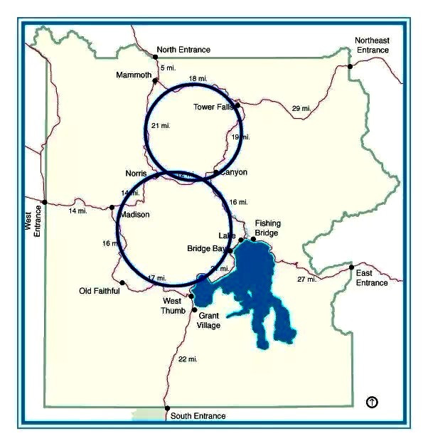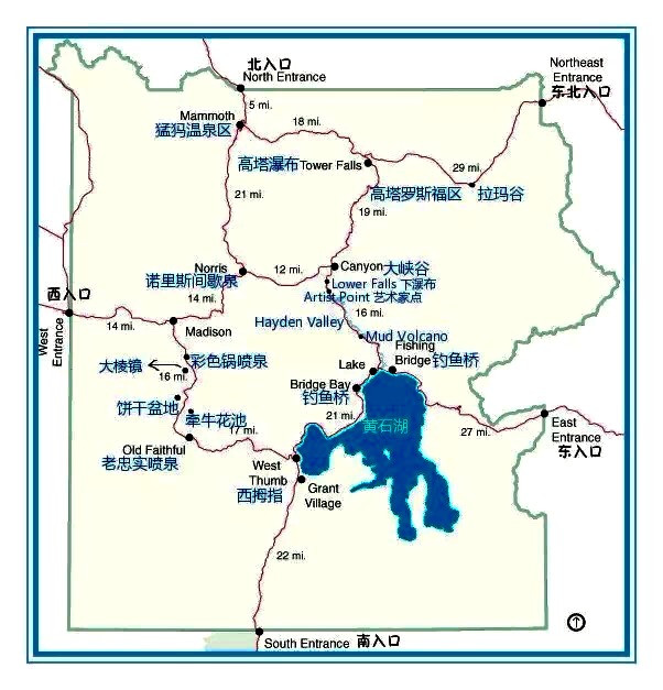 1. 西姆指间歇泉盆地(West Thumb Geyser Basin) 2.黄石湖(Yellowstone Lake) 3.泥浆火山(Mud Volcano) 4 .黄石大峡谷(Yellow Stone Canyon ) 5.上瀑布(Upper Fall) 6.下瀑布(Lower Fall) 7.海顿山谷(Hayden Valley) 8.石化林(Petrified Forests)