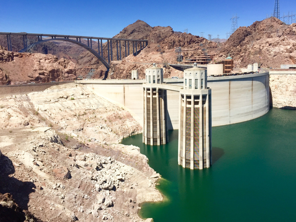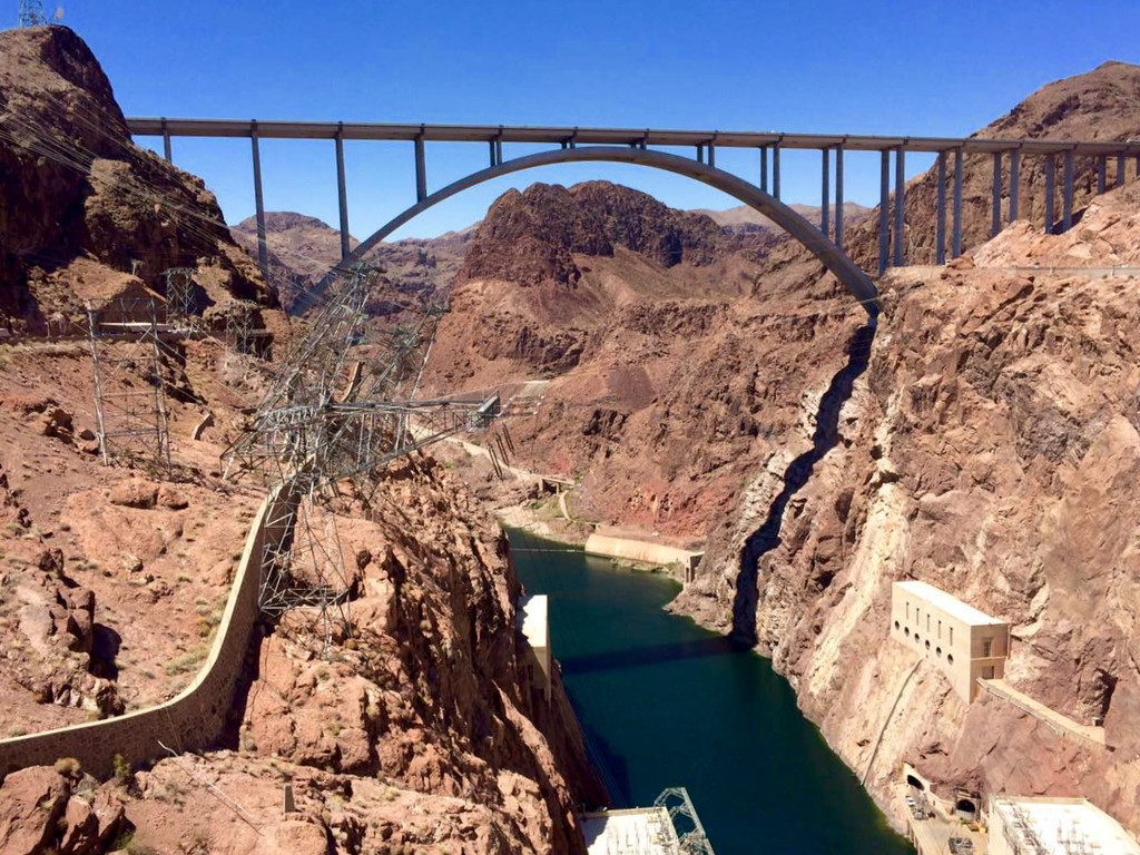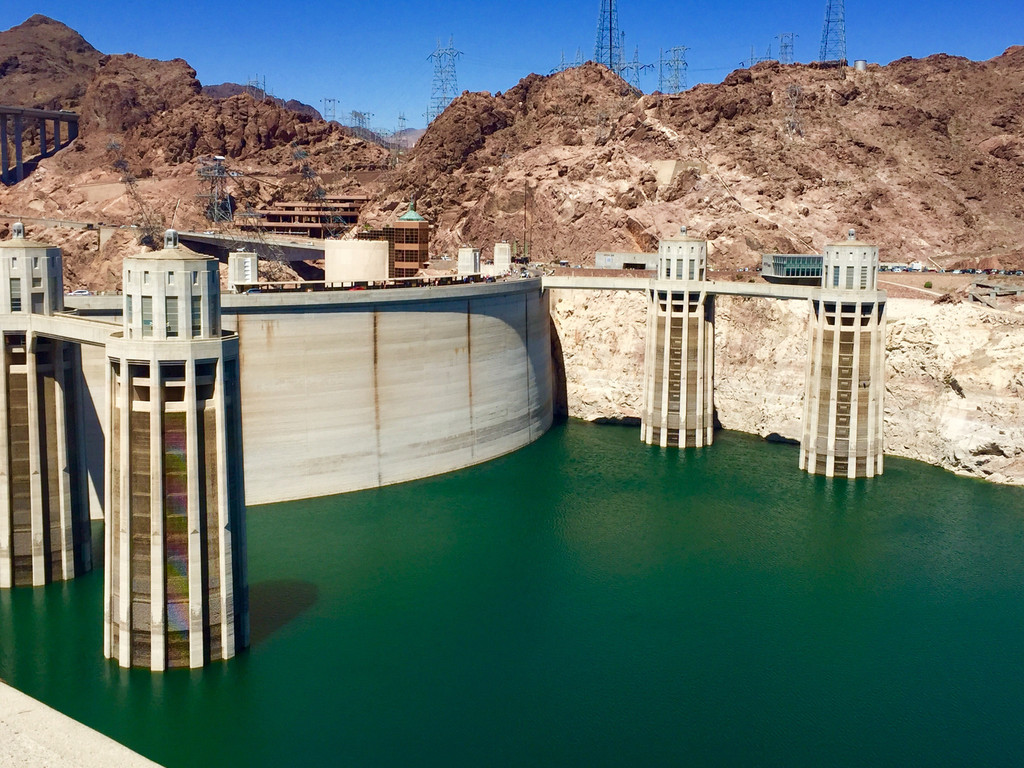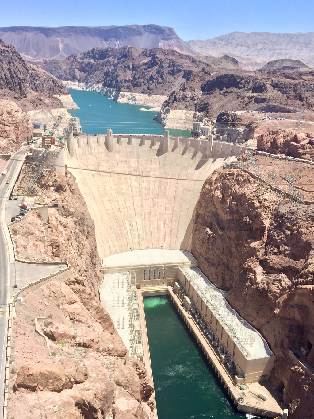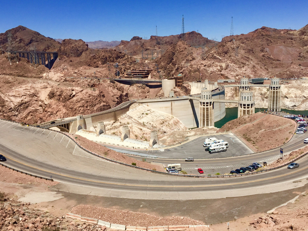胡佛水坝距拉斯维加斯 55公里40分钟车程,太阳照射强烈,温度高于42摄氏度。号称世界七大奇迹之一的胡佛大坝,供应着拉斯维加斯所有的电力和水资源,被称为沙漠之钻,正因为这座水坝,才有如今沙漠之城拉斯维加斯永不熄灭的霓虹灯。好莱坞许多灾难片都可以看到胡佛水坝的特写,变形金刚也曾在此取景。