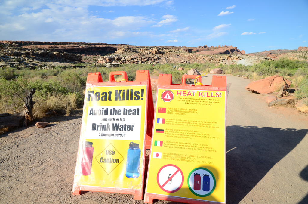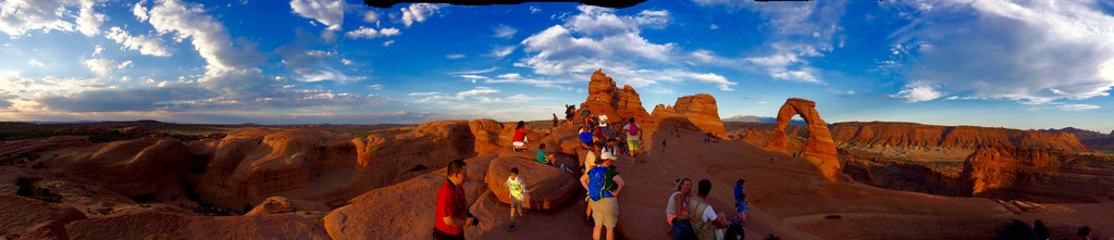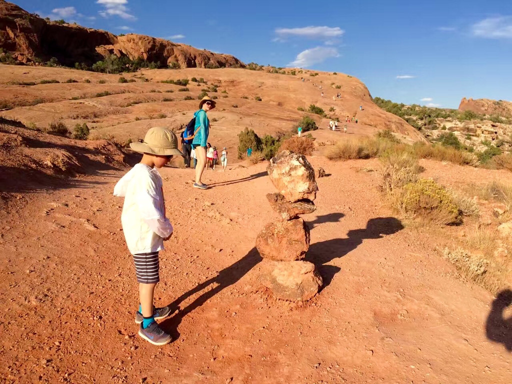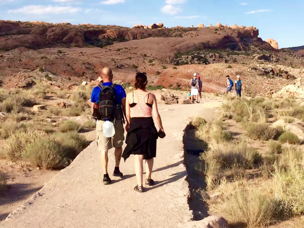 下午六点半,当太阳开始60度角斜射地面时,我们果断驱车来到今日重点—落日下的精致拱门。下车后,背起徒步旅行包,根据Heat Kills进山提示怀揣几斤水,冒着43度高温,沿着小石头垒起的原始路标,顺着陡峭的岩石和山路,徒步4.8公里。当看到夕阳下泛着橙色光芒精致拱门的那一刻,所有被太阳烤红的脸庞上都堆起了喜悦而又满意的笑容,目睹地球上的又一奇迹,此行值了!