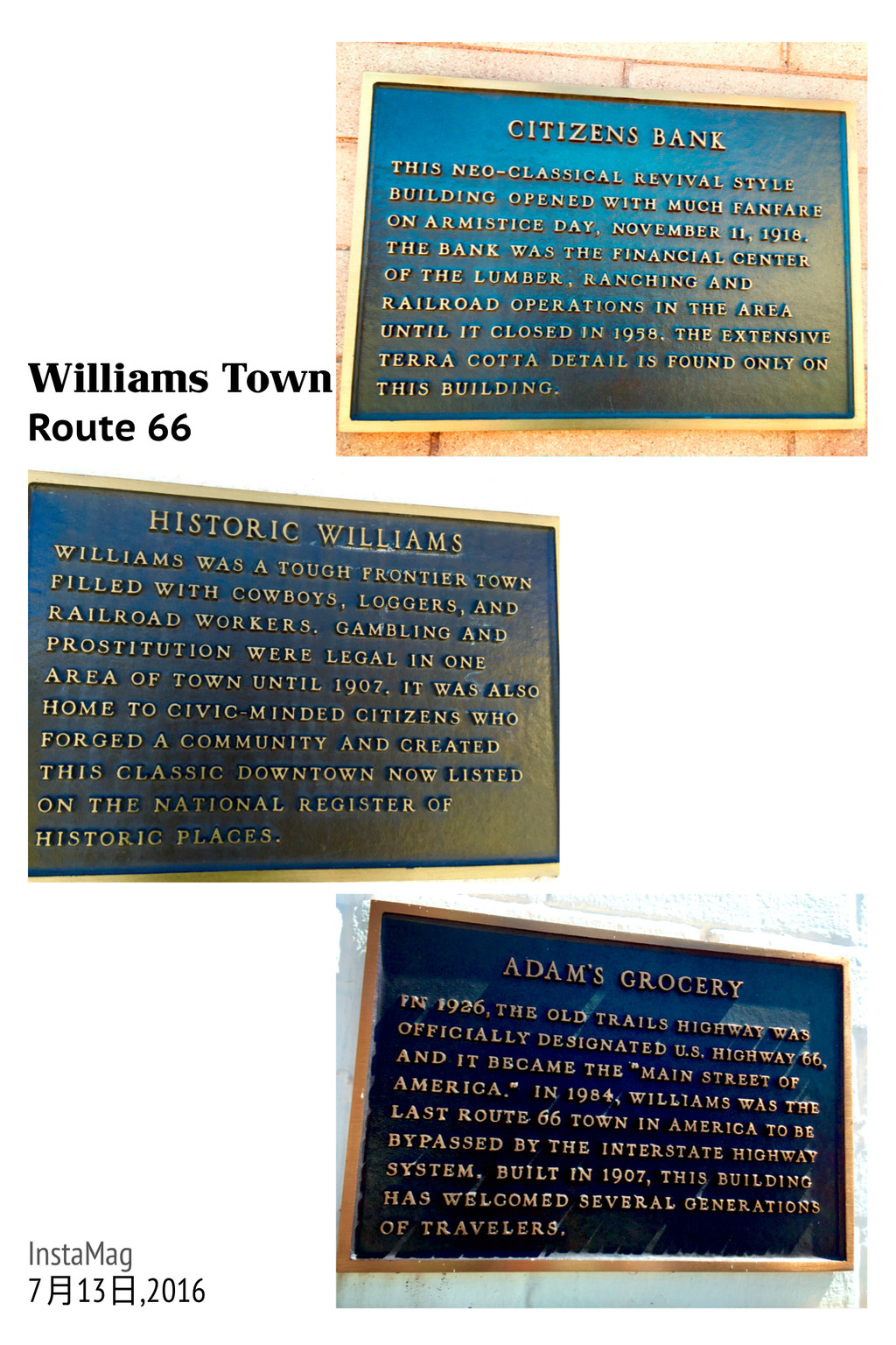 威廉姆斯小镇虽小,却有着不寻常的历史。小镇为了纪念早期赫赫有名的猎人向导威廉.舍莱.威廉姆斯而命名。这个66号公路上的小镇被认为是通向大峡谷的门户。1881年,第一个邮局开设,1882年铁路开通时,小镇已有250多位居民。如今小街上到处都是礼品店,而礼品大多与著名的66号公路有关。