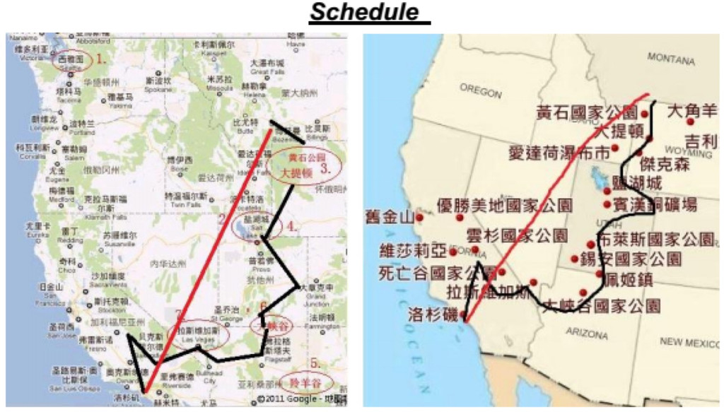 洛杉矶好莱坞环球影城;圣莫妮卡海滩;红杉国家公园;拉斯维加斯;胡佛水坝;威廉姆斯小镇;大峡谷国家公园;死马点州立公园;摩押;拱门国家公园;盐湖城;阿尔派恩小镇;大提顿国家公园;杰克逊镇;黄石公园。