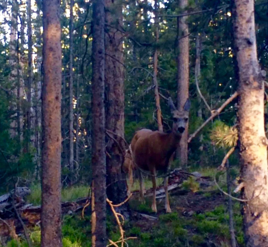 傍晚从住宿到餐厅的路上,一头巨大的大角鹿慢悠悠的跨过马路到对面的树林里去吃草;不远处丛林中梅花鹿一家三口在游荡(拍照时小鹿宝宝先溜了)