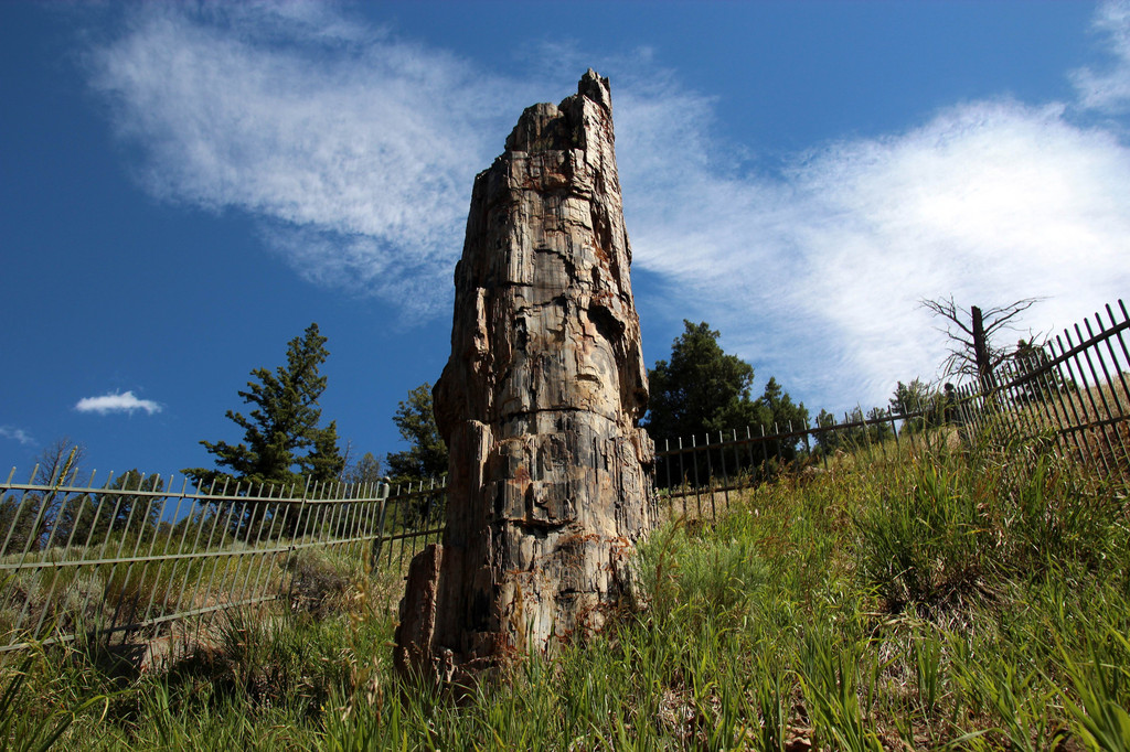 石化树林,五千万年前的火山喷发将一片红杉林瞬间凝固,然后化为石林。如今许多石化树木已经损毁,寻到了保存完好的一棵石化树木,也是公园内唯一用铁栏杆保护起来的一处景点。