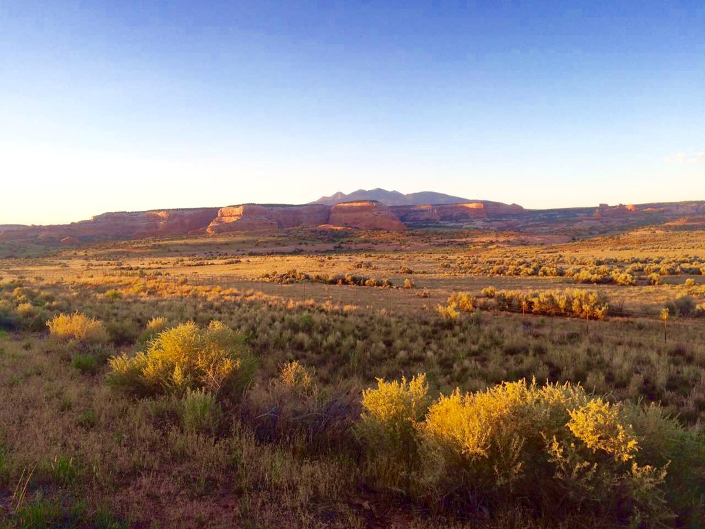 191号公路从荒漠过渡到绿洲,植被开始增多,不经意间可见跳跃的野兔,小鹿;公路两边一望无际的旷野中,点缀着形态各异的赭石群,夕阳西下,映红了天边的晚霞,接近摩押时夕阳几乎平射到地面,草原镀上了金色。