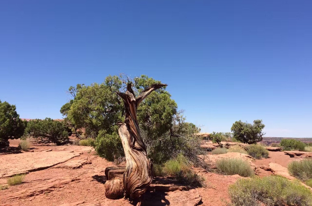 路途遇见不多的树,干枯扭曲着,下面见不到树皮,顶端却有茂盛的绿叶。