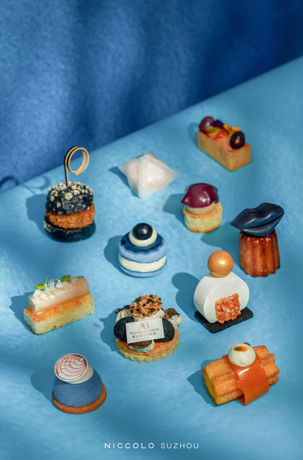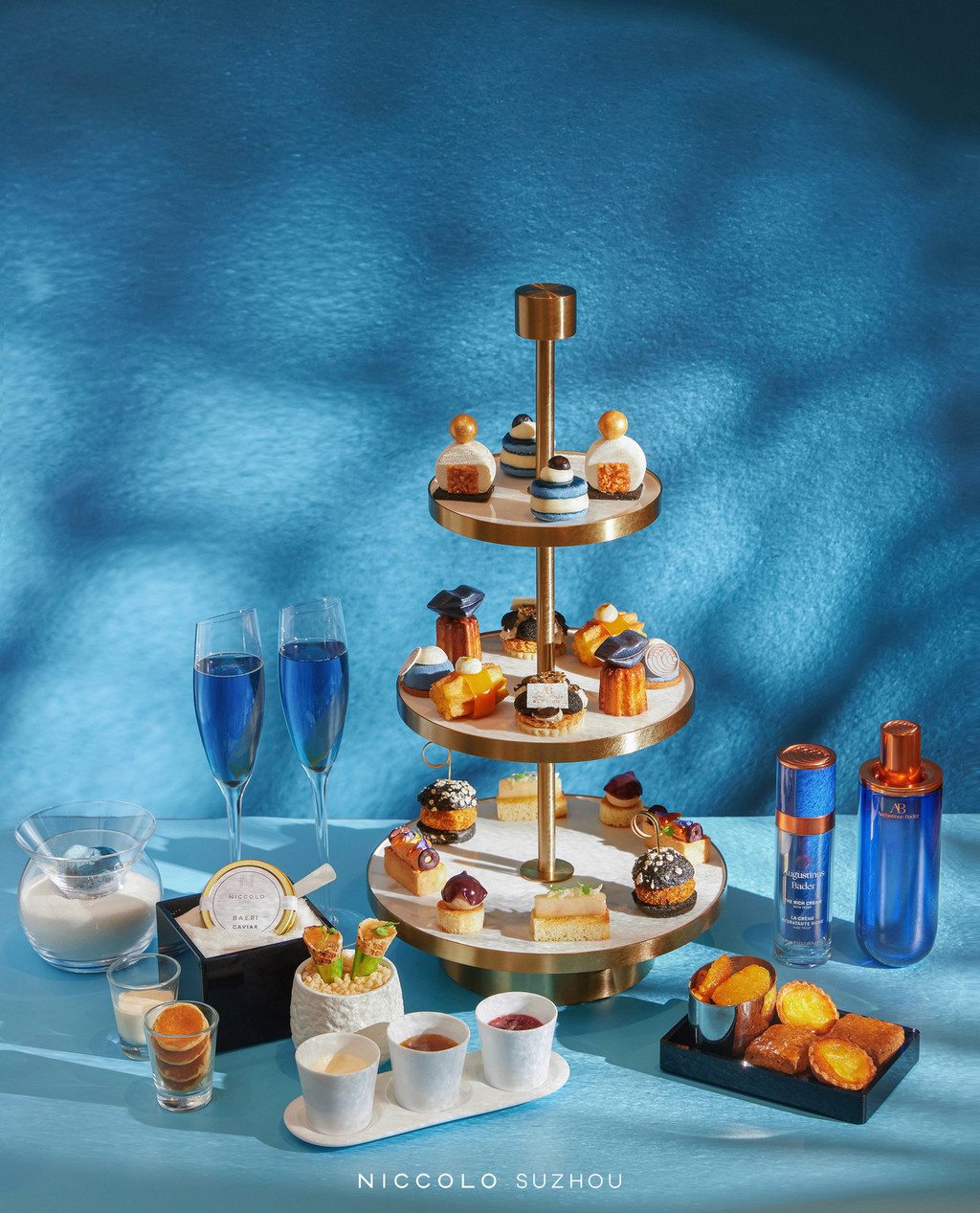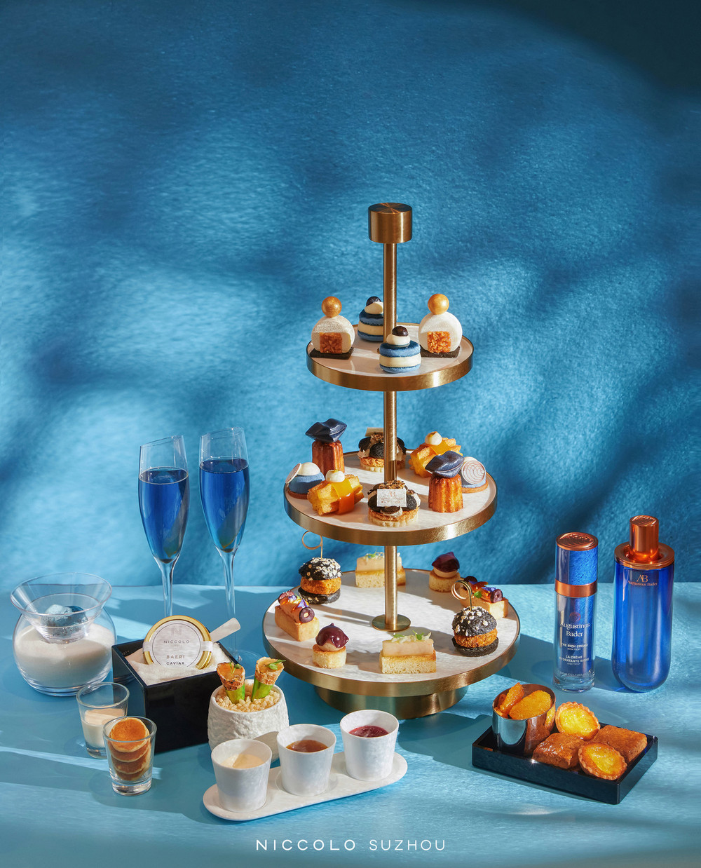 苏州尼依格罗酒店饼房厨师长刘干彬(Laem Liu)创意十足,将下午茶甜点注入奥古斯汀·巴德标志性的蓝金高光,结合其成分天然、自然纯粹的理念,灵感缔造味蕾奢宠体验。苏州尼依格罗酒店X奥古斯汀巴德联名下午茶售价588元/套起,包含5款订制咸点及5款主题甜点,更有位上特色点心水晶虾饺。除此之外,下午茶套餐还包含司康饼、鲜橙馅饼、法式薄饼及蓝莓冻糕派送。酒店升级款的下午茶只需额外支付100元,即可品尝精选尼依格罗鱼子酱、2杯尼依格罗定制普罗塞克起泡酒或鸡尾酒。