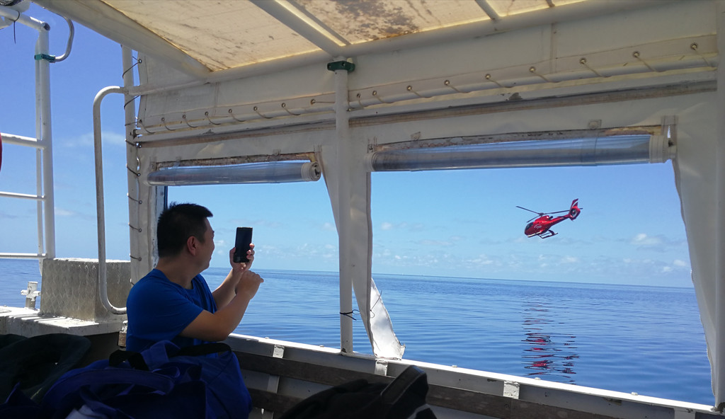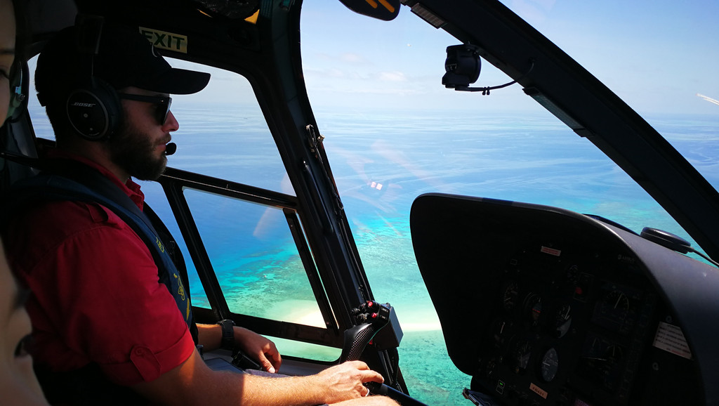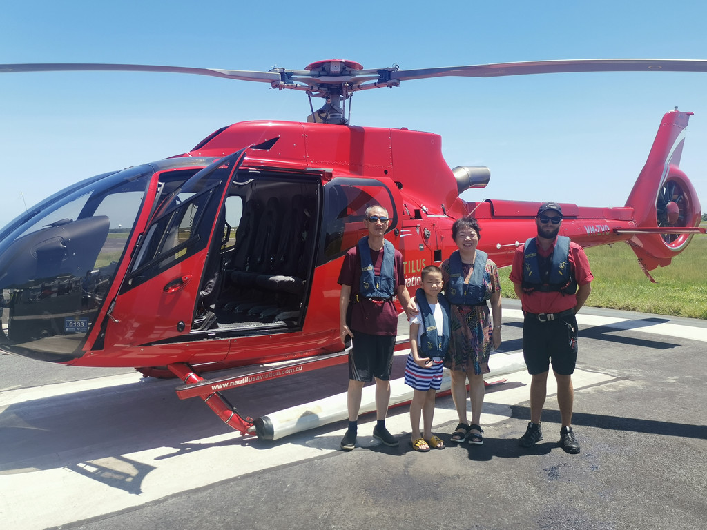 真正踏上去大堡礁的行程,还是有些激动和紧张的,因为出发坐直升飞机去大堡礁是全程英文服务的,而且是头一次坐飞机心里还是有点打鼓的。早上10点半,一个帅气的澳洲小伙来酒店接我们,大众MPV专车服务非常到位,核对信息后上车出发,一路来到凯恩斯机场的直升机停机坪,这里位于航站楼的西边,紧邻跑道。应该说,直升机的服务还是非常到位的,虽然服务人员不会中文,但是很耐心友善,我这种半吊子英语也能基本满足沟通需要,而重要的安全事项有中文的电视讲解,这点非常到位。同行的是两位美国老人,很友善也很乐于交流只可惜英语水平太菜,只能简单的沟通两句,实在是有些遗憾。