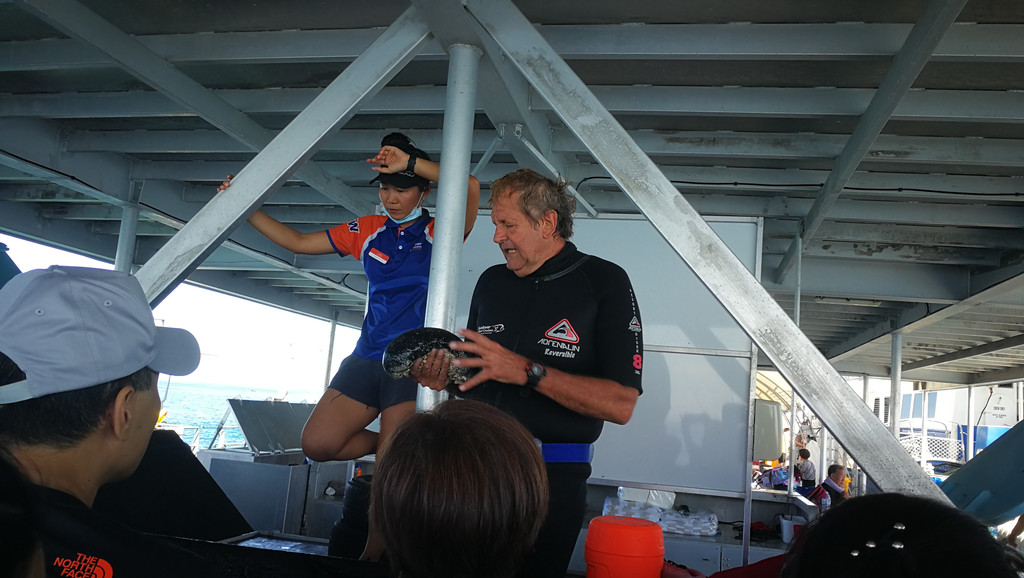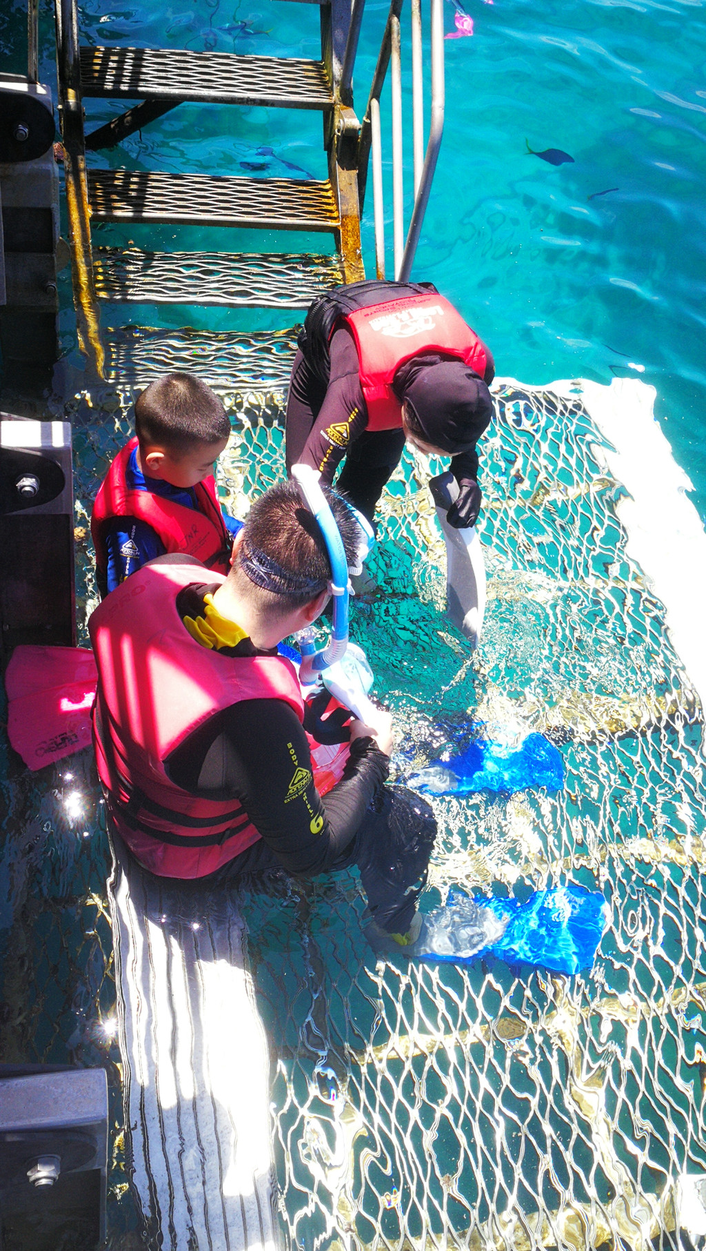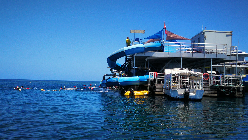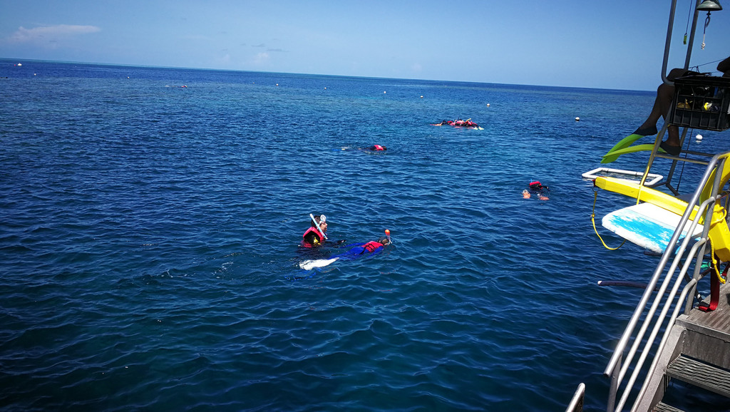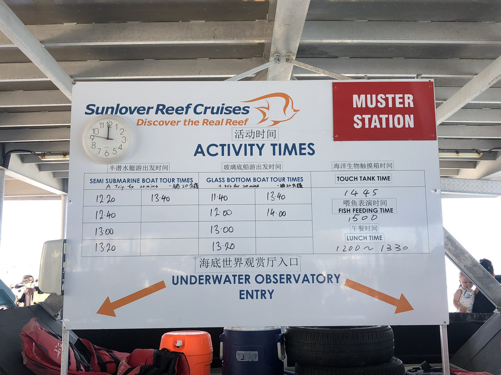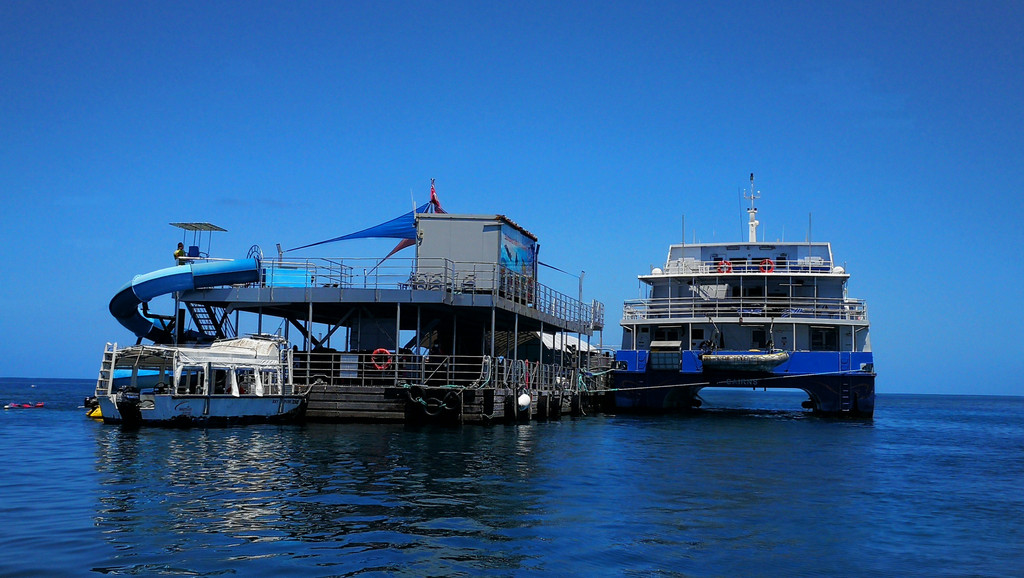 刚到平台,就有以为说中文的美女接待了我们,并详细讲解了平台上的各个项目和时间安排,有半潜船,玻璃底船,浮潜区,水滑梯,还有免费的自助午餐等。这里项目不少,具体说几个重点的事项: