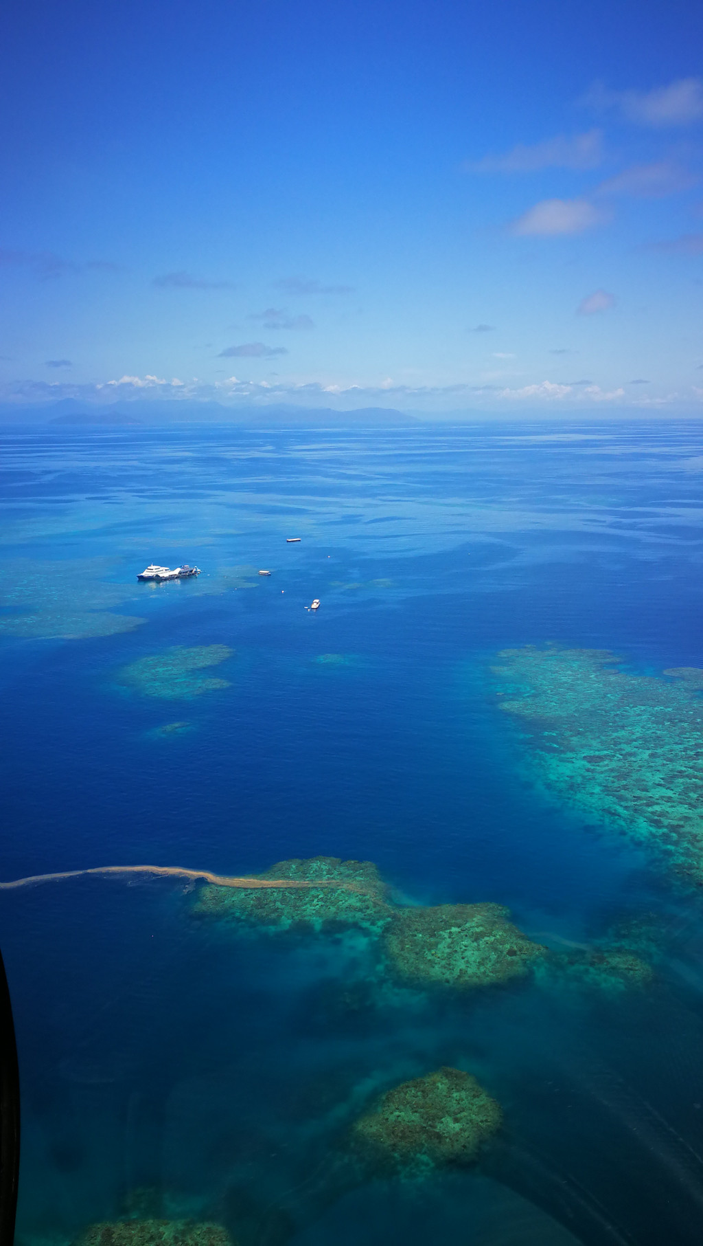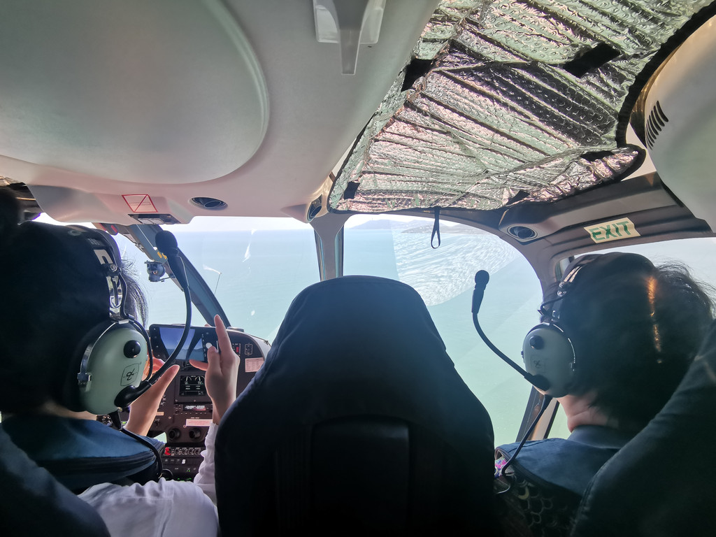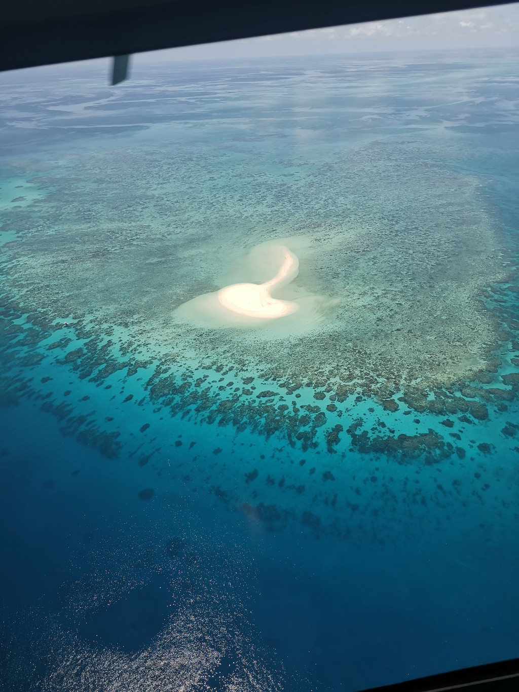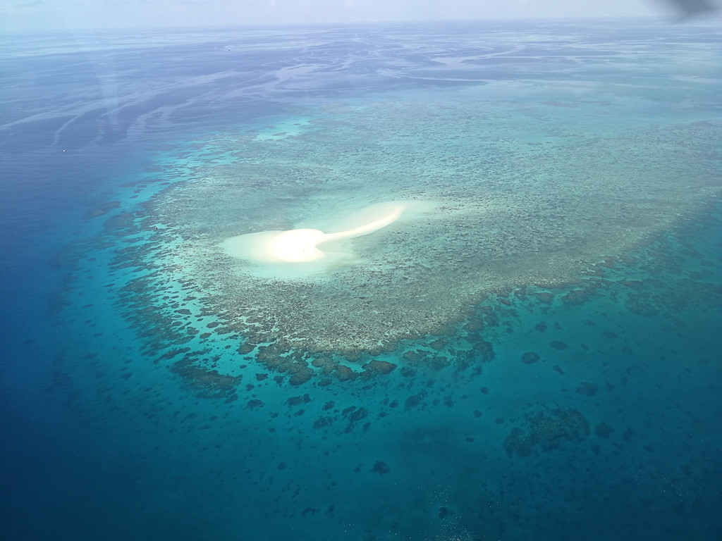 大约准备了15分钟,我们开始登机。飞机是两排,每排可以坐4个人,除去飞行员,我们7个人刚刚好。飞机平稳起飞,穿过跑道,穿过机场,穿过海岸,向大堡礁一路进发。原本以为也就是15分钟路程,实际上飞了快30分钟,看来大堡礁距离海岸还是挺远的。中间飞机带我们俯瞰了几处突出的堡礁,确实美丽非凡,无法用语言形容。只可惜飞机噪音太大,大家只能用表情传递各自的惊叹之意。