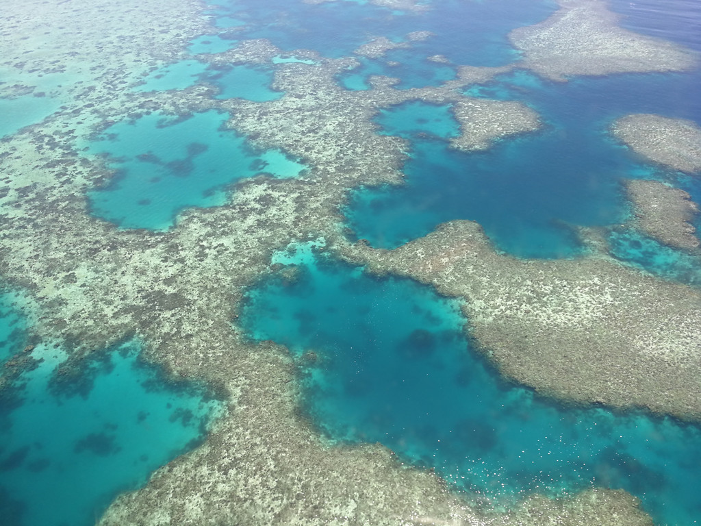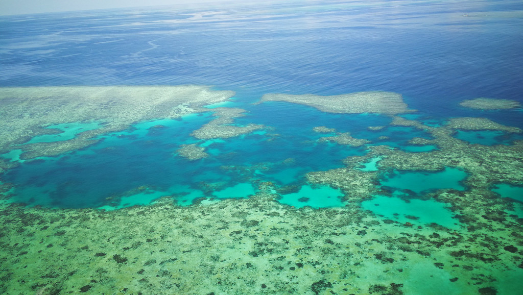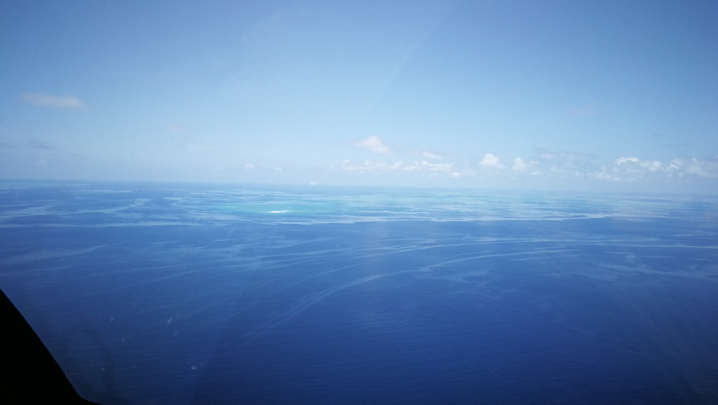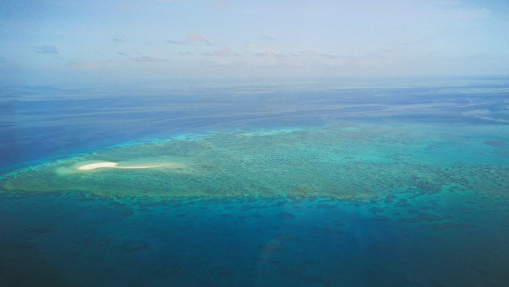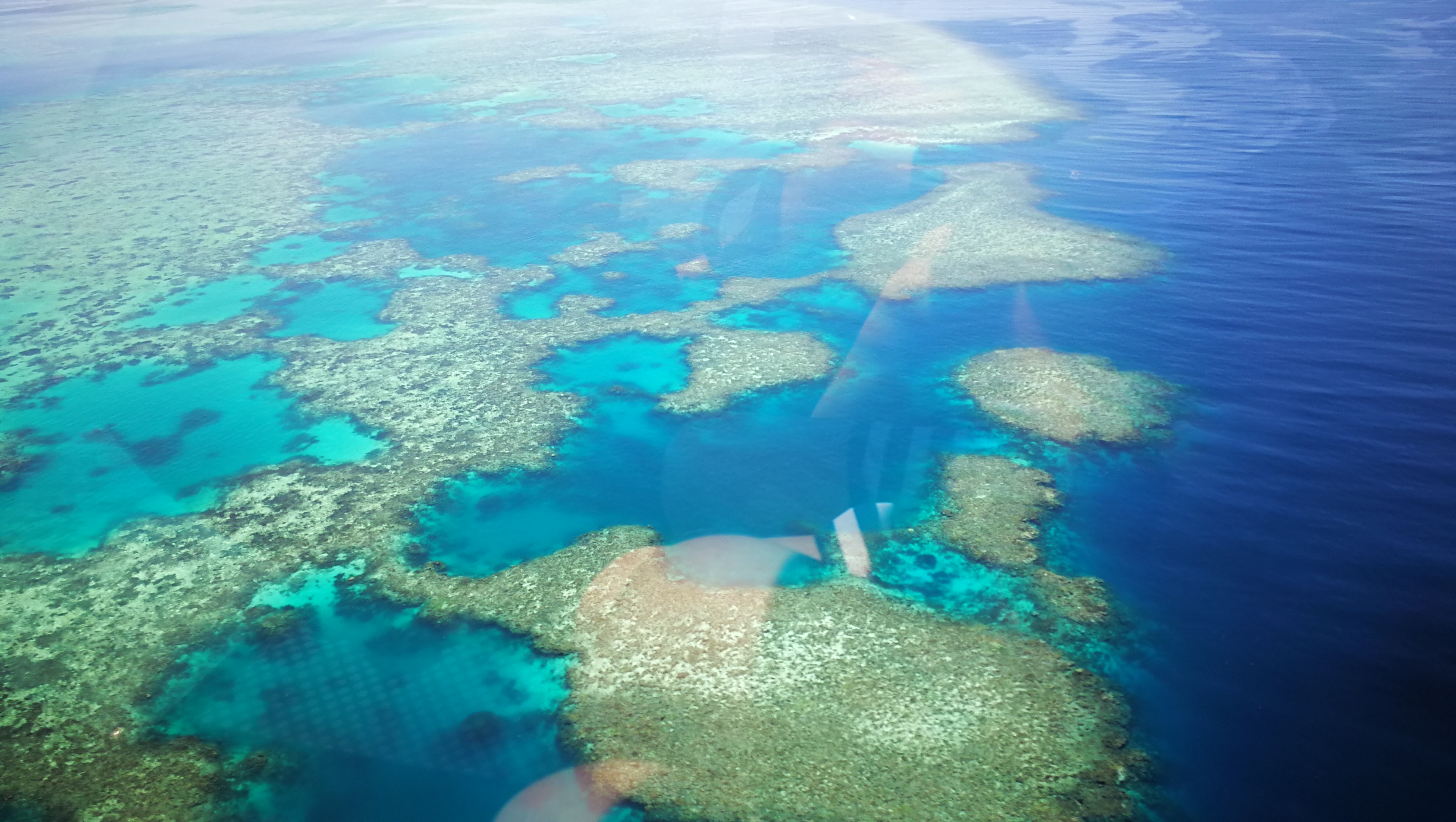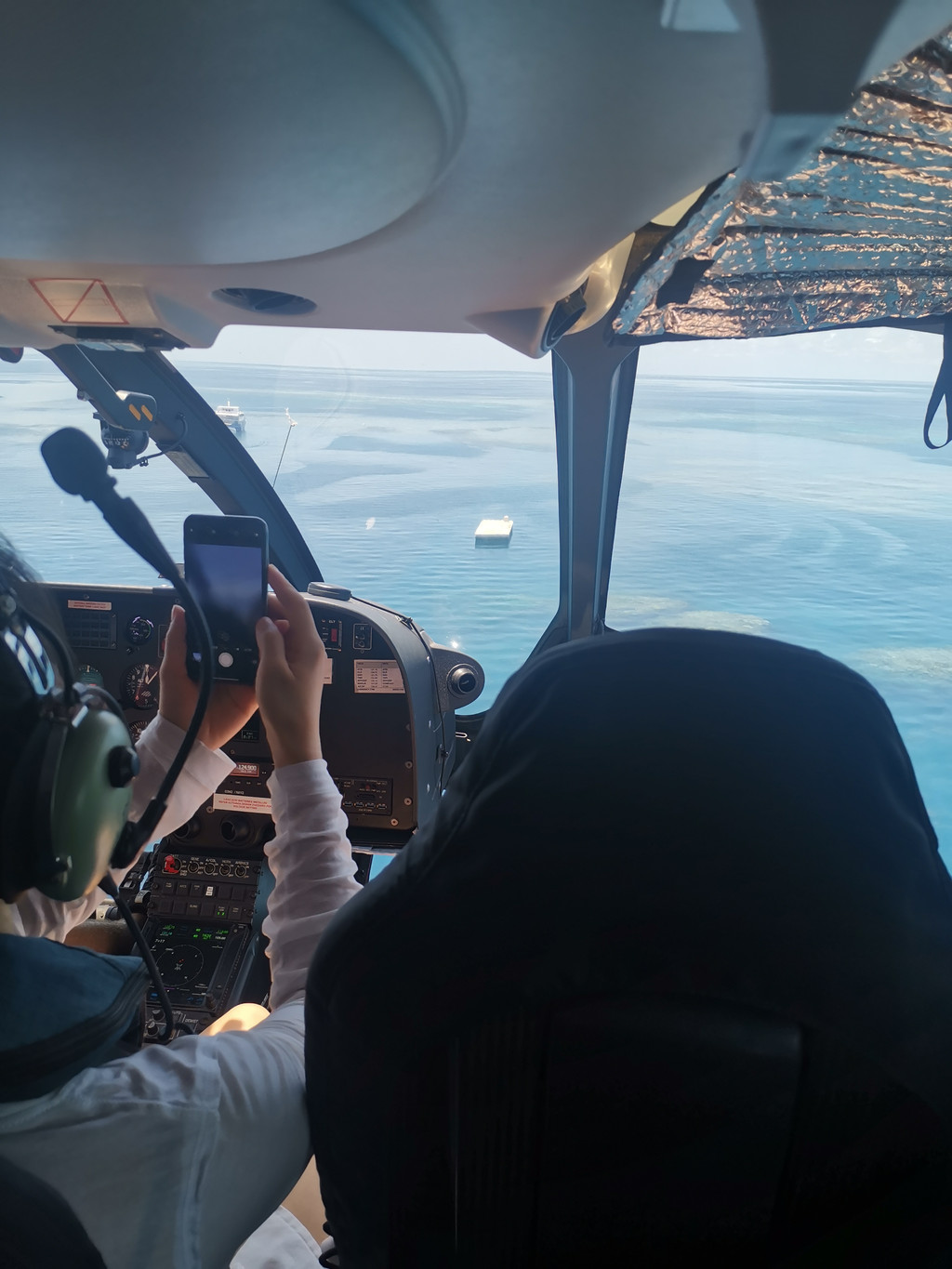 大约准备了15分钟,我们开始登机。飞机是两排,每排可以坐4个人,除去飞行员,我们7个人刚刚好。飞机平稳起飞,穿过跑道,穿过机场,穿过海岸,向大堡礁一路进发。原本以为也就是15分钟路程,实际上飞了快30分钟,看来大堡礁距离海岸还是挺远的。中间飞机带我们俯瞰了几处突出的堡礁,确实美丽非凡,无法用语言形容。只可惜飞机噪音太大,大家只能用表情传递各自的惊叹之意。