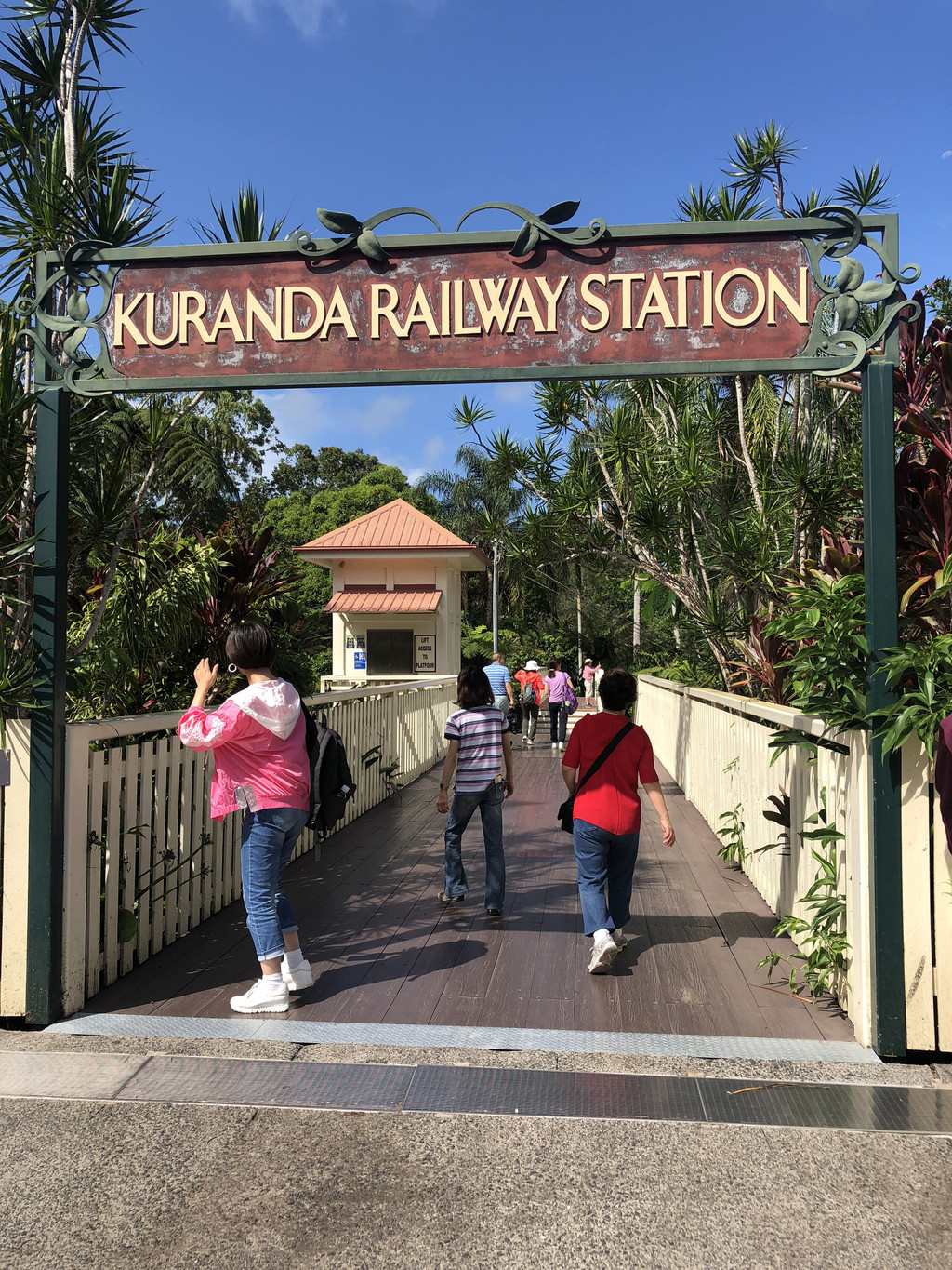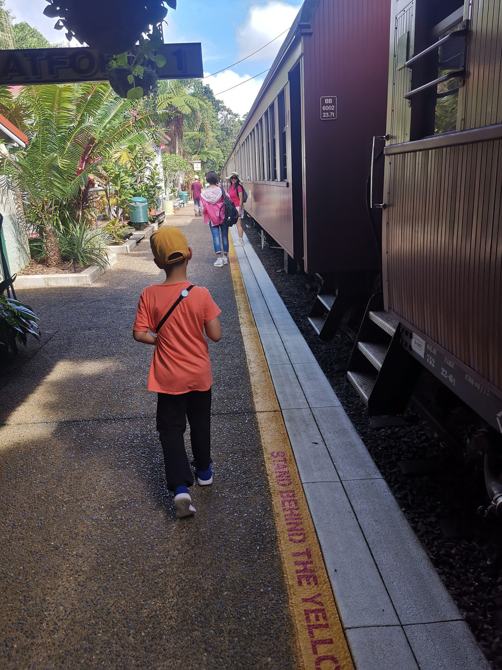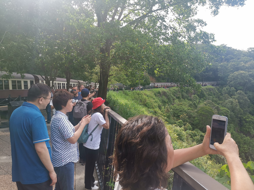 全程下来大约是1个来小时的时间,这个项目还是非常有意思的,大家如果去库兰达不要错过了。回程是乘坐库兰达小火车,这条火车线路据说是当年为了淘金而建设的,机车还是采用蒸汽动力,轨道应该是那种窄轨火车,车厢没有空调,都是开着窗户那种原始的车厢,内部挺宽大,三人一排的座位两两相对够成一个卡座,需要凭票对号入座,人不多我们五个人正好一个卡座,车厢内都有免费的饮用水。火车开动起来不快,也就是一小时60公里这么的速度,中间会在瀑布停一站,市区停两站。一路上火车嘎油嘎油的悠闲前行,而我们也瘫坐在座位上,任由身体随着火车一同晃动,看着窗外的景色,享受着这慢节奏的旅程,不一会儿就都进入了梦乡。