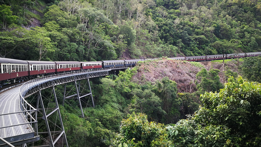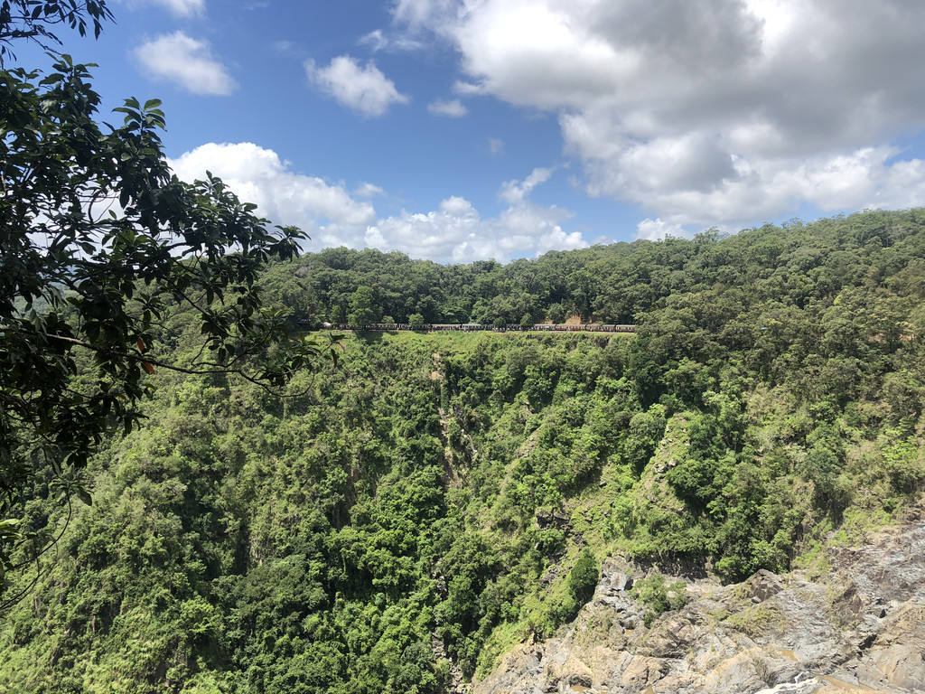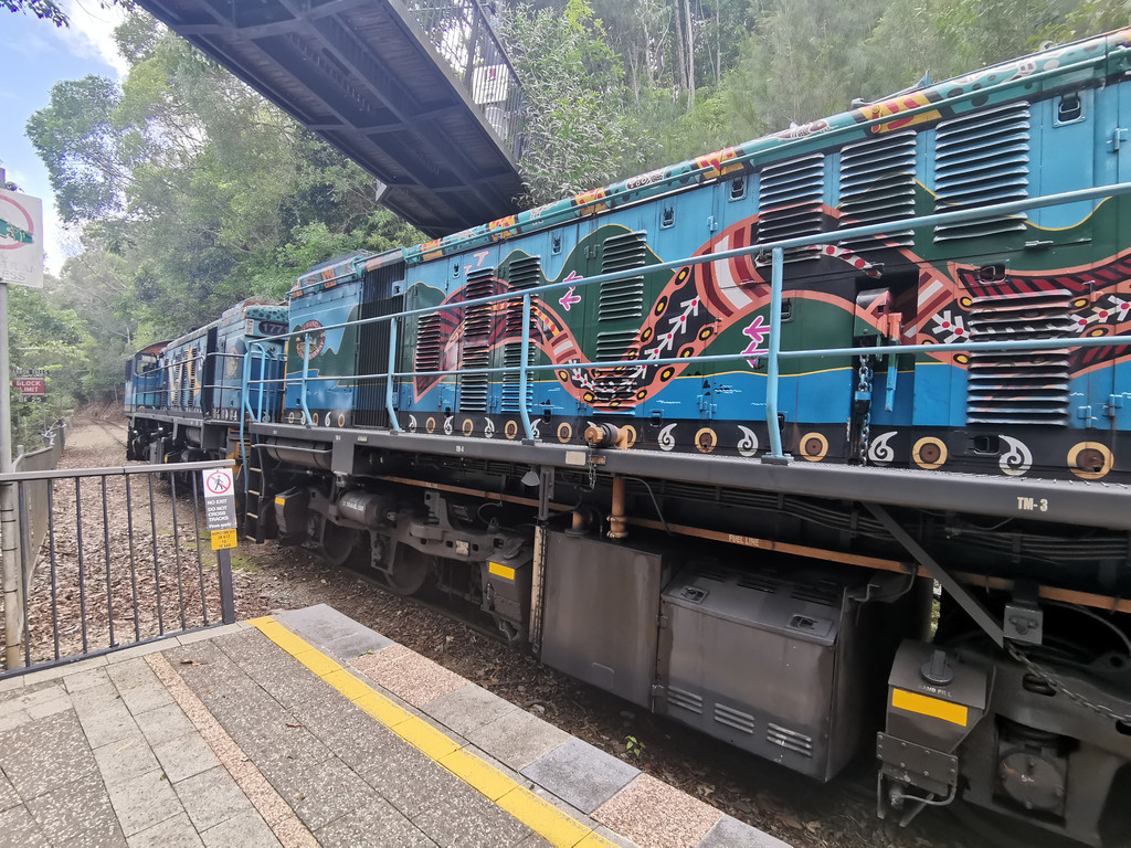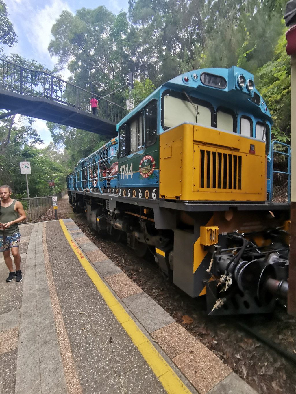 全程下来大约是1个来小时的时间,这个项目还是非常有意思的,大家如果去库兰达不要错过了。回程是乘坐库兰达小火车,这条火车线路据说是当年为了淘金而建设的,机车还是采用蒸汽动力,轨道应该是那种窄轨火车,车厢没有空调,都是开着窗户那种原始的车厢,内部挺宽大,三人一排的座位两两相对够成一个卡座,需要凭票对号入座,人不多我们五个人正好一个卡座,车厢内都有免费的饮用水。火车开动起来不快,也就是一小时60公里这么的速度,中间会在瀑布停一站,市区停两站。一路上火车嘎油嘎油的悠闲前行,而我们也瘫坐在座位上,任由身体随着火车一同晃动,看着窗外的景色,享受着这慢节奏的旅程,不一会儿就都进入了梦乡。