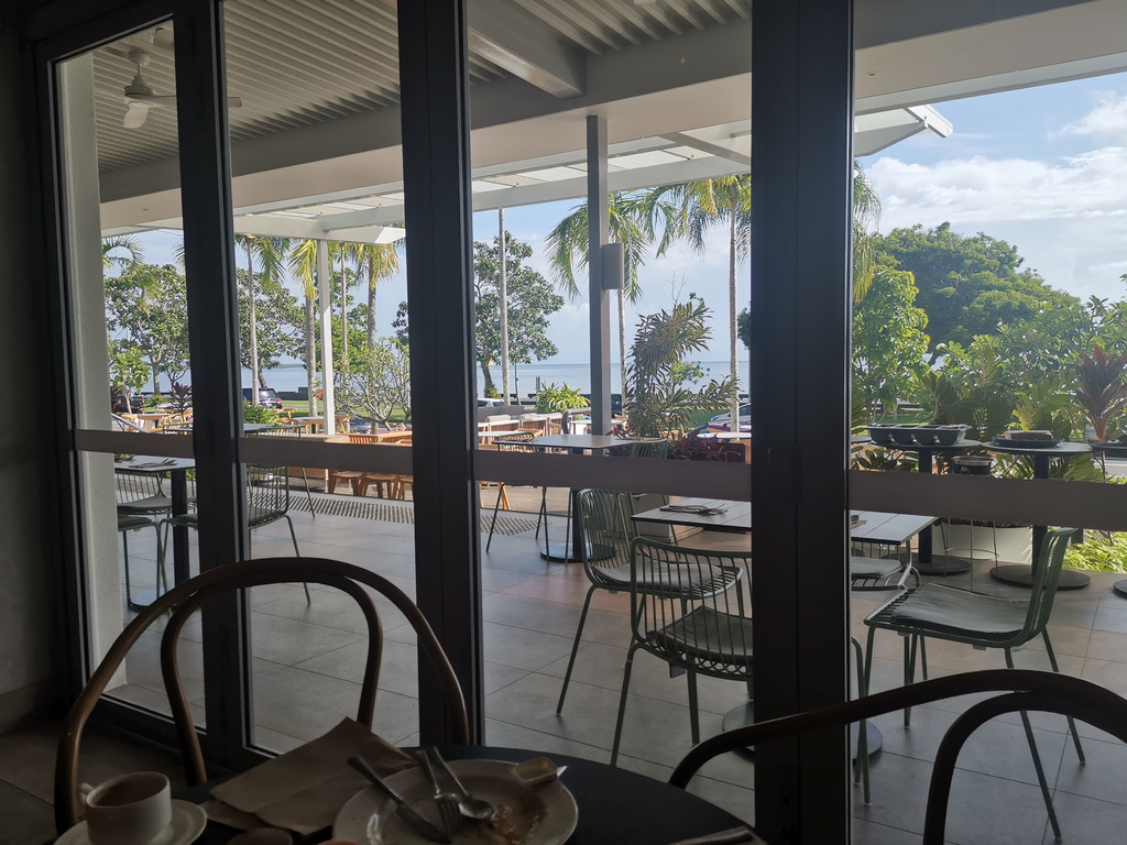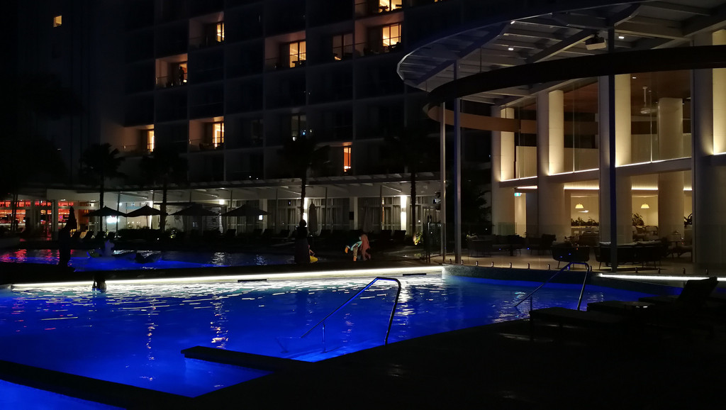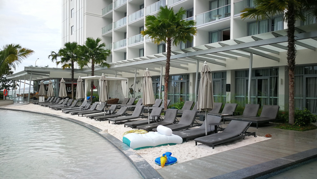酒店以白色系装修为主,大堂不大但是布置的休闲舒适,两栋楼的客房中间包裹着一个巨大的游泳池,而酒店以街之隔就是大海,此时海风徐徐、波光粼粼,可远眺岛屿与船只,不时有海鸥飞过嘻嘻,此情此景顿时驱散了我们旅途的疲惫,整个神经和状态都不由自主的放松了下来,快速进入到了休闲度假的模式中。