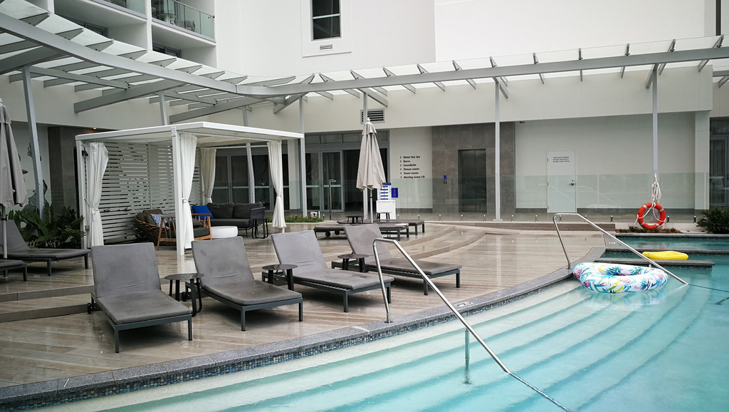 入住三天我们发现这家酒店华人旅客很多,前台、餐厅都有中文服务,早餐有粥和咸菜等,还有筷子提供,可以说国人去凯恩斯可以多考虑这家酒店。酒店的游泳池很赞,早上6点开门到晚上9点半,前台提供免费的浴巾,游泳池有潜水区供孩子戏水,也有1.5米的游泳区,水是海水这点稍要注意,我们基本上每个晚上都来游一个小时,晚上水应该是加温了,并不冷非常好玩。酒店前台的浴巾借还也非常随意,不用登记,还的时候放回框里就行,外出酒店游泳或去大堡礁都可以借,服务非常赞。特别提醒下,酒店是开放式的,游泳时贵重物品还是要保管好,避免丢失。