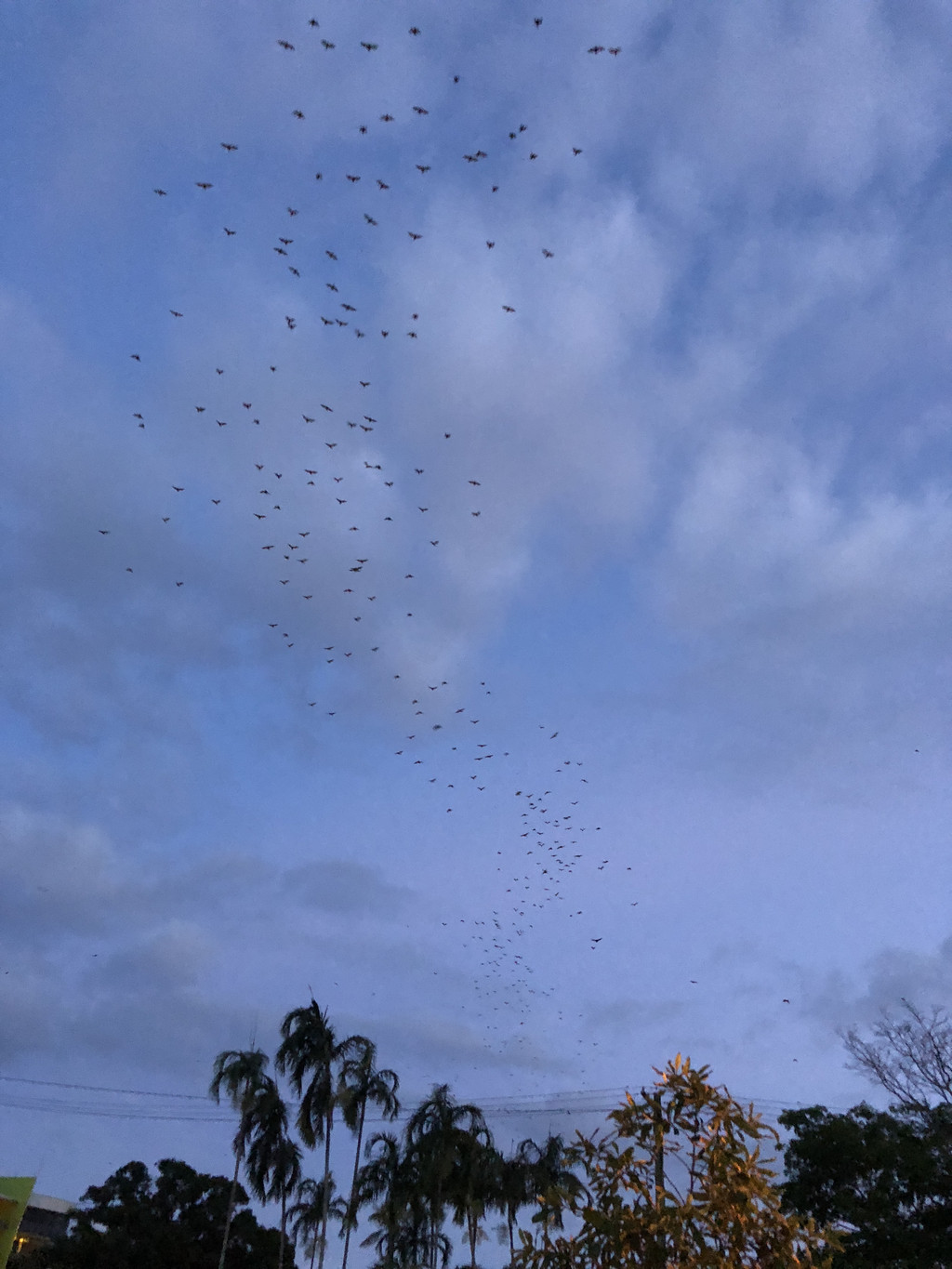 吃完饭吹着海风,悠闲的往酒店走,中间还有件新奇的事,路上看到天空大片的“飞鸟”往海岸飞,可是等飞近了一看居然是硕大的蝙蝠,个头真的跟海鸟一样,密密麻麻一大片场面甚是恐怖,仿佛世界末日般。回来从新闻上才看到,是因为山火把很多栖息在山林中的蝙蝠逼到了城市。
