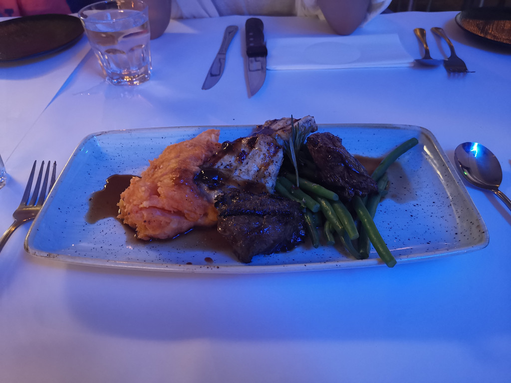 由于父母吃不惯西餐,所以我们还是先回酒店放东西。之后他们在此前往当地比较有名的中餐馆 —— 饺子工坊吃牛肉面去了。而我们三口则来到海边美食一条街,尝了尝当地的西餐美食。来到了网上评论比较好的 Raw Prawn Seafood Restrant 餐厅。儿子点了特别推荐的番茄海鲜意面,老婆点的牛排,我则大胆尝试了澳洲特有的XX肉和XX肉拼盘。他们的菜肴如评价一样,非常好吃而且正宗。而XX肉和XX肉嘛,比想象的要好吃。两种肉都很瘦,肉质纤维要比牛肉还要粗一些,XX肉没有什么骚味,XX肉更加的硬一点。