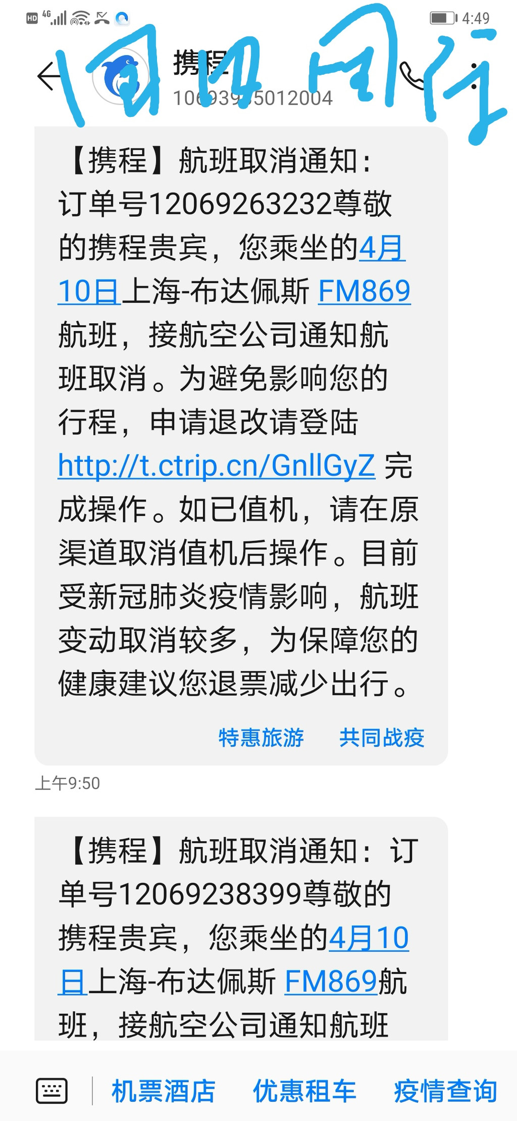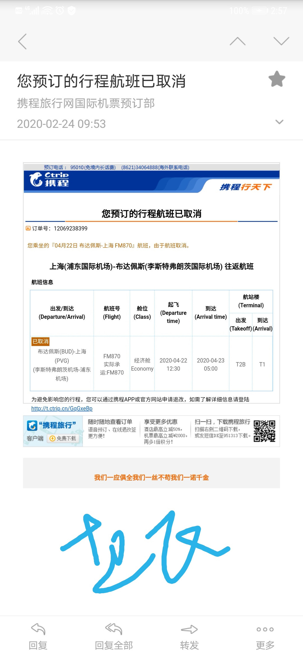 2、突如其来疫情打破所有,首先是东方航空上海往返布达佩斯机票取消!票款原路返回也就一周时间差,佐证材料简单,回款单一,这就是东西文化及办事效率差别,有幸生在红旗下长在红旗下,感受祖国的强大,感恩身为中华儿女的幸福大爆棚,感恩中华文明的生命至上人民至上。欧洲境内的航班携程都协助办理网上自动值机申请,白忙乎咯!