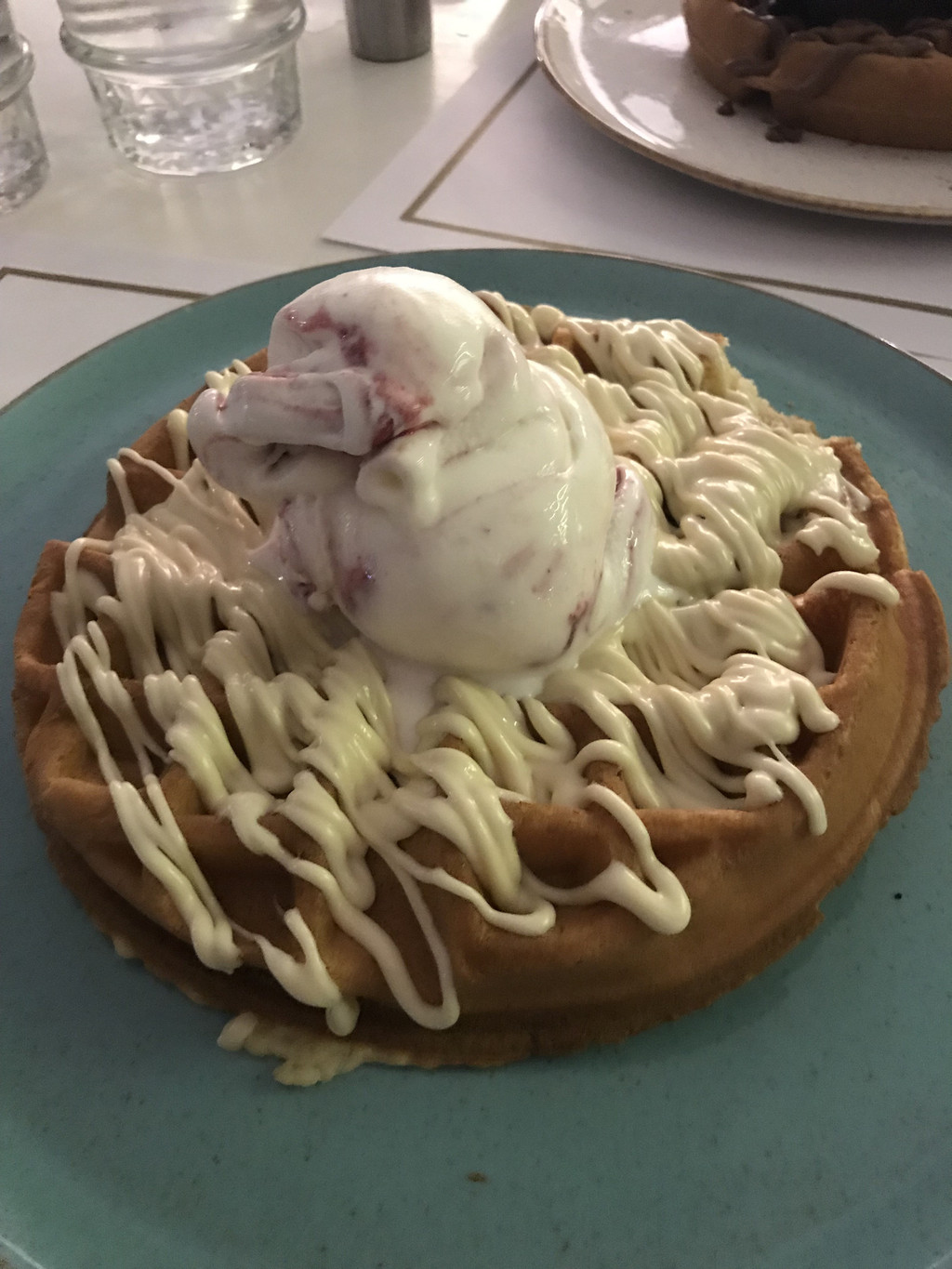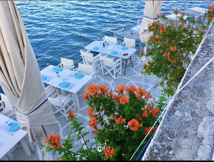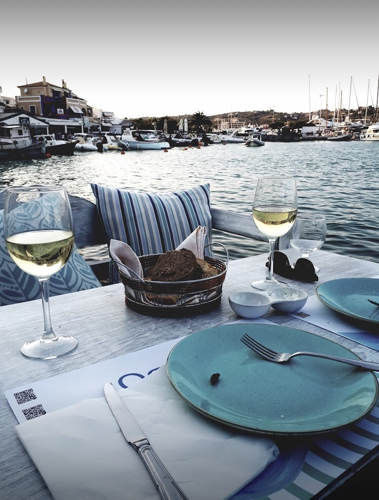 海港中停靠着游艇,周边甜品店,餐厅,酒吧,咖啡厅等一应俱全。我们是在家里用的晚餐,晚上和其他三个朋友约着去外面喝点东西。希腊的夜生活晚上9点刚刚开始。我们在Ostria餐厅喝了红酒。这家餐厅喝咖啡,红酒,鸡尾酒或者吃海鲜,希腊餐等都可以选择这里,很受欢迎。紧挨一座蓝白色教堂,教堂尽显神圣与纯洁。坐在一楼户外的座位,紧临着海,聆听着海浪声,看着海里自由的鱼儿,还有那远处的月亮,举一杯红酒与朋友共饮,真的是一副美好的画面。就这样在这里聊到凌晨3点(这可是正常的希腊夜生活哦)。