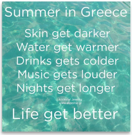 这就是希腊的夏日假期时光,不论去往希腊的任何角落,你都不会失望。如同下面的图片中的文字:希腊的夏季——更健康的肤色,更温暖的海水,更冰凉的酒水,更嗨的音乐,更漫长的夜,更棒的生活!