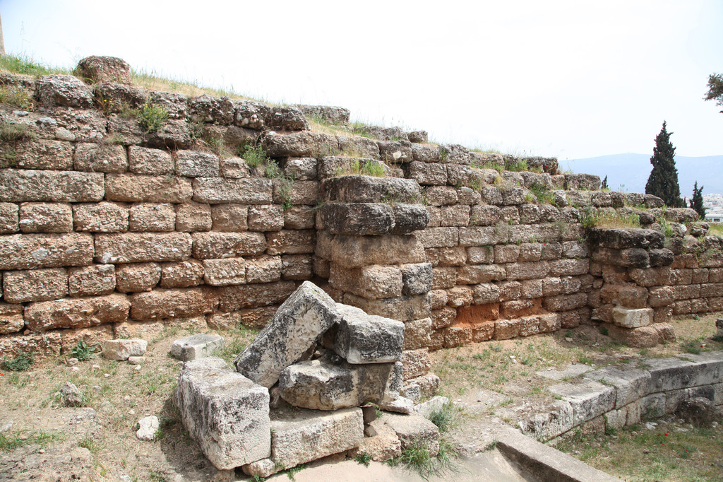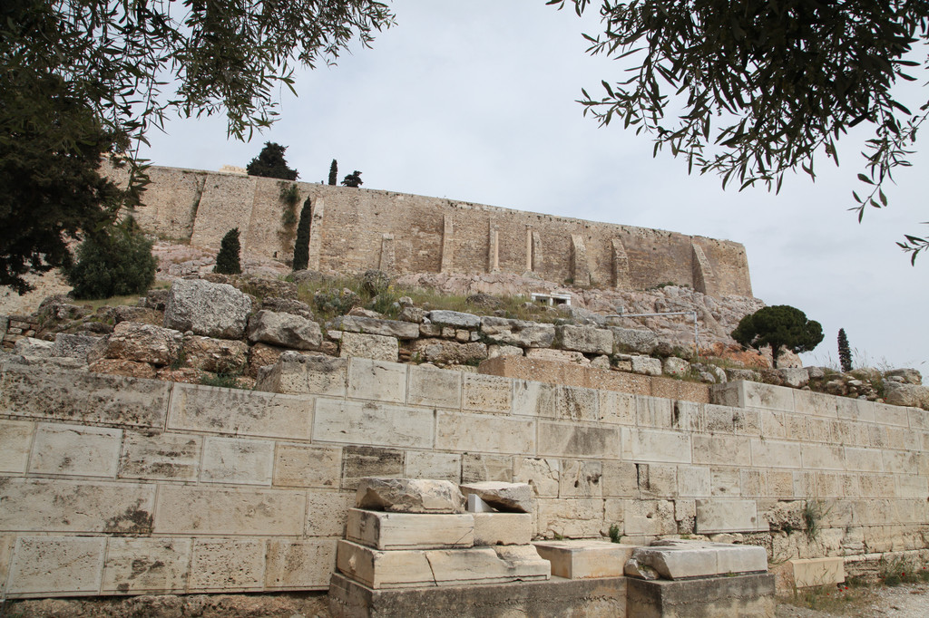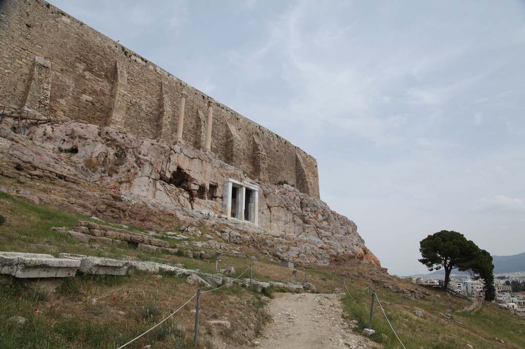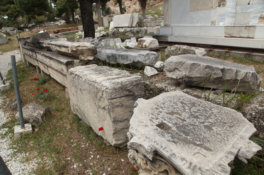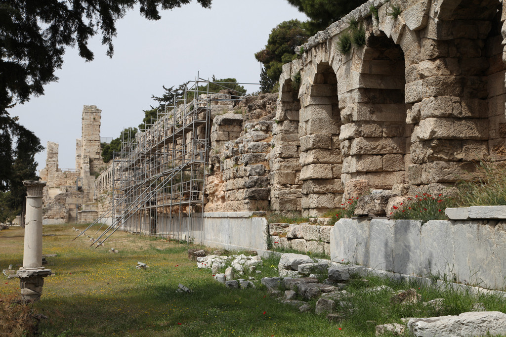 绕着雅典卫城南侧险峻的山崖,我们拾阶而上,晴朗的天空下,浩云如兰,满地花香,一路上望去都是高大的残亘断柱,分布于乱石嶙峋的山岗上,透着岁月的沧桑,闪烁出昔日灿烂靓丽的文化记忆。这些精美华贵的石刻残片,昭示着昔日卫城雍容华贵与典雅辉煌的历史。