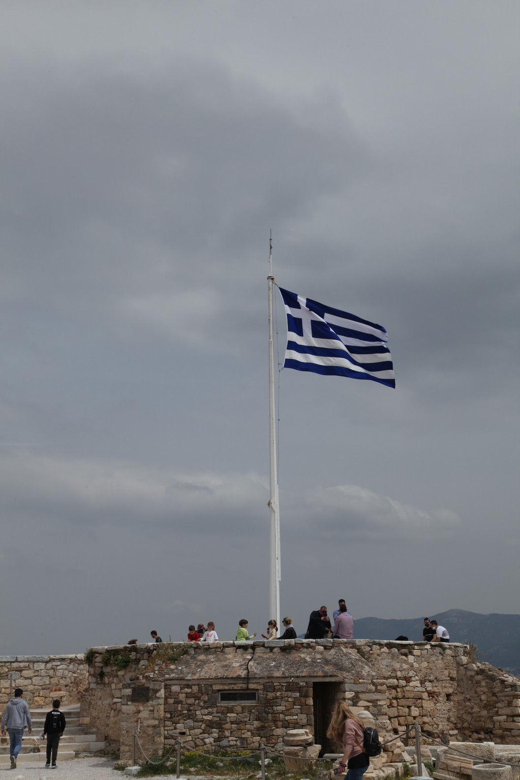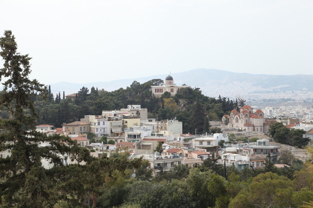 走向东面的观景台,头顶的希腊国旗旌旗猎猎,迎风招展。凭栏远眺,远处的爱琴海,波光粼粼,烟波浩渺,一望无垠的幽深与澄蓝。深吸一口气,卫城近在眼前,触手可及,俯瞰下方,雅典市容风貌尽收眼底,别有韵味。
