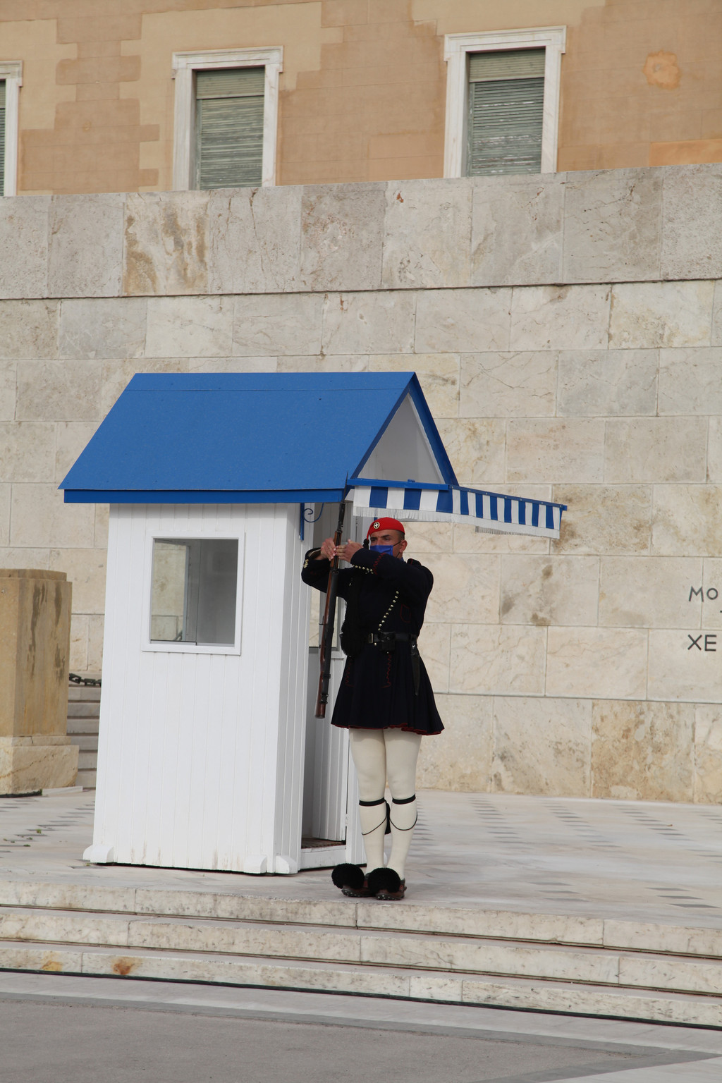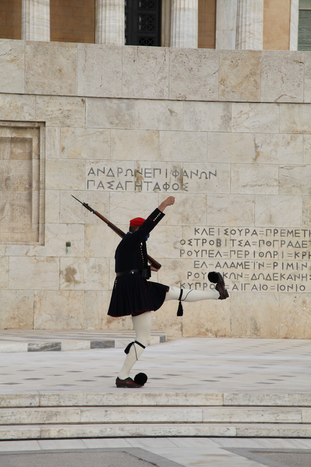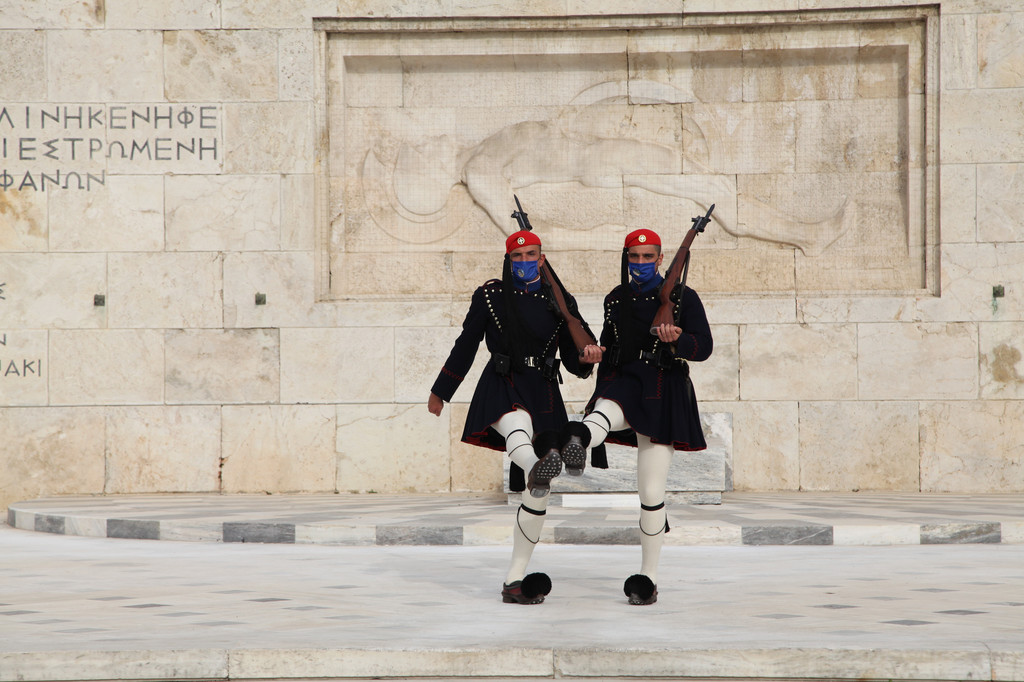 从卫城山巅走下来,我们去了西北角的一座山岩巨石组成的高地,那是观赏卫城日落的最佳处。有很多游客,三五成群,端坐于岩石旁,观赏着雅典市容的大街小巷。最后,我们徒步850米,来到宪法广场,观赏正在举行的希腊国会大厦的卫兵换岗仪式。