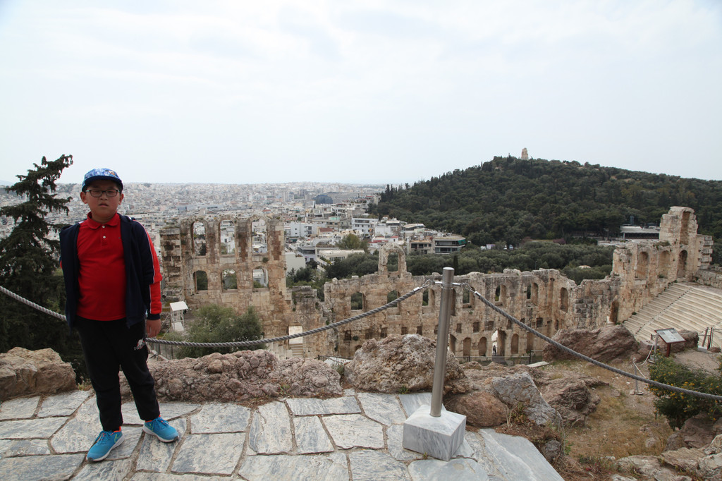 继续向山上爬去,不一会来到位于东南角的希罗德阿提库斯音乐厅(Odeon of Herodes Atticus),这是一座三层式的建筑结构,可容纳6000多人,是一座更加高耸华丽的音乐厅,两侧居然各立有一个高大的拱廊,增添了几分富丽堂皇的美感。音乐厅建于罗马时代,沿用至今,应该是世界上使用时间最长久的剧场,延续数千年,独一无二。该音乐厅半圆型的剧场直径38米,在任何一点都能听清楚舞台上演员的台词及音乐席的表演。