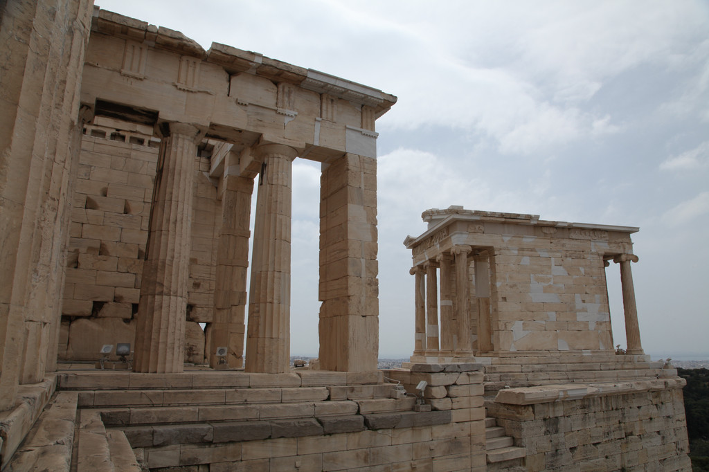 雅典娜胜利女神庙(Temple of Athena Nike),也称无翼胜利女神殿。位于卫城前门南翼旁,是座具有爱奥尼亚式列柱的优美神殿。传说雅典市民为了使胜利永驻,就将胜利女神的双翼砍下,这就是无翼胜利女神殿的由来。这座神殿历经兴废盛衰与战火洗劫,17世纪英国人又拆走了许多浮雕,到21世纪就只剩下几座11米高的圆柱。