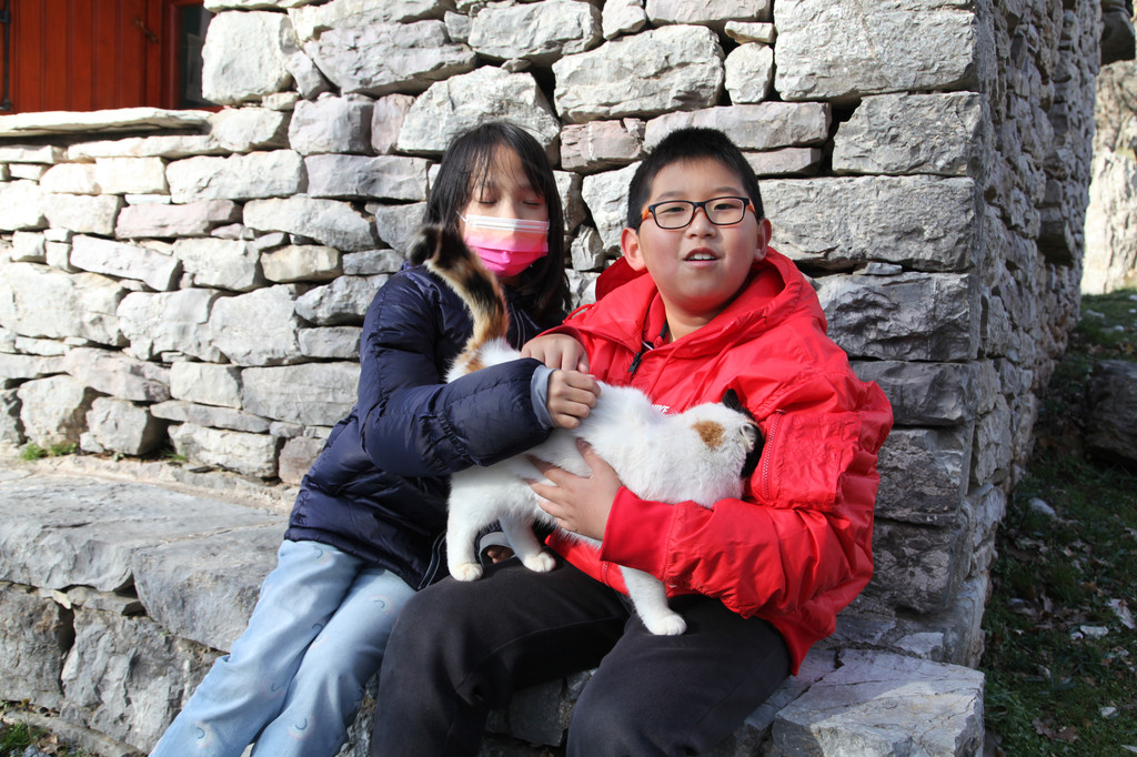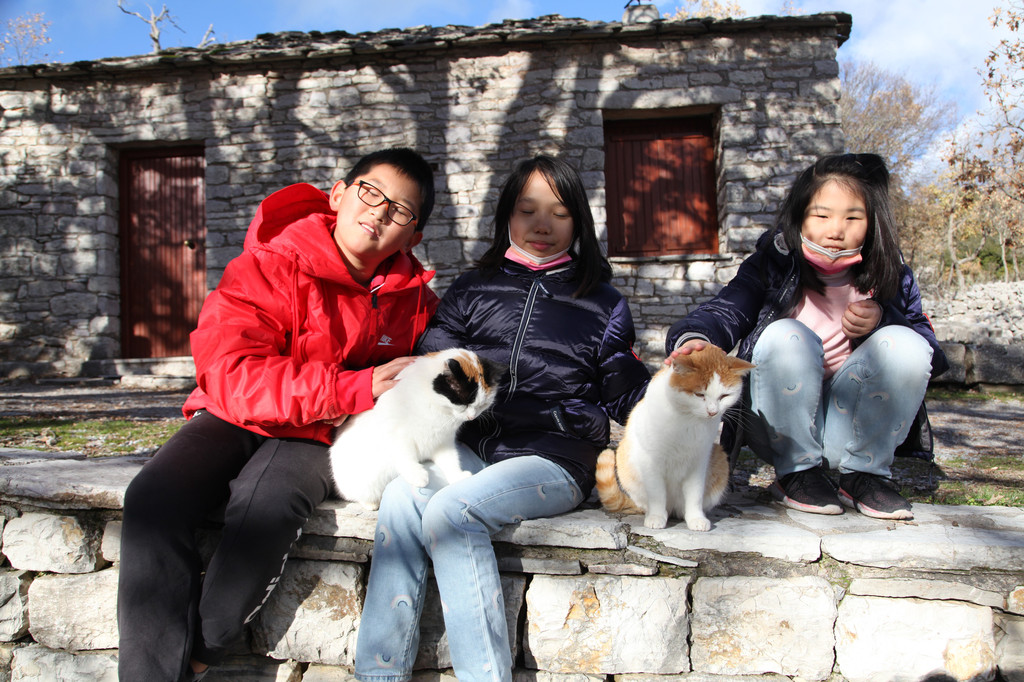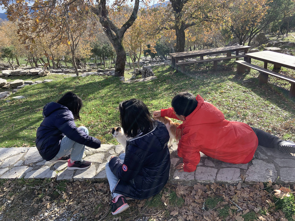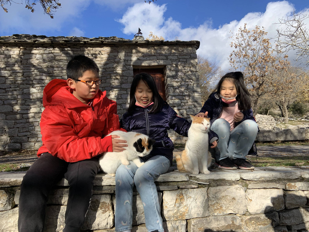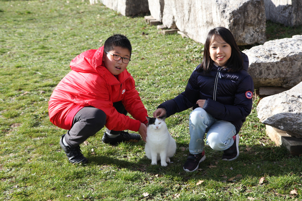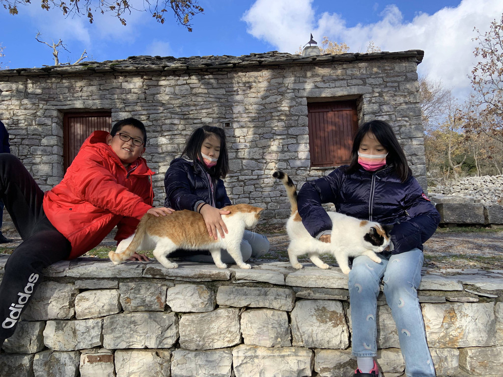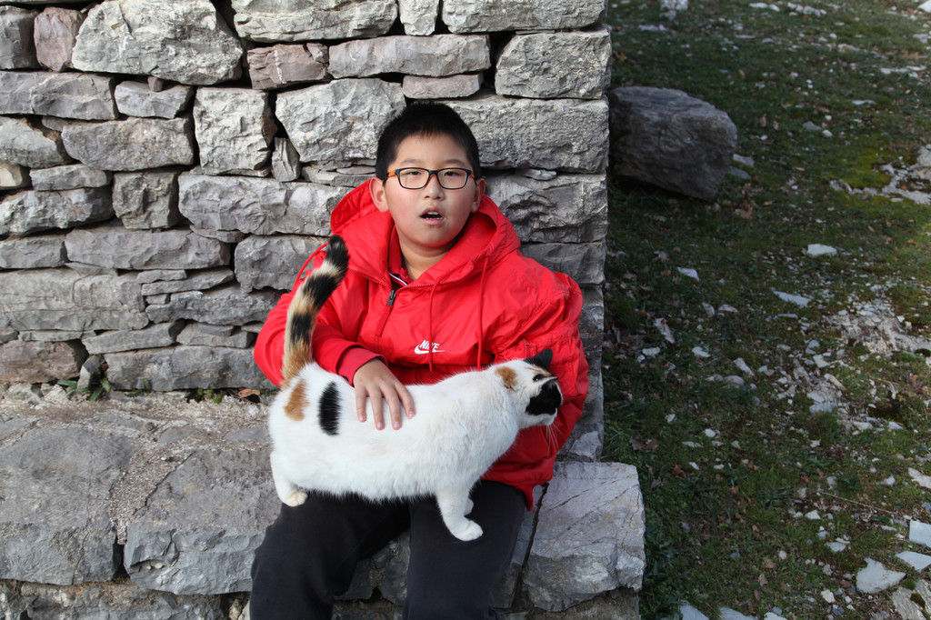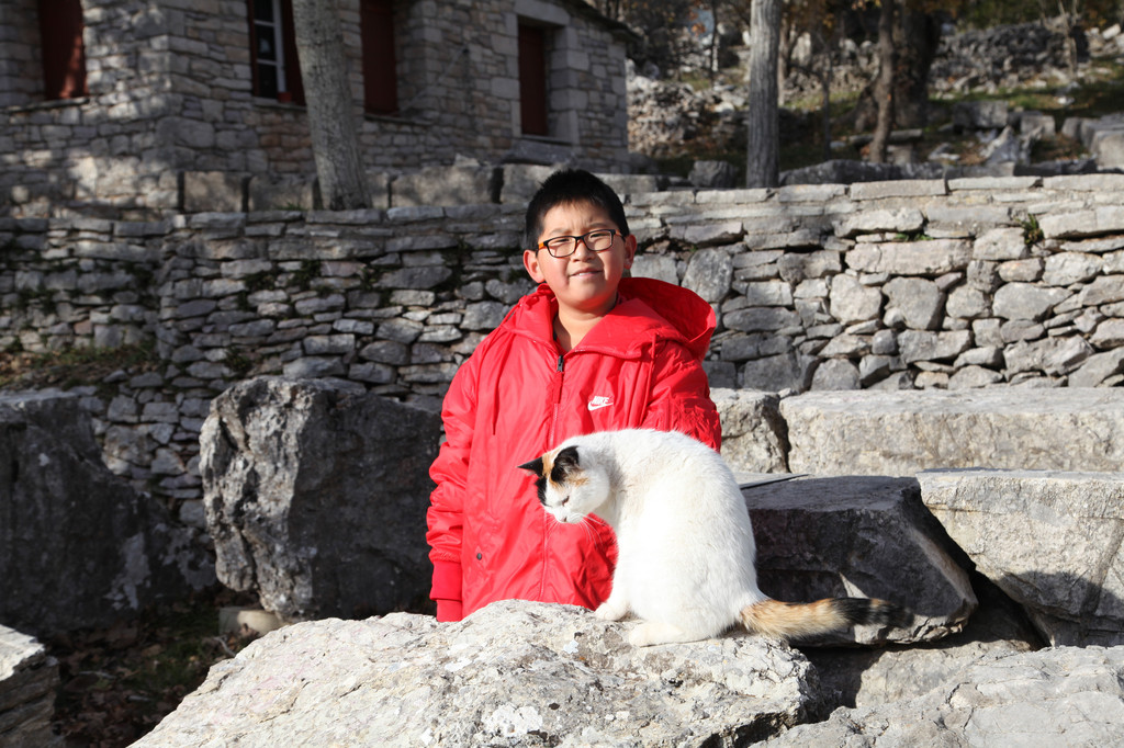 然后我们沿着山道往上走,来到一座文物修缮及保护点。午后的阳光金灿灿的,十分温暖。几个孩子,正在围着一群野猫咪玩儿。Keith特别胆大,用双手抱住一只大猫咪,轻抚着它的金色毛发,猫很听话地蹲在Keith身边,让我拍照,看来Keith训猫有一套的哦。