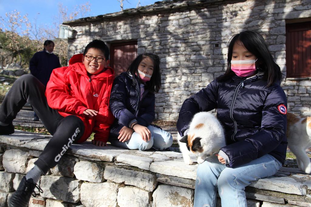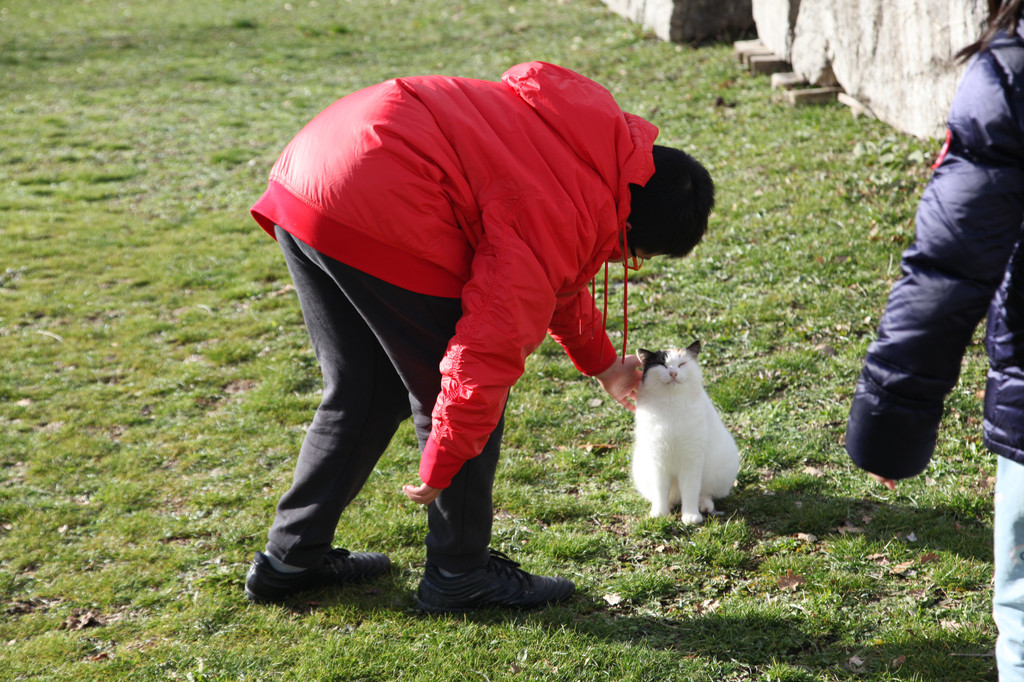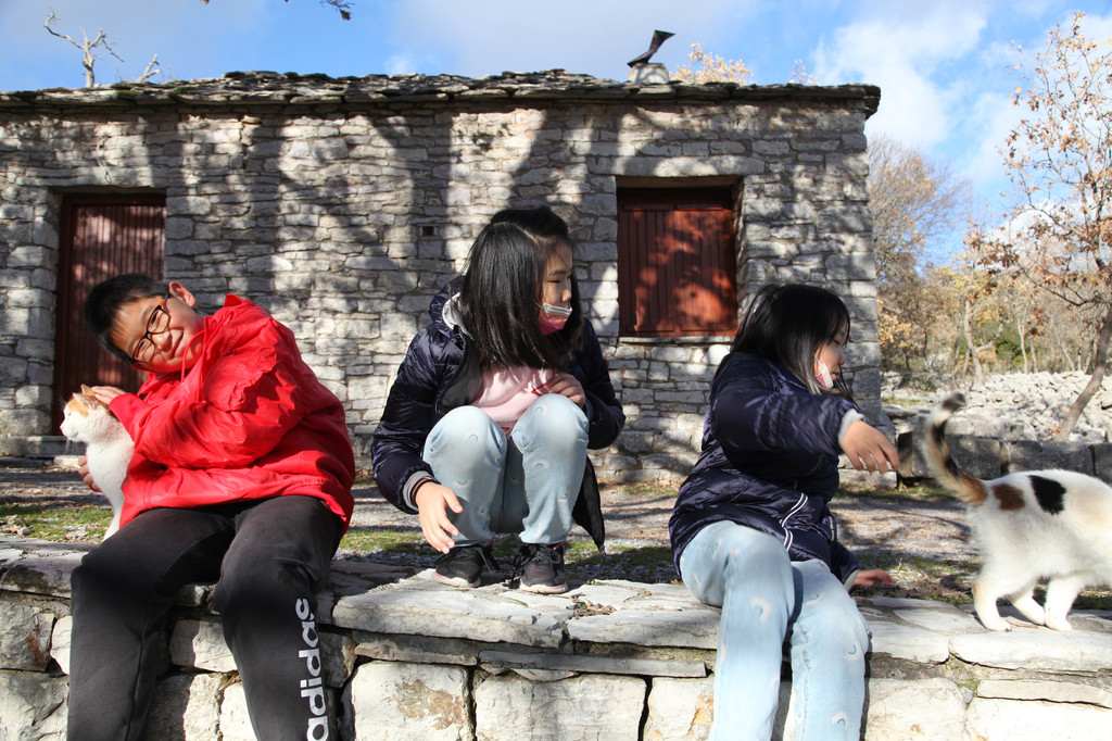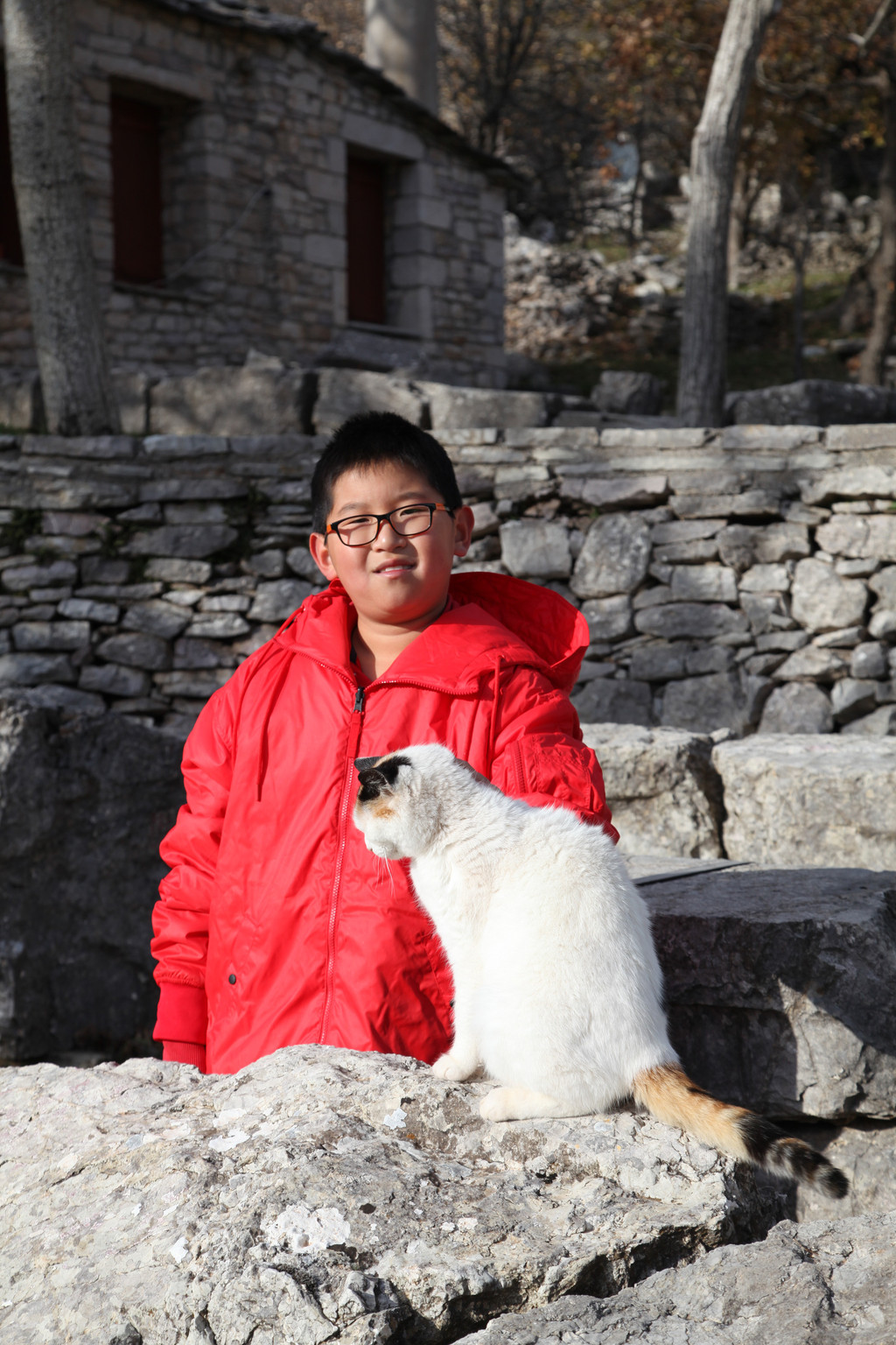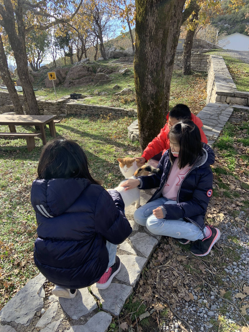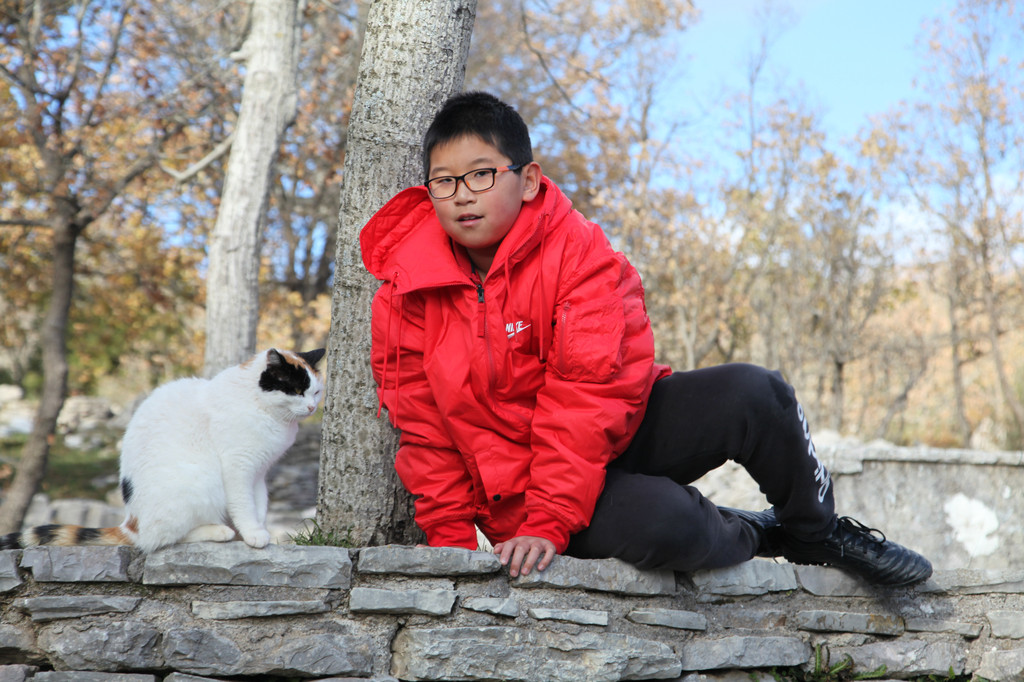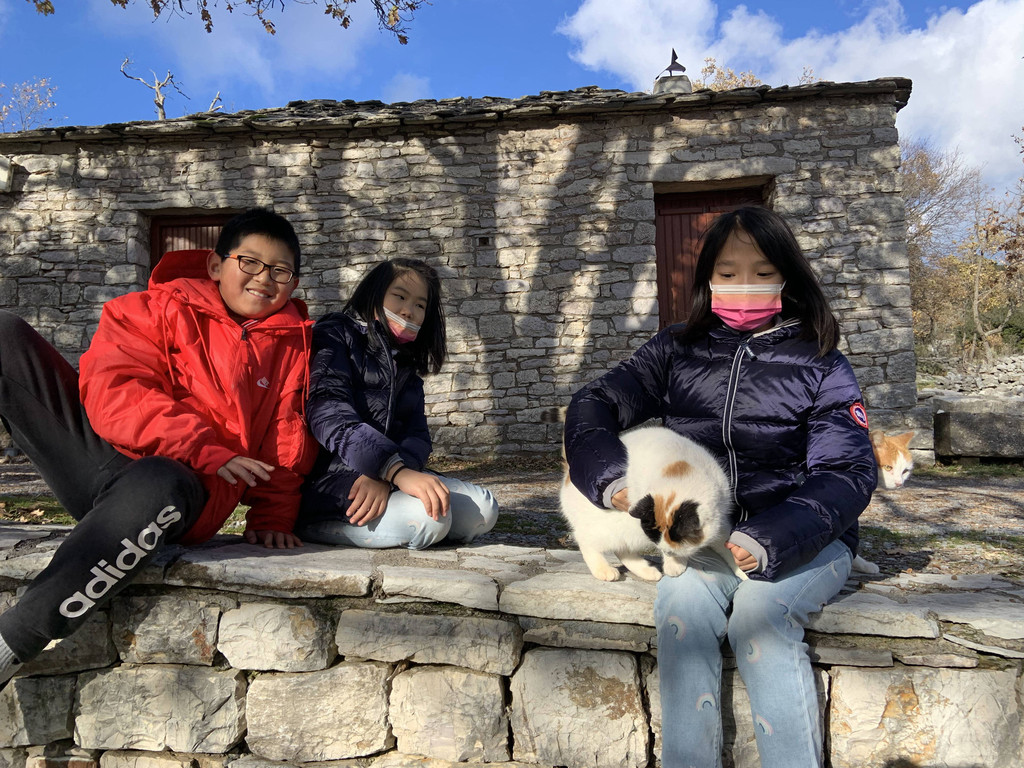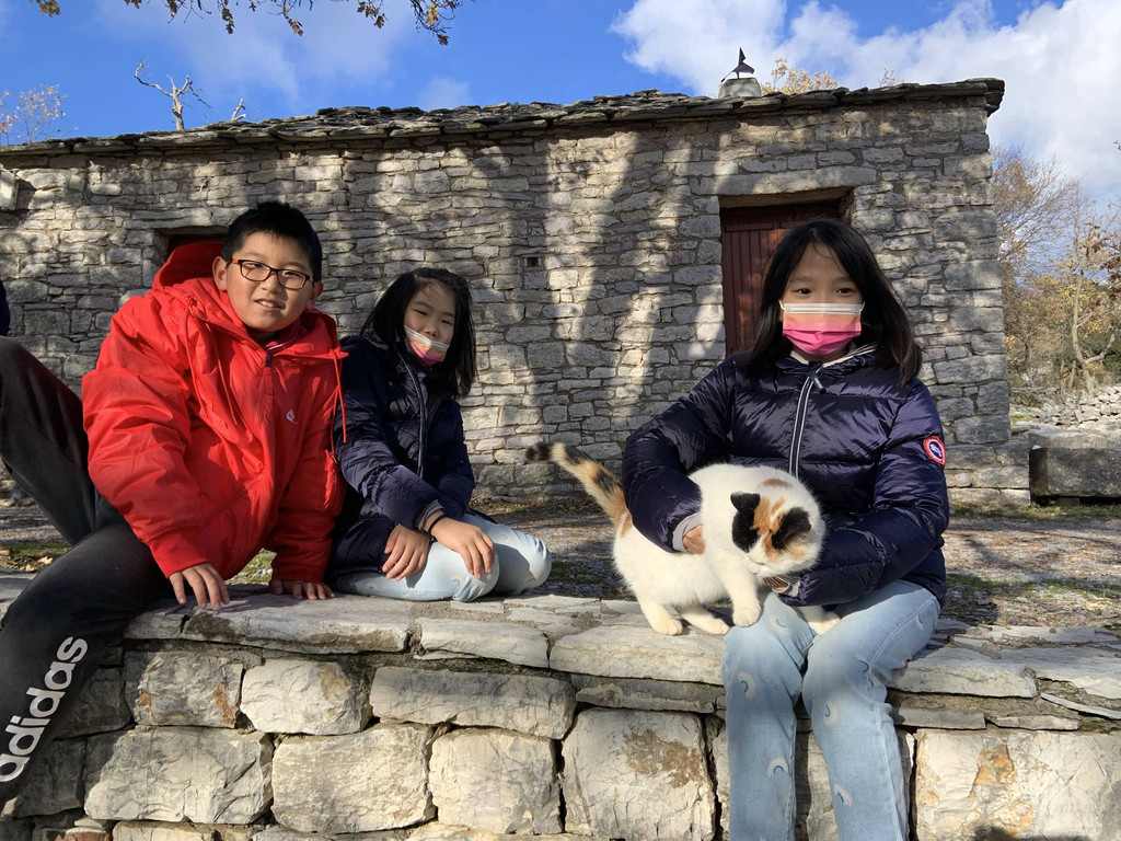 然后我们沿着山道往上走,来到一座文物修缮及保护点。午后的阳光金灿灿的,十分温暖。几个孩子,正在围着一群野猫咪玩儿。Keith特别胆大,用双手抱住一只大猫咪,轻抚着它的金色毛发,猫很听话地蹲在Keith身边,让我拍照,看来Keith训猫有一套的哦。