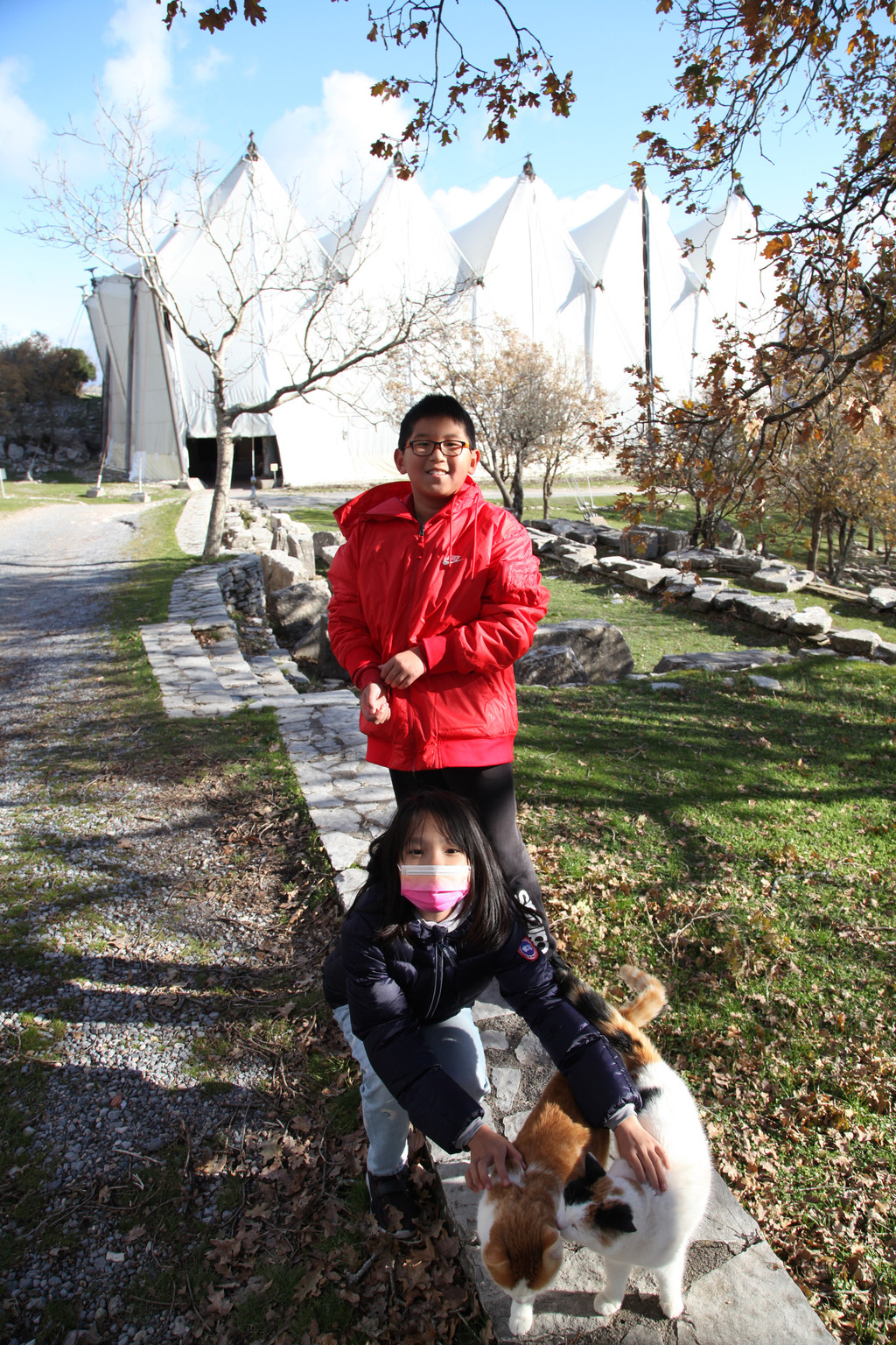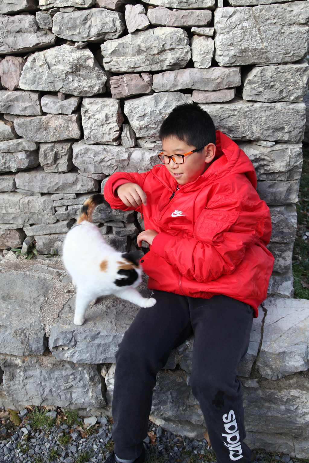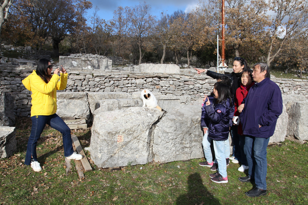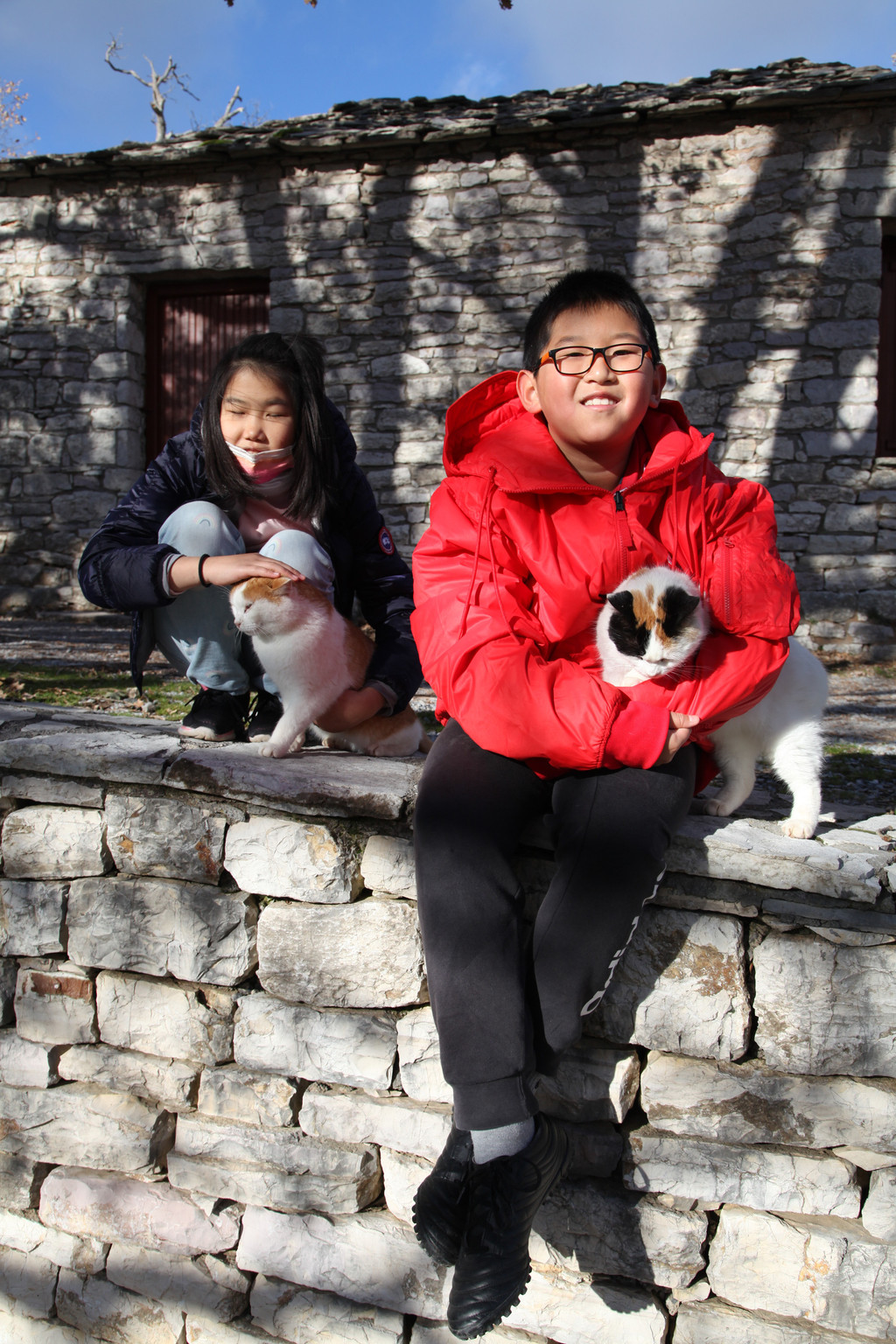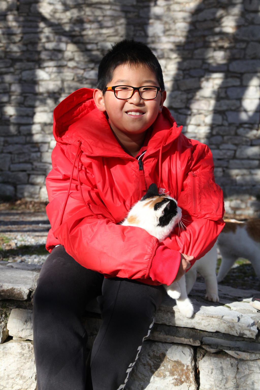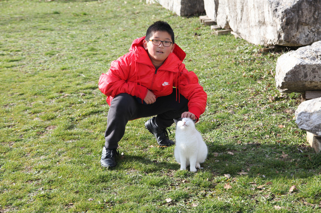 然后我们沿着山道往上走,来到一座文物修缮及保护点。午后的阳光金灿灿的,十分温暖。几个孩子,正在围着一群野猫咪玩儿。Keith特别胆大,用双手抱住一只大猫咪,轻抚着它的金色毛发,猫很听话地蹲在Keith身边,让我拍照,看来Keith训猫有一套的哦。