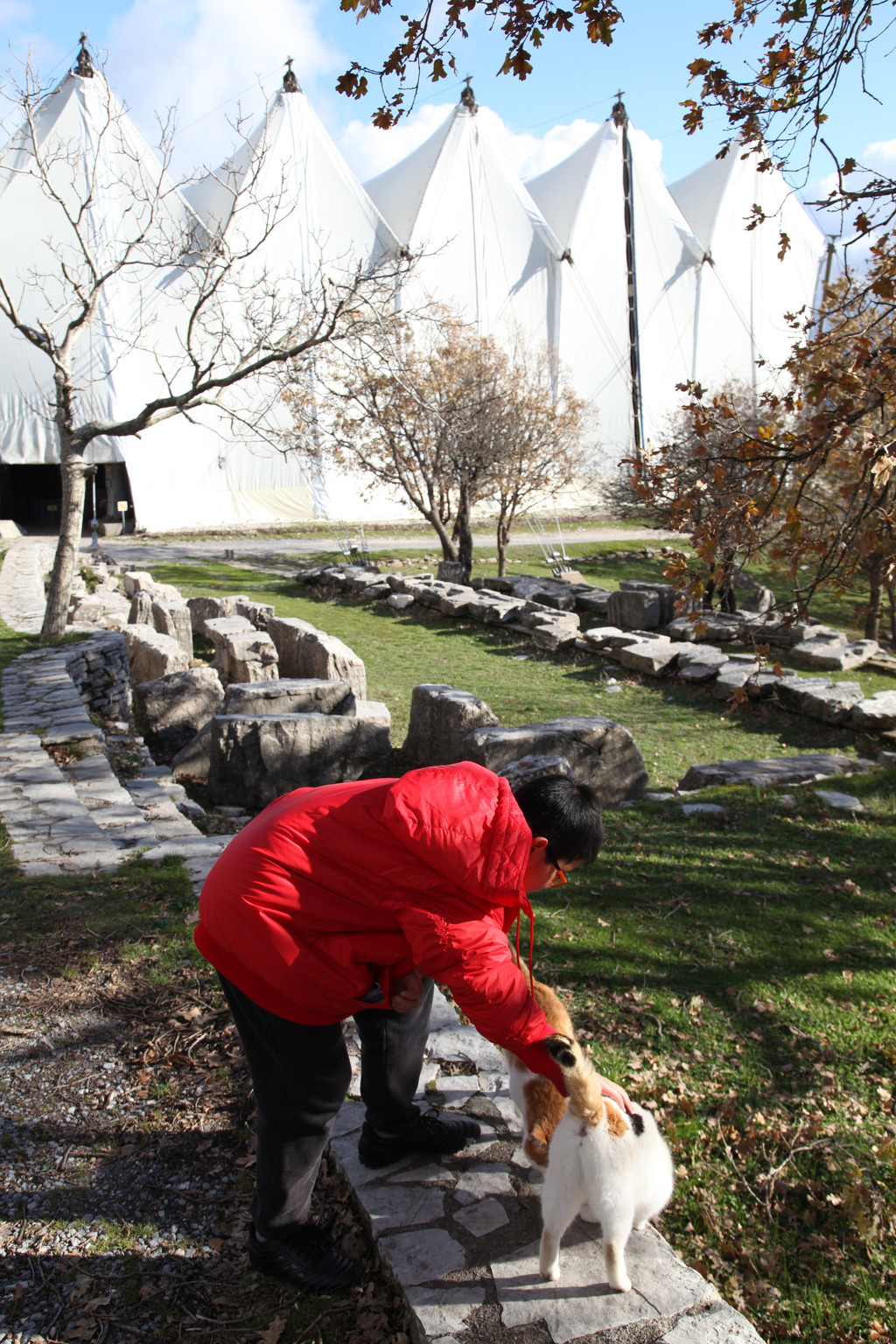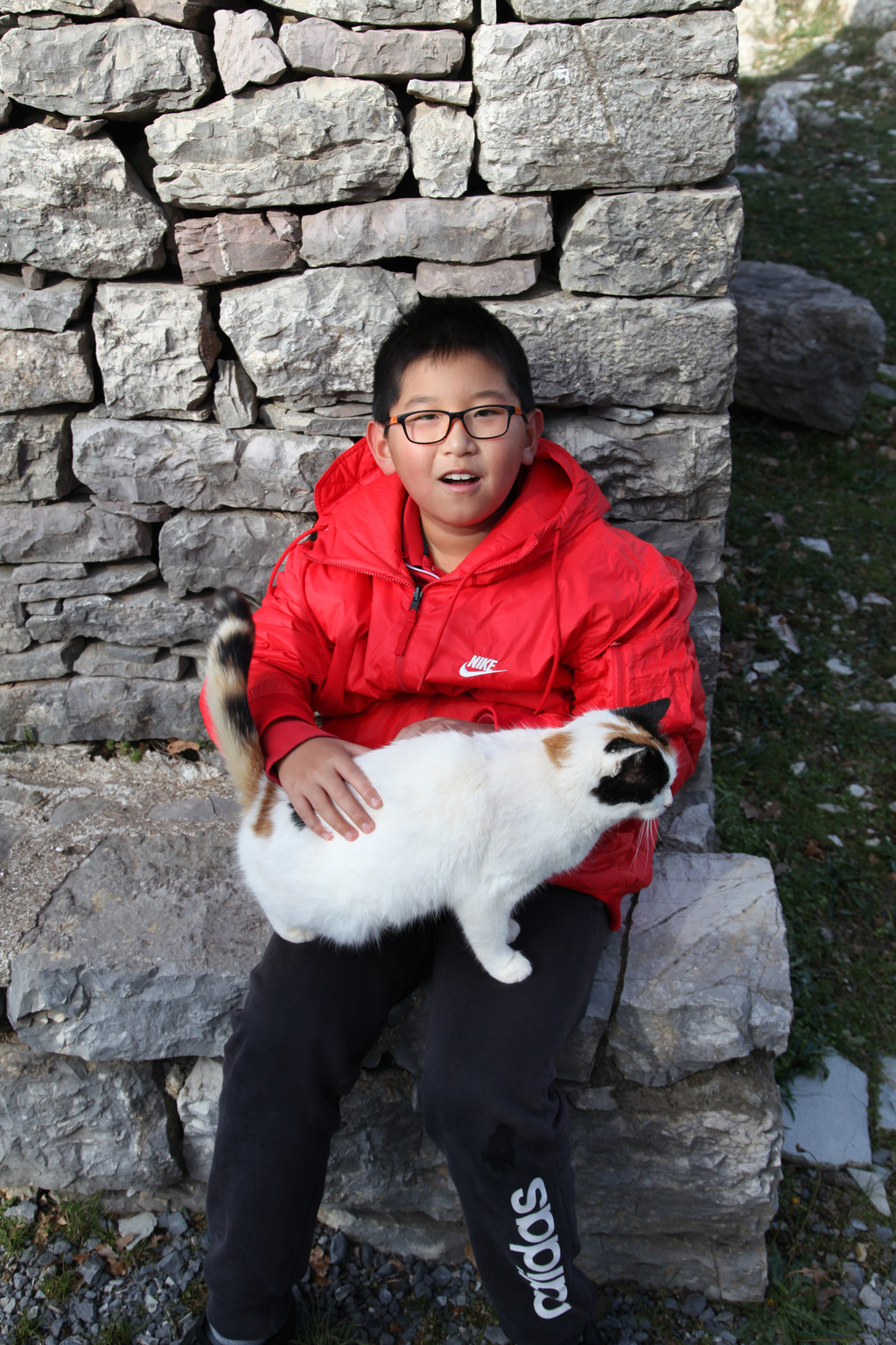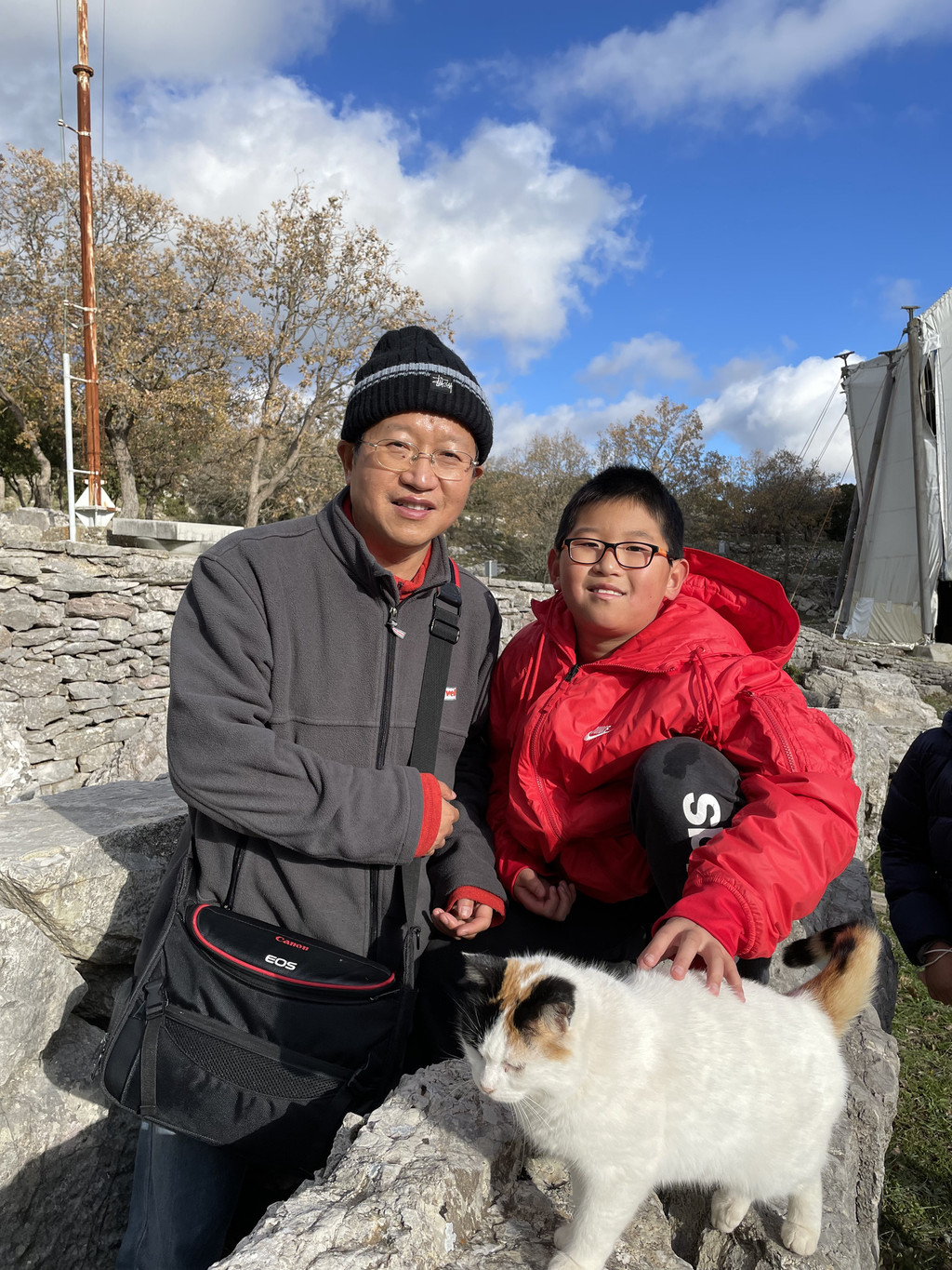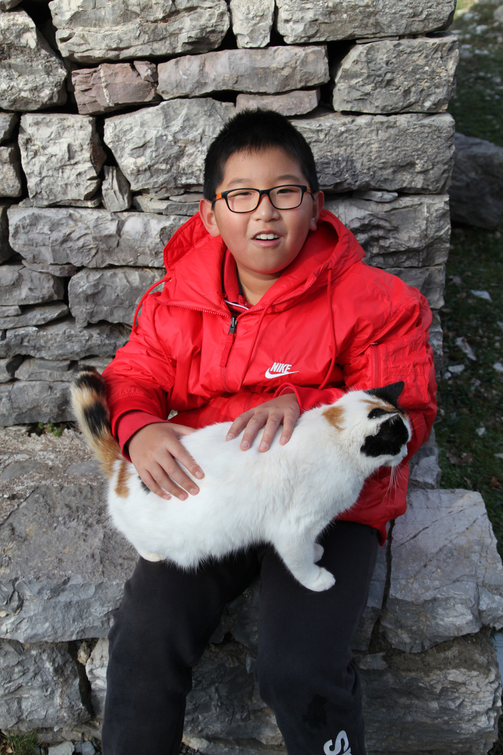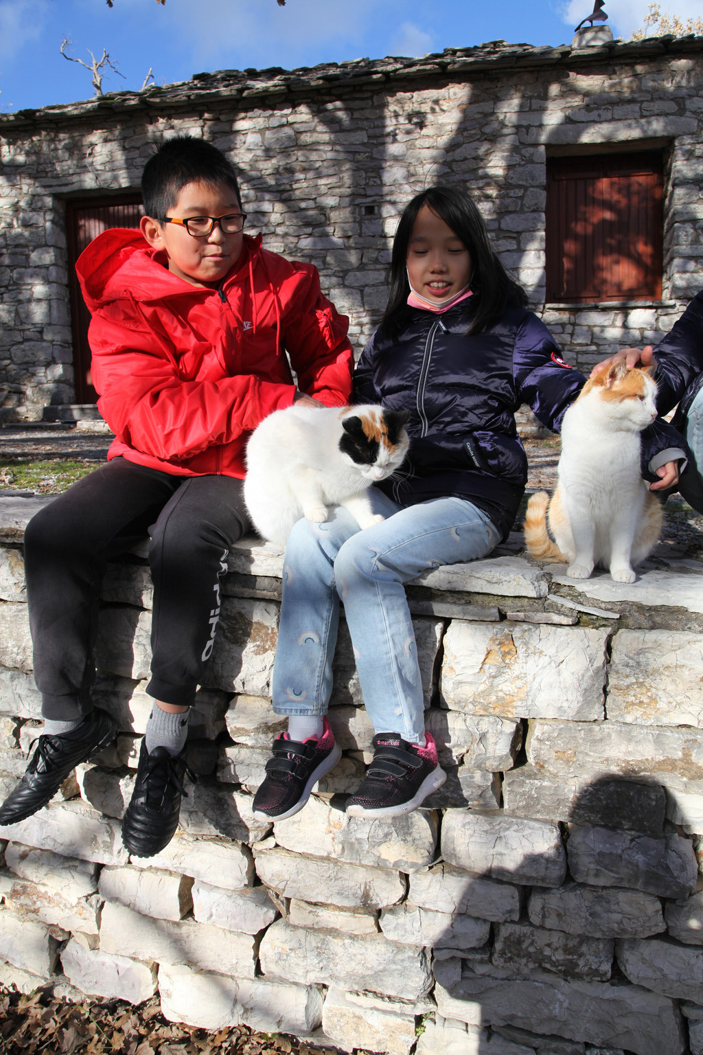 然后我们沿着山道往上走,来到一座文物修缮及保护点。午后的阳光金灿灿的,十分温暖。几个孩子,正在围着一群野猫咪玩儿。Keith特别胆大,用双手抱住一只大猫咪,轻抚着它的金色毛发,猫很听话地蹲在Keith身边,让我拍照,看来Keith训猫有一套的哦。