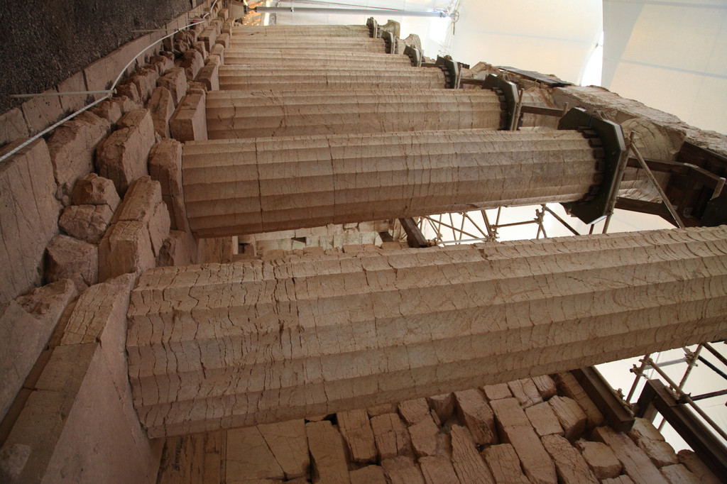 整个下午,就我们这组游客,享受着包场的待遇。空旷的山野里,冷风阵阵,清凉肃穆。神庙前的山谷原野上,到处散落着残墙断瓦与碑廊亭柱,给人风华散去的抱憾感觉。但那些片瓦残柱上所镌刻的精美图案和艺术雕饰,那些处处散发出的与世俱来的优雅典藏的大师风范的艺术创作,不由得令人徒生一种悲壮而壮阔的豪情与钦佩之心。
