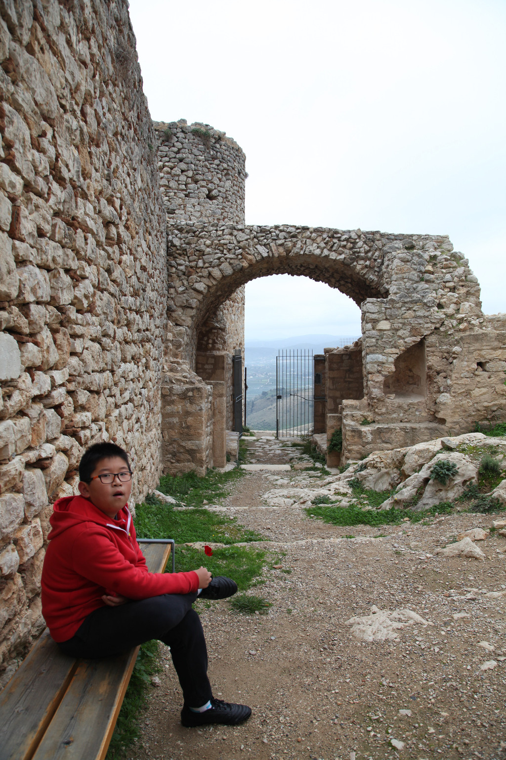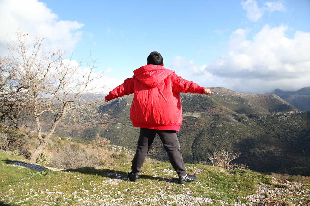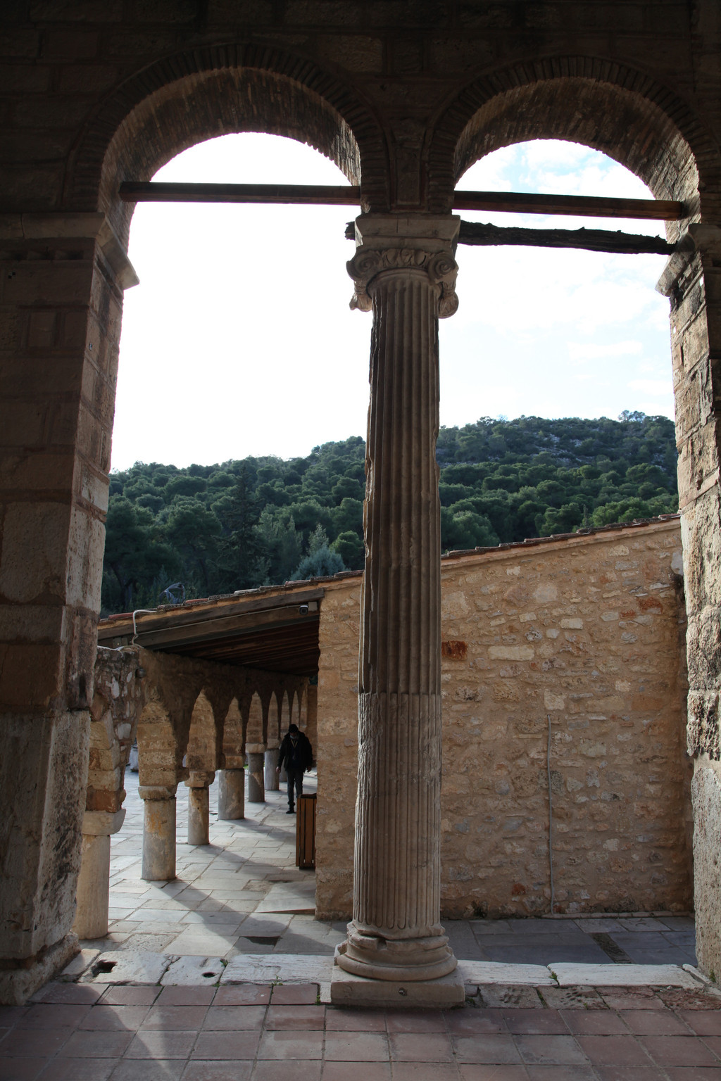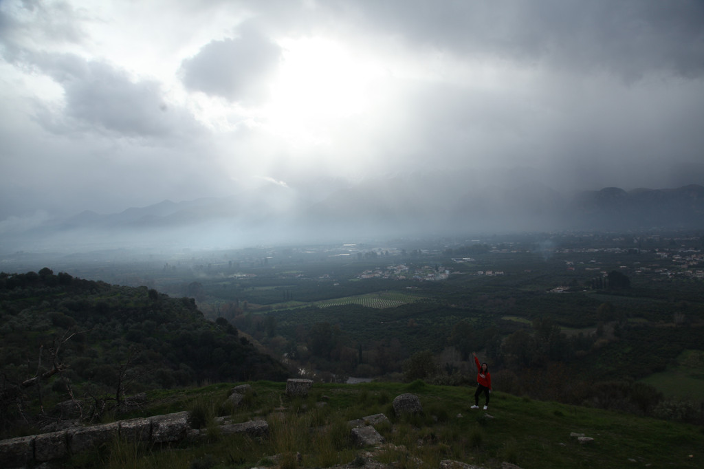 Keith躲在那根古代阿波罗神庙残留的古迹——爱奥尼柱廊前,凹出各种造型,让我拍照留影。游玩40分钟后,我们驱车沿着科林斯方向的E94高速路,转道E65高速,奔着巴塞的阿波罗·伊壁鸠鲁神庙而来。