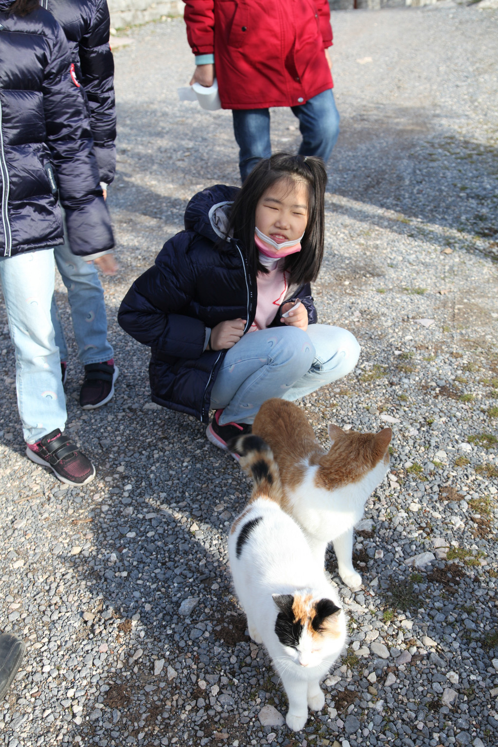那群有灵性的猫咪,居然也一直跟随着孩子们回到停车场。于是,一场猫咪的盛宴开始了,孩子们把自己吃的食物、各色零食全都拿出来喂猫咪,说要送猫咪们一顿圣诞大餐,看着那些猫咪吃得酣畅淋漓的,大家都很开心。
