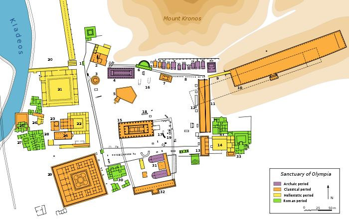 奥林匹亚早在公元前十世纪便成为宙斯崇拜中心,是泛希腊圣所并从公元前776年开始持续1100多年无间断地举办古代奥林匹克运动会的举办地。除寺庙与圣所外,这里还有奥林匹亚体育场等体育场馆遗迹。