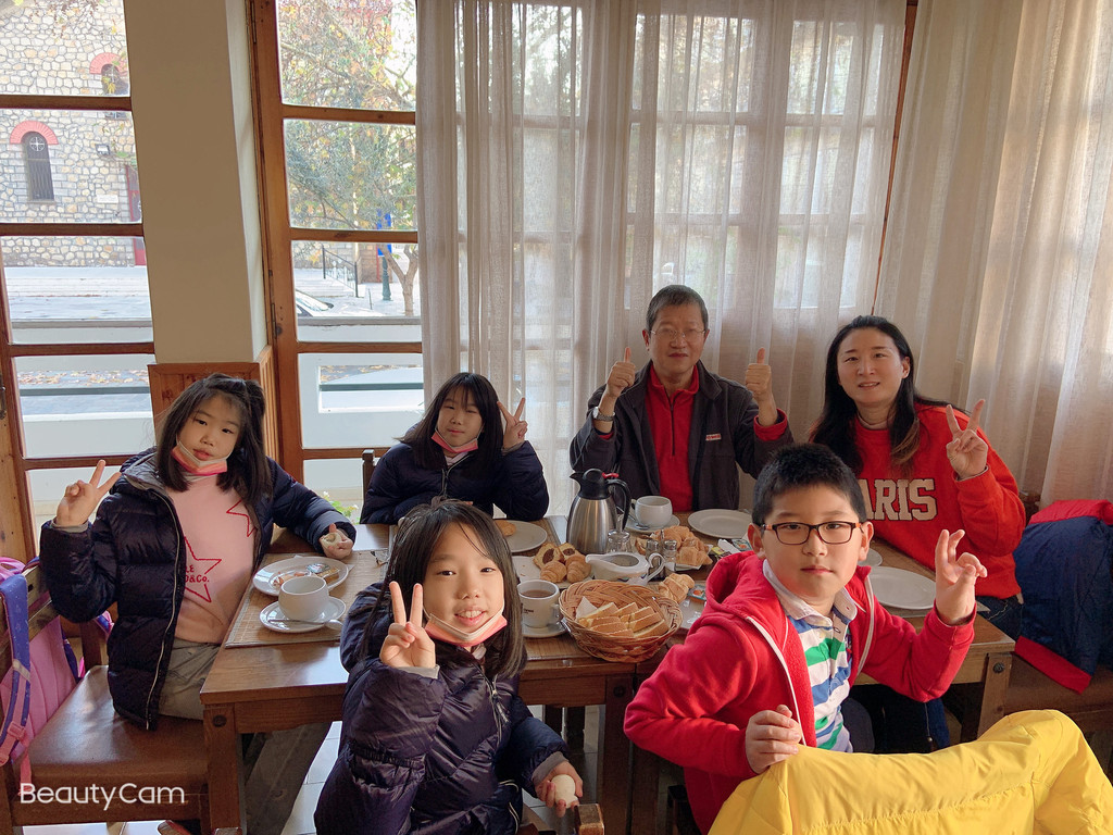 今天是平安夜,圣诞节的气氛越来越浓厚了。早晨下楼到餐厅吃早餐,发现餐厅布置得十分喜庆红火,壁炉的火也烧得通红,映红了我们的脸。早餐很不错,各式点心酱包一应俱全,老板亲自下厨,为我们准备早餐。朋友三个孩子,也是全免早餐。让我们感受到希腊人民的热情友善。