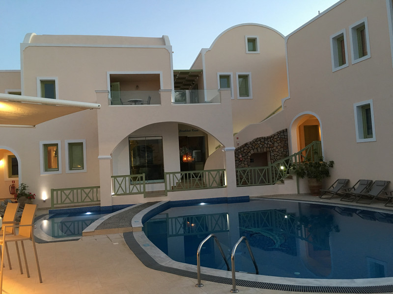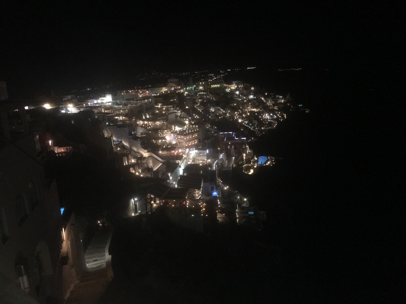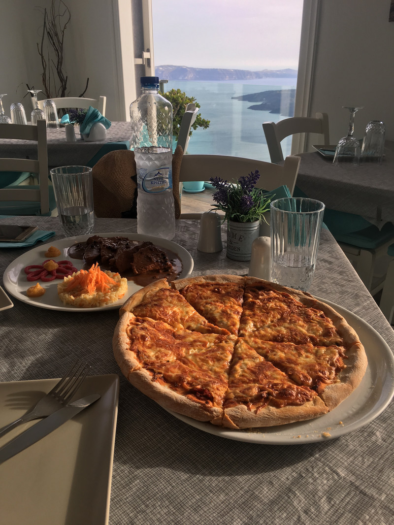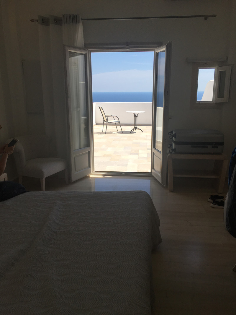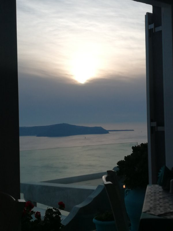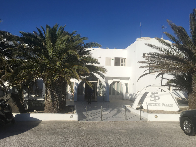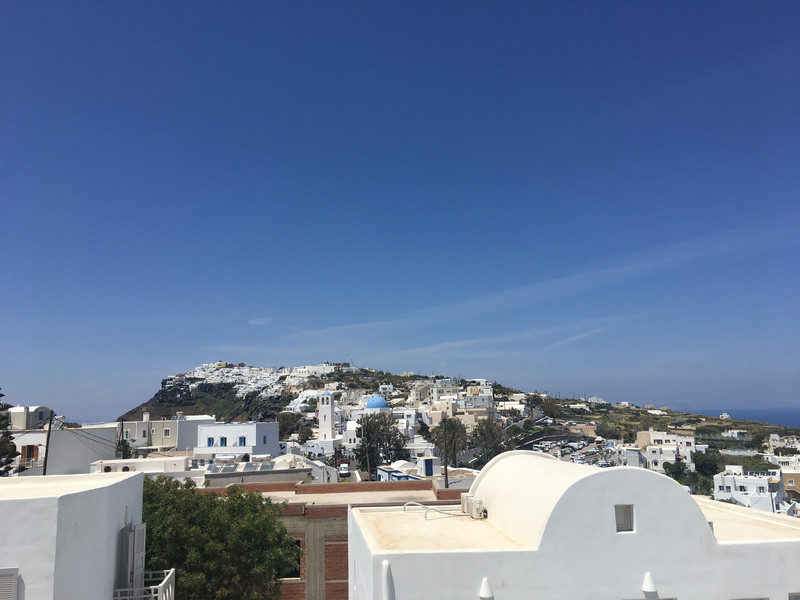 圣托里尼酒店(Santorini Palace),酒店很大,向迷宫一样,相信大酒店设施卫生服务相对较好,所以没敢定民宿,1400元/晚/间(含双早),但是这个酒店不属于悬涯酒店,只是部分房间为海景房,一开始酒店安排的是一楼房间,昏暗潮湿,一下子感觉受到了打击,感觉住了个地下室,经过前台沟通后换了二楼明亮一些的一间房。第二天中午在前台付了40欧的差价升级了4楼的海景房,这个房间还是不错的。前台两个小姑凉很nice,第二天带着我看了两个房间作选择,那个男士主管就扳着脸很严肃,付的差价也没给凭证。经验是酒店房间多,但差异很大,一定要现场才能看出好坏差别。如果不一定住悬崖酒店(悬崖酒店也是一定要现场才能看出位置好坏,而且大多是只有10间房以内的民宿),那卡马利和佩里萨海滩边的酒店性价比很高,又安静,吃饭也比费拉和伊亚便宜。 这一排的房间还是很不错的,预定时一定要发邮件告诉酒店 第一晚的房间非常普通,有一个小露台,啥也看不见。 第二天加钱升级后的房间,无敌海景还是不错的。 跟主管提出the higher the better的要求后,加钱升级到顶楼的房间。 房间内远眺。 岛上的公交巴士时间表,我们租了车,没有用到 酒店对面就是国家地理杂志某期封面--蓝顶教堂,也是看日落的绝佳位置 晚上吃中餐,来点家乡味道 圣岛夜景 早餐 费拉小镇的老码头、缆车、驴队 又是一个网红打卡点,走着路过就拍张照,不刻意。 最热门的伊亚小镇 伊亚看日落最佳地点 景致好的餐厅价格就贵点,牛排+披萨,45欧 边吃晚餐边欣赏日落 这些住宿房间位置很好,我现场看过啦,推荐给朋友们 三天才开了100公里,看了攻略加了15欧的油正好。租车期间遇到一次气不足,担心轮胎破了,语言沟通困难麻烦啊。去加油站充气,后来发现没事,轮胎没破。换车也很顺利,还是那位大叔,稍微看一下就OK了,目前反正没有收到任何不明扣款。