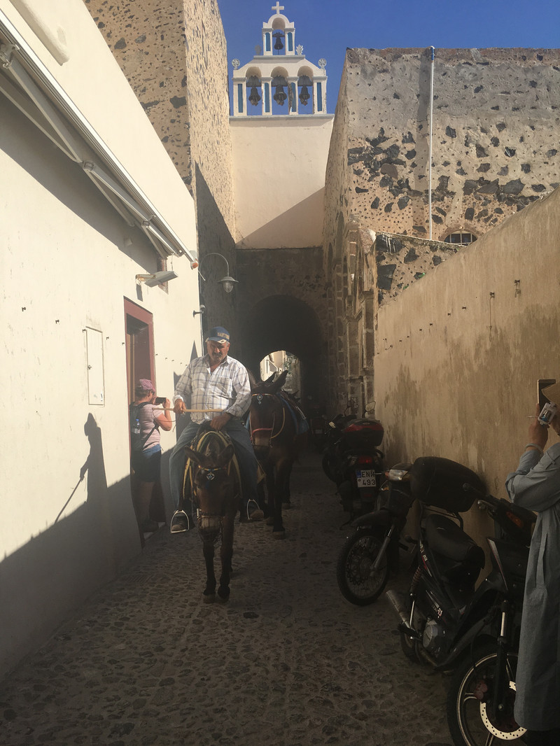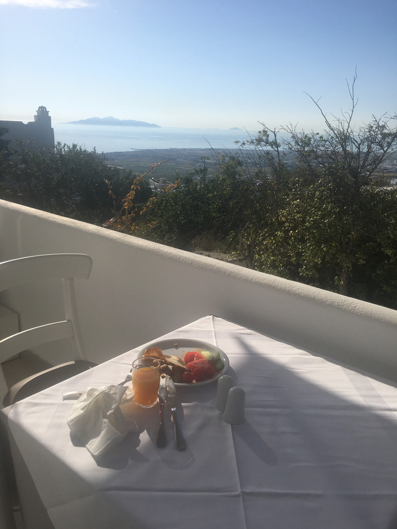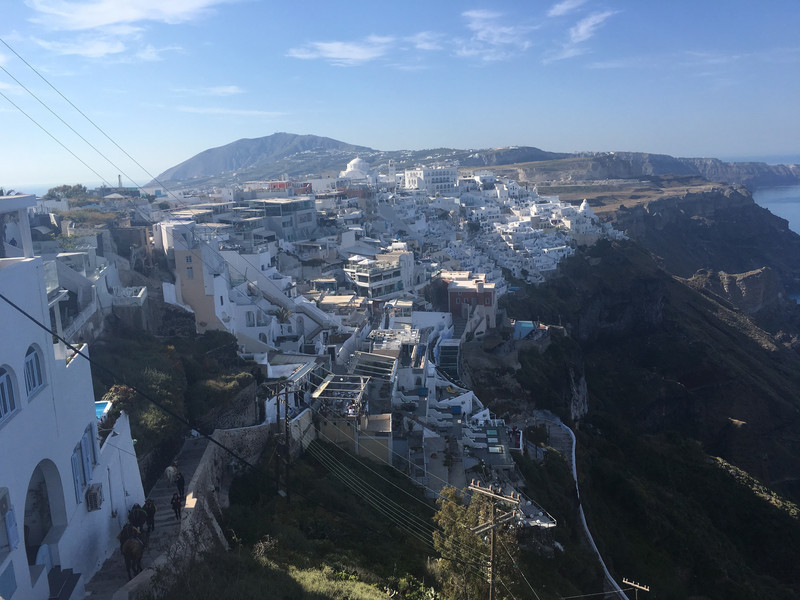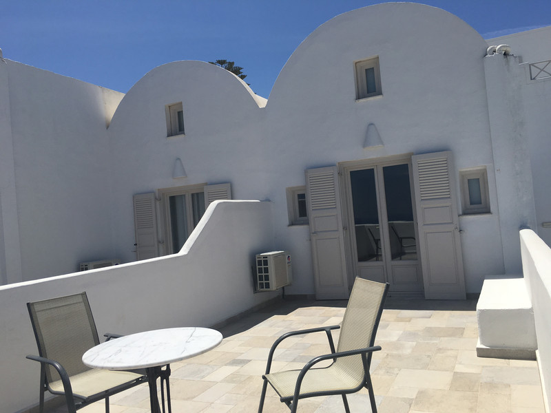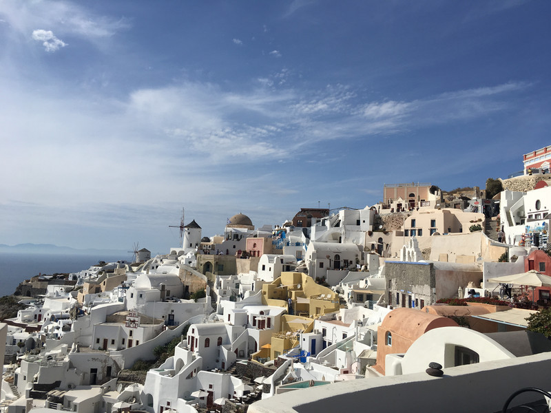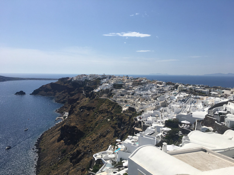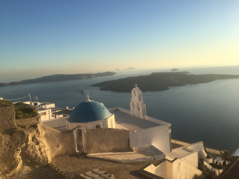 圣托里尼酒店(Santorini Palace),酒店很大,向迷宫一样,相信大酒店设施卫生服务相对较好,所以没敢定民宿,1400元/晚/间(含双早),但是这个酒店不属于悬涯酒店,只是部分房间为海景房,一开始酒店安排的是一楼房间,昏暗潮湿,一下子感觉受到了打击,感觉住了个地下室,经过前台沟通后换了二楼明亮一些的一间房。第二天中午在前台付了40欧的差价升级了4楼的海景房,这个房间还是不错的。前台两个小姑凉很nice,第二天带着我看了两个房间作选择,那个男士主管就扳着脸很严肃,付的差价也没给凭证。经验是酒店房间多,但差异很大,一定要现场才能看出好坏差别。如果不一定住悬崖酒店(悬崖酒店也是一定要现场才能看出位置好坏,而且大多是只有10间房以内的民宿),那卡马利和佩里萨海滩边的酒店性价比很高,又安静,吃饭也比费拉和伊亚便宜。 这一排的房间还是很不错的,预定时一定要发邮件告诉酒店 第一晚的房间非常普通,有一个小露台,啥也看不见。 第二天加钱升级后的房间,无敌海景还是不错的。 跟主管提出the higher the better的要求后,加钱升级到顶楼的房间。 房间内远眺。 岛上的公交巴士时间表,我们租了车,没有用到 酒店对面就是国家地理杂志某期封面--蓝顶教堂,也是看日落的绝佳位置 晚上吃中餐,来点家乡味道 圣岛夜景 早餐 费拉小镇的老码头、缆车、驴队 又是一个网红打卡点,走着路过就拍张照,不刻意。 最热门的伊亚小镇 伊亚看日落最佳地点 景致好的餐厅价格就贵点,牛排+披萨,45欧 边吃晚餐边欣赏日落 这些住宿房间位置很好,我现场看过啦,推荐给朋友们 三天才开了100公里,看了攻略加了15欧的油正好。租车期间遇到一次气不足,担心轮胎破了,语言沟通困难麻烦啊。去加油站充气,后来发现没事,轮胎没破。换车也很顺利,还是那位大叔,稍微看一下就OK了,目前反正没有收到任何不明扣款。