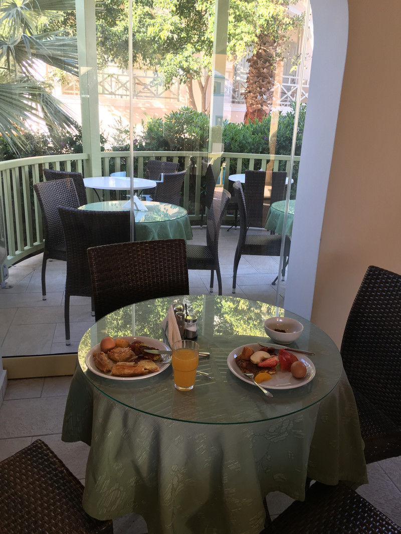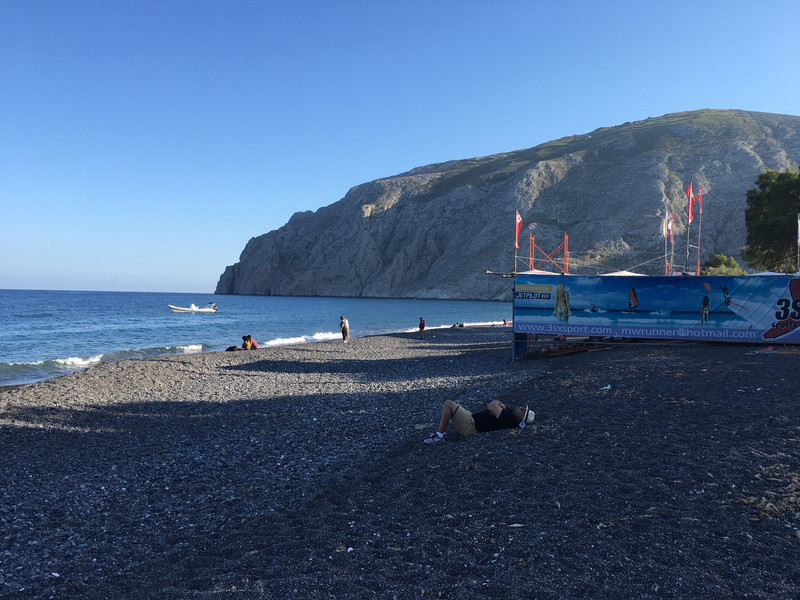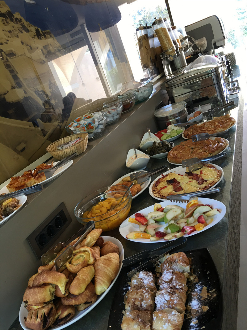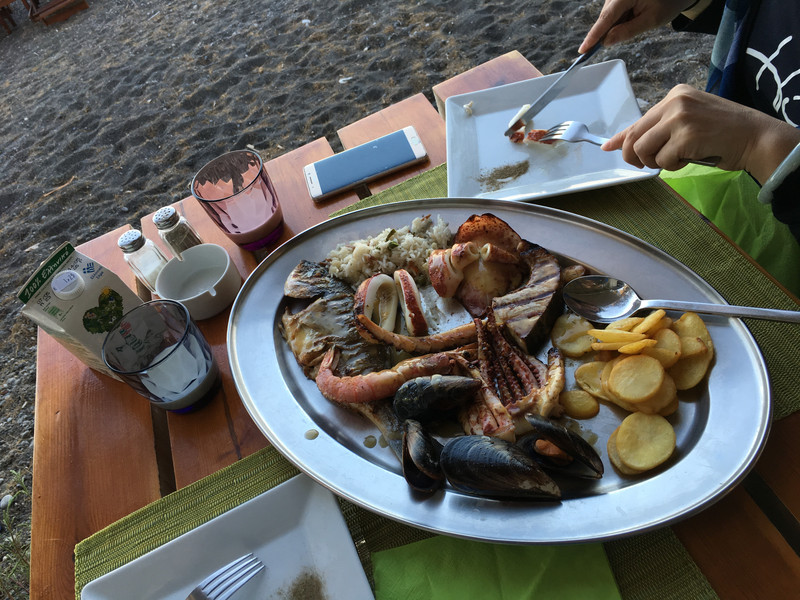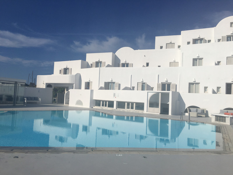酒店泳池 这个酒店在卡马里黑沙滩附近非常安静的地方,比费拉镇好多了,房价便宜,离黑海滩近,海边吃的又多,服务非常热情,还送了一个纪念杯子。 安萨豪华套房酒店早餐。 这个酒店的早餐味道很好 酒店出来走2分钟就到卡马里黑沙滩了 海边全是商店和饭店 服务员中文揽客,在这里吃了2顿 希腊大叔很配合拍照啊,哈哈 海鲜大餐19欧,著名的烤章鱼,超市买了当地的牛奶,服务员非常推荐,省了饮料费,哈哈。圣岛第二天就是开车环岛南部打卡各个景点,除了白沙滩因为那个路况(在这边可以叫荒废的石子小道)实在太差了,到了半路折返了,其他推荐景点全部走到了。