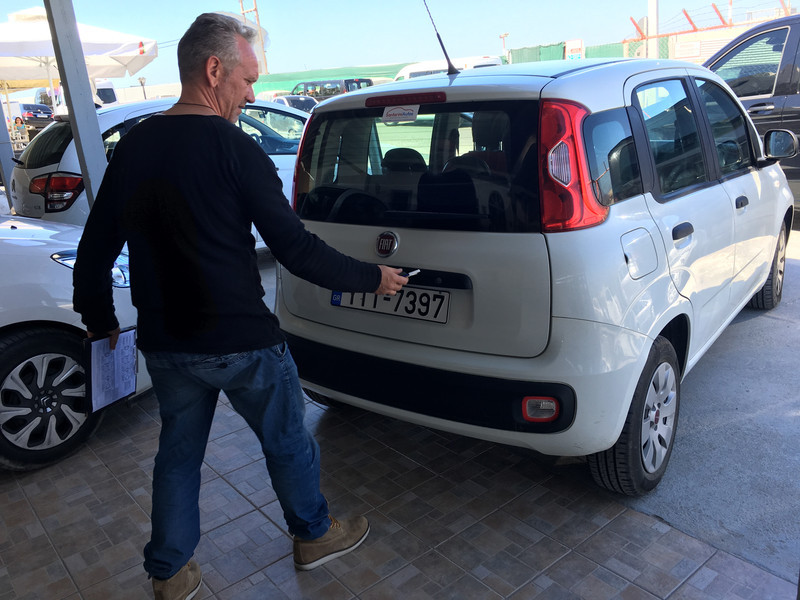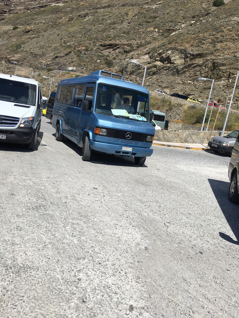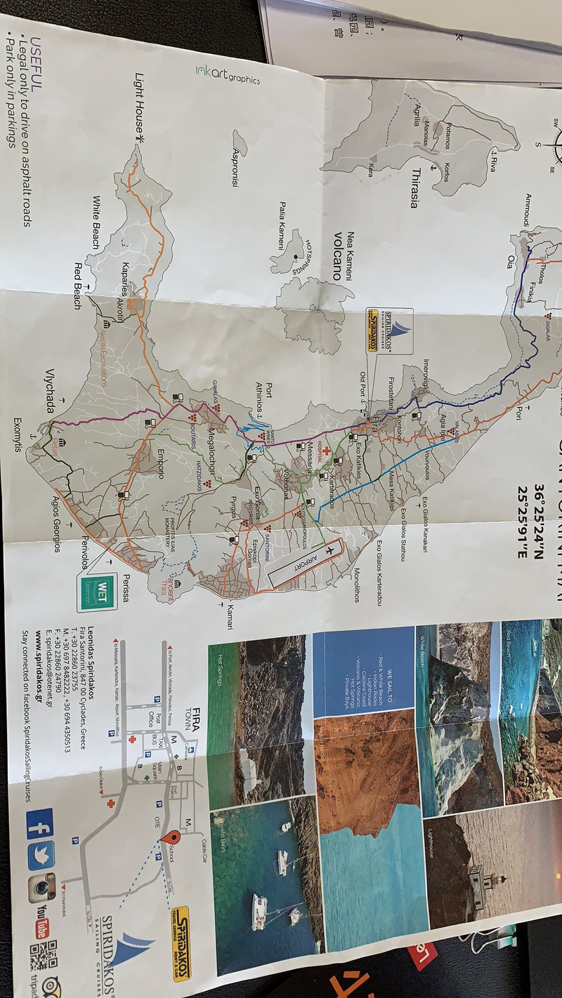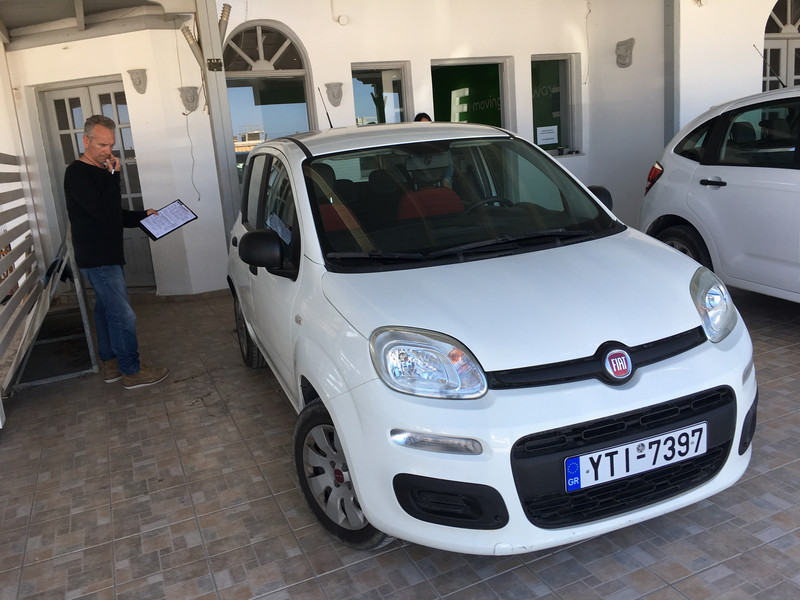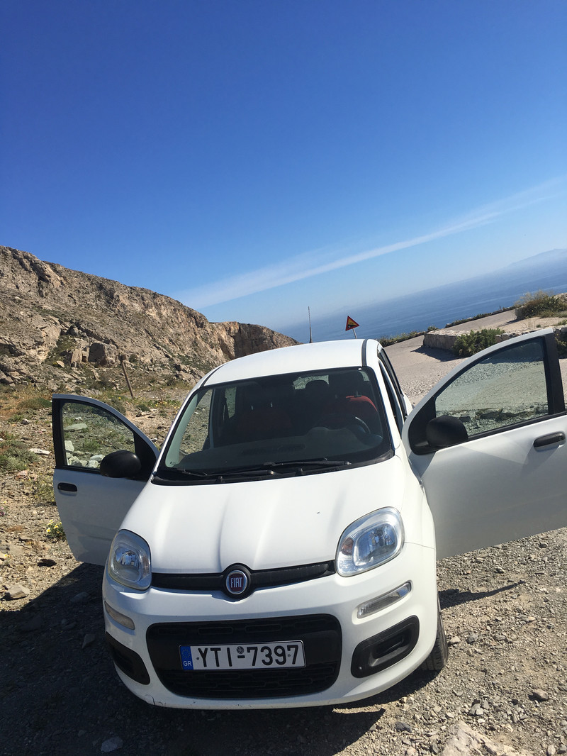 举牌接船,找到自己的名字即可。来接我们的是一辆奔驰小巴啊,车子略旧,但是乘客才三个人,待遇不错啊。 好帅的小巴 从码头上来就是一段坡度极陡的盘山公路,车上俯瞰刚才下船的地方,好高。路上尝试着告诉司机能否让我们在机场下车,因为是先经过机场,才到我设定的目的地(不是我当晚要入住的酒店),但是司机大叔只会希腊语,幸好车上另外一位乘客帮忙英语-希腊翻译沟通,司机经请示老板后,爽快的答应把我们放在机场,一直送到了出发处(圣岛的机场超级小,下文会提到)。按照国内提前预定的订单,菲亚特 Panda手动挡(自动挡少又贵,这里又是非常相信自己的驾驶技术,但是实践表明圣岛坡道又多又陡,技术一般的还是开自动挡或不租车吧,反正LP吓得不敢坐了,可是我也没有不敢开啊,哈哈),返现后500元/3天,从机场走路2分钟就到了租车公司的租车点(之前在网上看到欧洲租车的种种坑,所以也是特意留意拍照作为凭证,这点不得不赞扬美国租车市场的繁荣发达),前台大叔找到订单推销一番保险被我拒绝后开始验车。