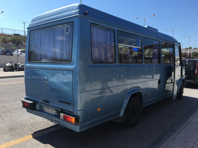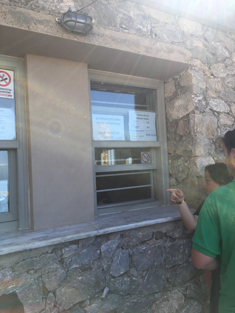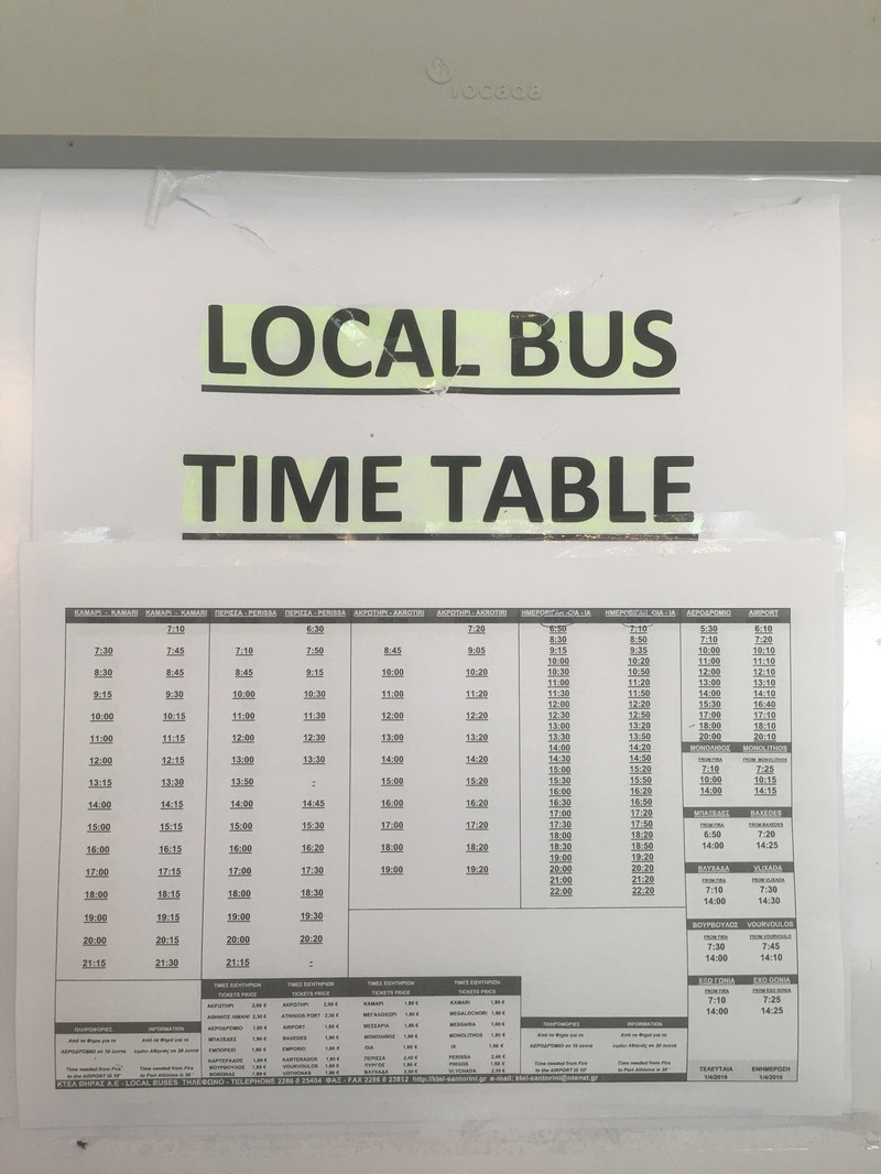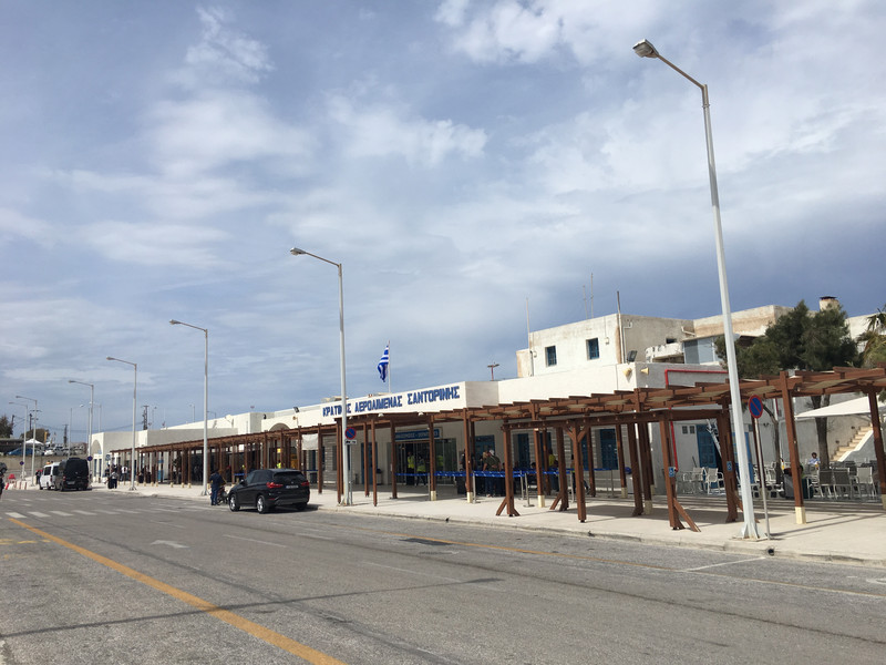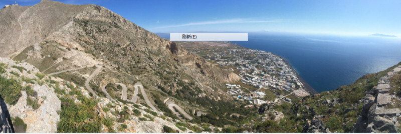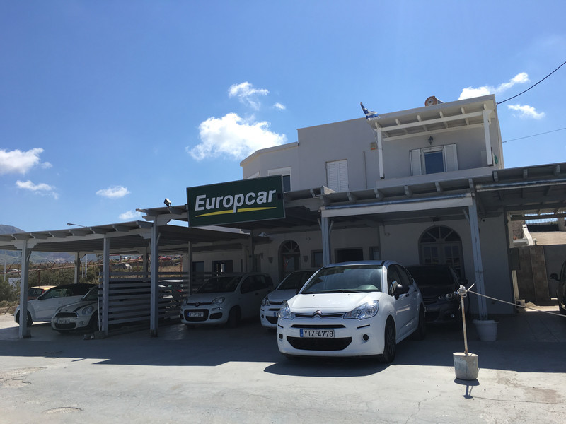 举牌接船,找到自己的名字即可。来接我们的是一辆奔驰小巴啊,车子略旧,但是乘客才三个人,待遇不错啊。 好帅的小巴 从码头上来就是一段坡度极陡的盘山公路,车上俯瞰刚才下船的地方,好高。路上尝试着告诉司机能否让我们在机场下车,因为是先经过机场,才到我设定的目的地(不是我当晚要入住的酒店),但是司机大叔只会希腊语,幸好车上另外一位乘客帮忙英语-希腊翻译沟通,司机经请示老板后,爽快的答应把我们放在机场,一直送到了出发处(圣岛的机场超级小,下文会提到)。按照国内提前预定的订单,菲亚特 Panda手动挡(自动挡少又贵,这里又是非常相信自己的驾驶技术,但是实践表明圣岛坡道又多又陡,技术一般的还是开自动挡或不租车吧,反正LP吓得不敢坐了,可是我也没有不敢开啊,哈哈),返现后500元/3天,从机场走路2分钟就到了租车公司的租车点(之前在网上看到欧洲租车的种种坑,所以也是特意留意拍照作为凭证,这点不得不赞扬美国租车市场的繁荣发达),前台大叔找到订单推销一番保险被我拒绝后开始验车。