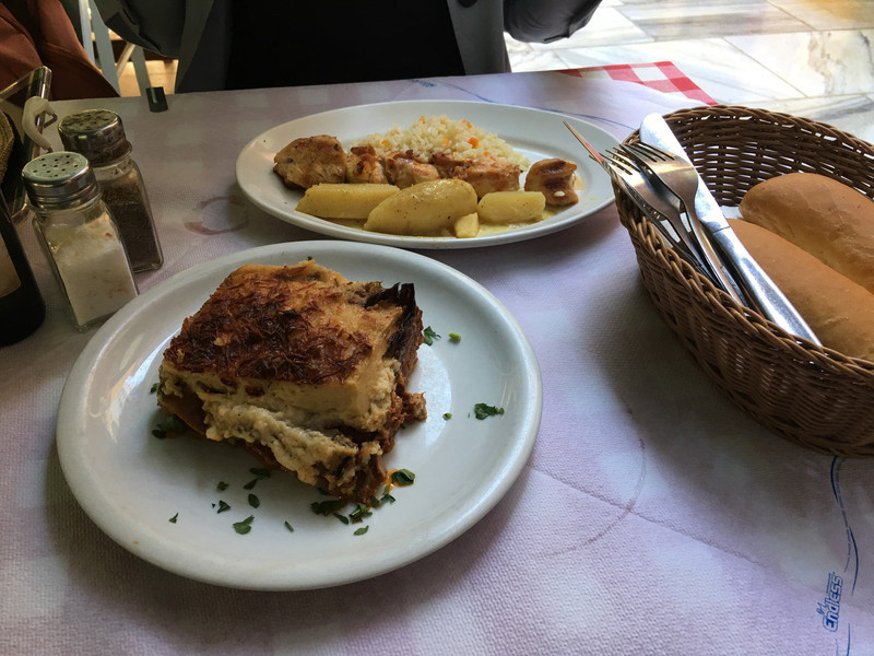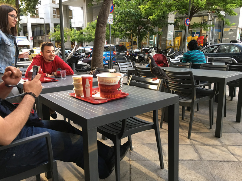 快餐店的卷饼+可乐,5欧 希腊特色饮食卷饼、肉串,每盘10欧,共20欧 菲力牛排14欧,很大,一个人吃不完 希腊特色菜穆沙卡和烤肠鸡肉饭,共20欧 吃中餐的地方,DZDP上4.5颗星,一份盖浇饭7-8欧左右 街头很多鸽子,在等客人剩下的食物雅典城市中心主要景点2天时间足以逛完,再偏远的地方因为交通、治安等也没必要去啦。5月11号早上6点就从酒店步行10分钟到上面提到的Monastiraki站坐地铁到港口乘船去圣托里尼岛啦(这是在雅典唯一坐的一次地铁,也是一直是最担心的安全问题,网上好多经验分享都提到雅典地铁的安全不是很好,而且又是一大早)。但是乘坐1号线从市中心去Piraeus港口的确是最方便的出行方式,当然除了专车。的士没坐,攻略里说基本都是不打表,讲价的。地铁票的购买方式网上都有,是按乘坐时长购买的:普通票:90分钟票1.4欧元,半票0.6欧元。24小时票4.5欧元。5天票9欧元。有效期内可无限制换乘其它地铁或公交,不包括机场站,不可反向换乘。自助购票机上选择英语界面,按照提示一般都是购买90分钟票(但是去机场的票有另外三种类型票,选择选择标有airport即可)。