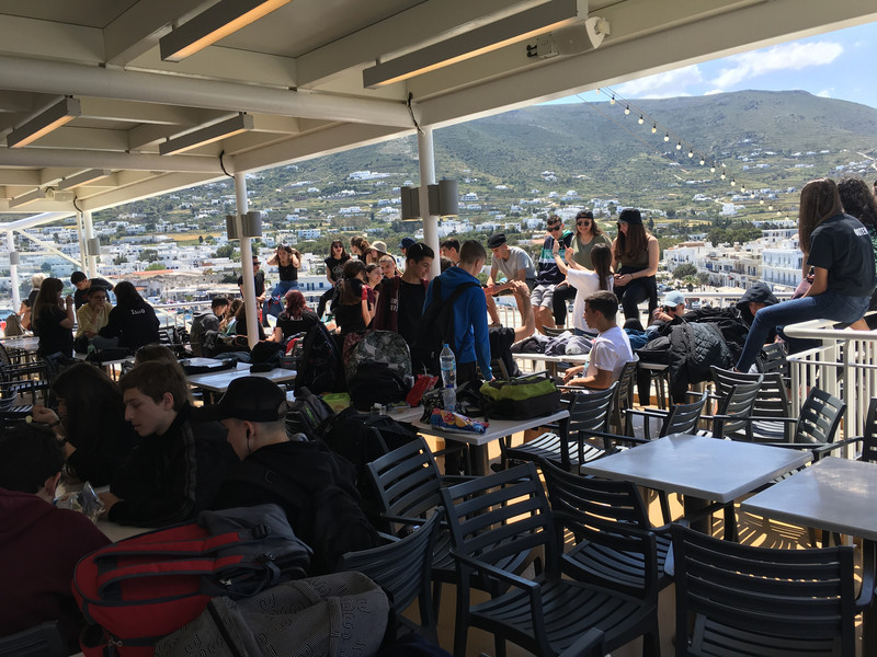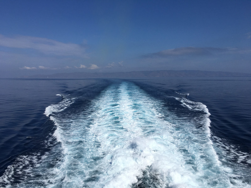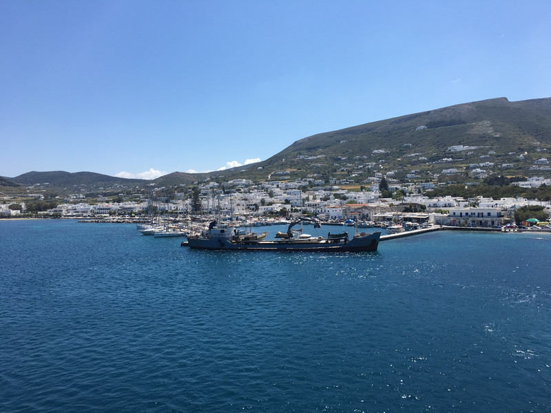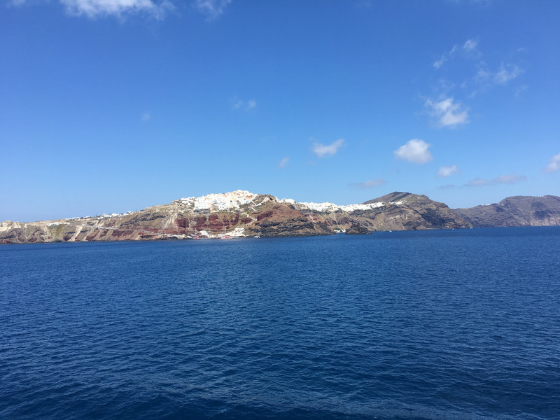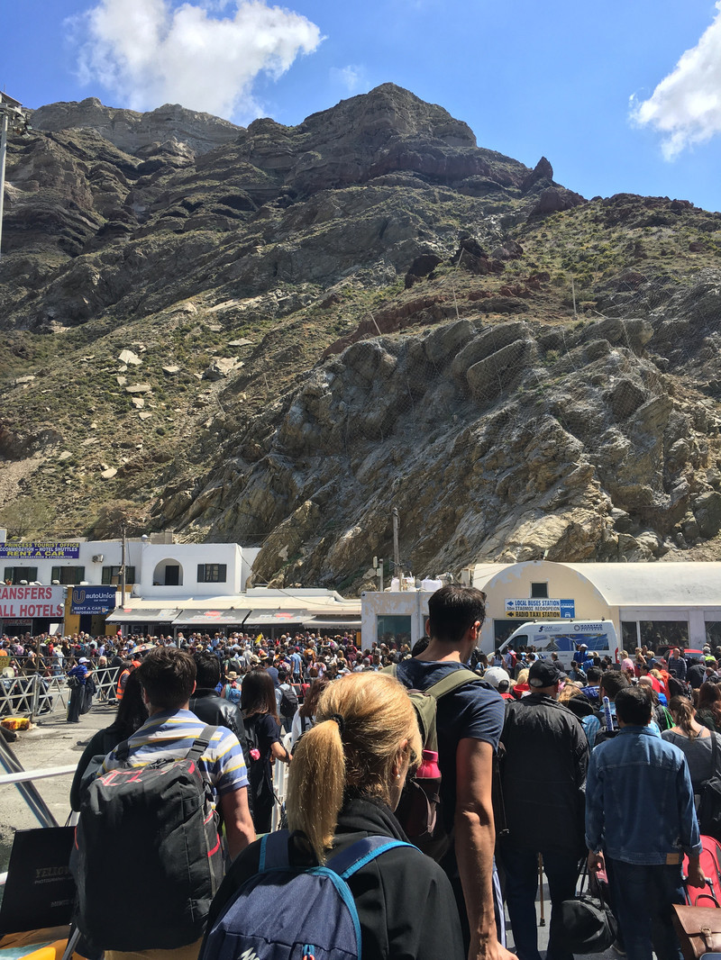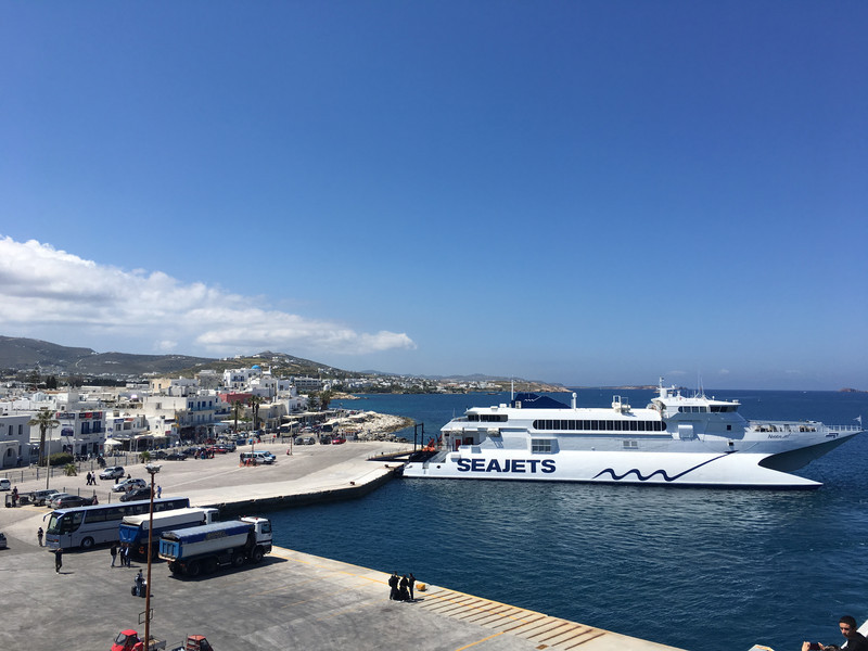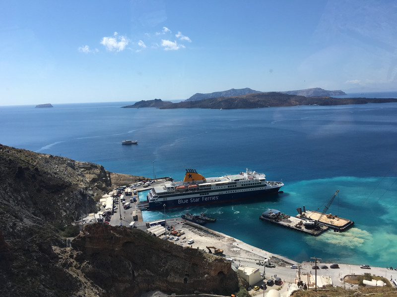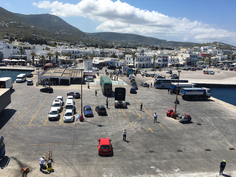 船尾泛起的浪花 顶层甲板上欢快的人群 途径的小岛 中途停靠PAROS岛 中途停靠NAXOS岛 等待上船摆渡的车辆 看到圣托里尼岛啦 下船的时候好多人啊,对面是等待上船回雅典的人们码头到酒店的交通主要靠岛内巴士公交、的士(很少很少)、专车。我们在国内订好了接船,但是只有码头到酒店的产品,因为要去机场取租赁的小小汽车,就把下车地点定在了机场边上最近的酒店。